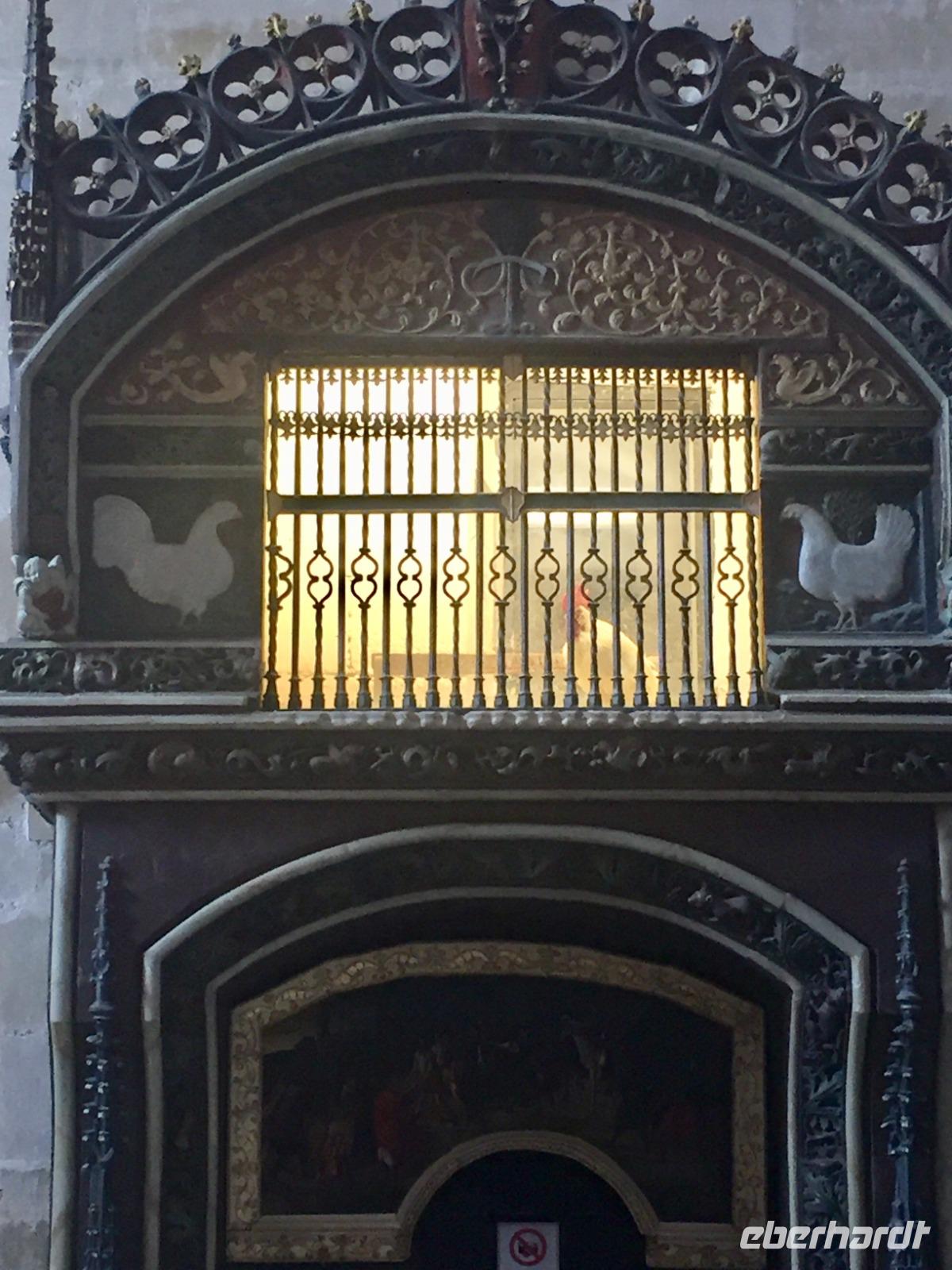 Einer der reizvollsten Orte auf dem Jakobsweg ist Santo Domingo de La Calzada. Natürlich wollten wir uns davon selbst überzeugen. Während der Mittagspause konnten wir unsere ersten Schritte auf dem Jakobsweg gehen. Die Kathedrale überraschte uns mit einer besonderen Eigenart. Sie beherbergt seit 1445 einen Hühnerkäfig, in dem allzeit ein weißer Hahn und eine weiße Henne leben. Dies geht auf eine Legende zurück, die auch im Buch von Hape Kerkeling „Ich bin dann mal weg" nachzulesen ist.