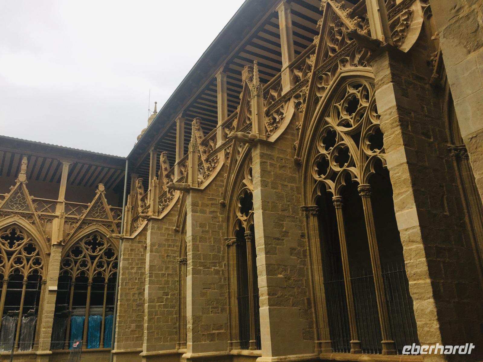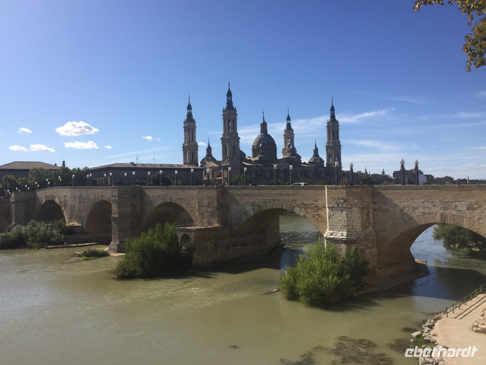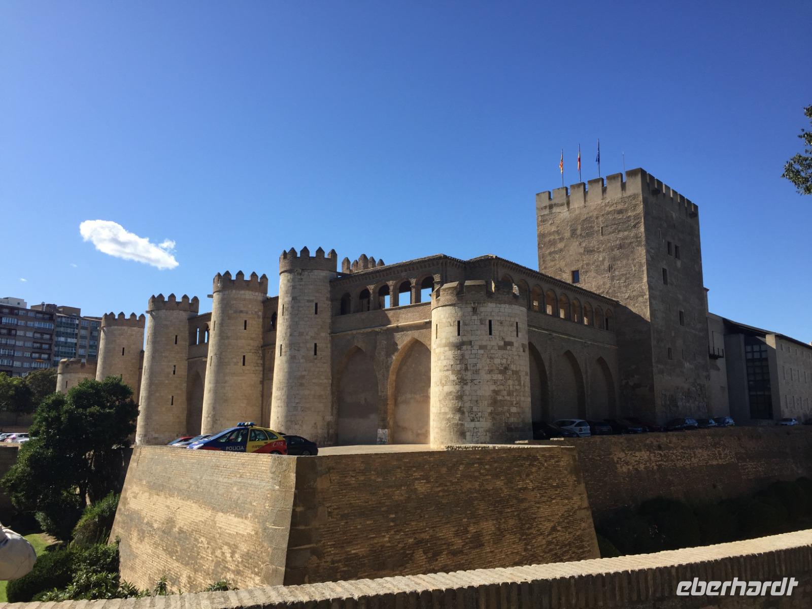 Schon wieder erwartete uns eine Hauptstadt, diesmal der Region Aragonien. Mit 700 000 Einwohnern ist Saragossa (spanisch Zaragoza) die fünftgrößte Stadt Spaniens, nach Madrid, Barcelona, Valencia und Sevilla. Damit ohne Frage ein lohnenswertes Städtereisenziel, es gibt viel zu sehen. Wir konnten in den drei Stunden nur einen kleinen Eindruck gewinnen. Zunächst vom weitläufigen Areal der Weltausstellung im Jahre 2008, die dem Thema Wasser und Nachhaltigkeit gewidmet war. Die Gebäude reflektieren dieses Thema. Entlang breiter Boulevards mit eindrucksvollen Gebäuden erreichen wir schließlich einen kleinen Park, von dem wir den Blick auf das maurische Bauwerk, die Aljaferia, genießen. Hier ist heute das Parlament Aragoniens ansässig.