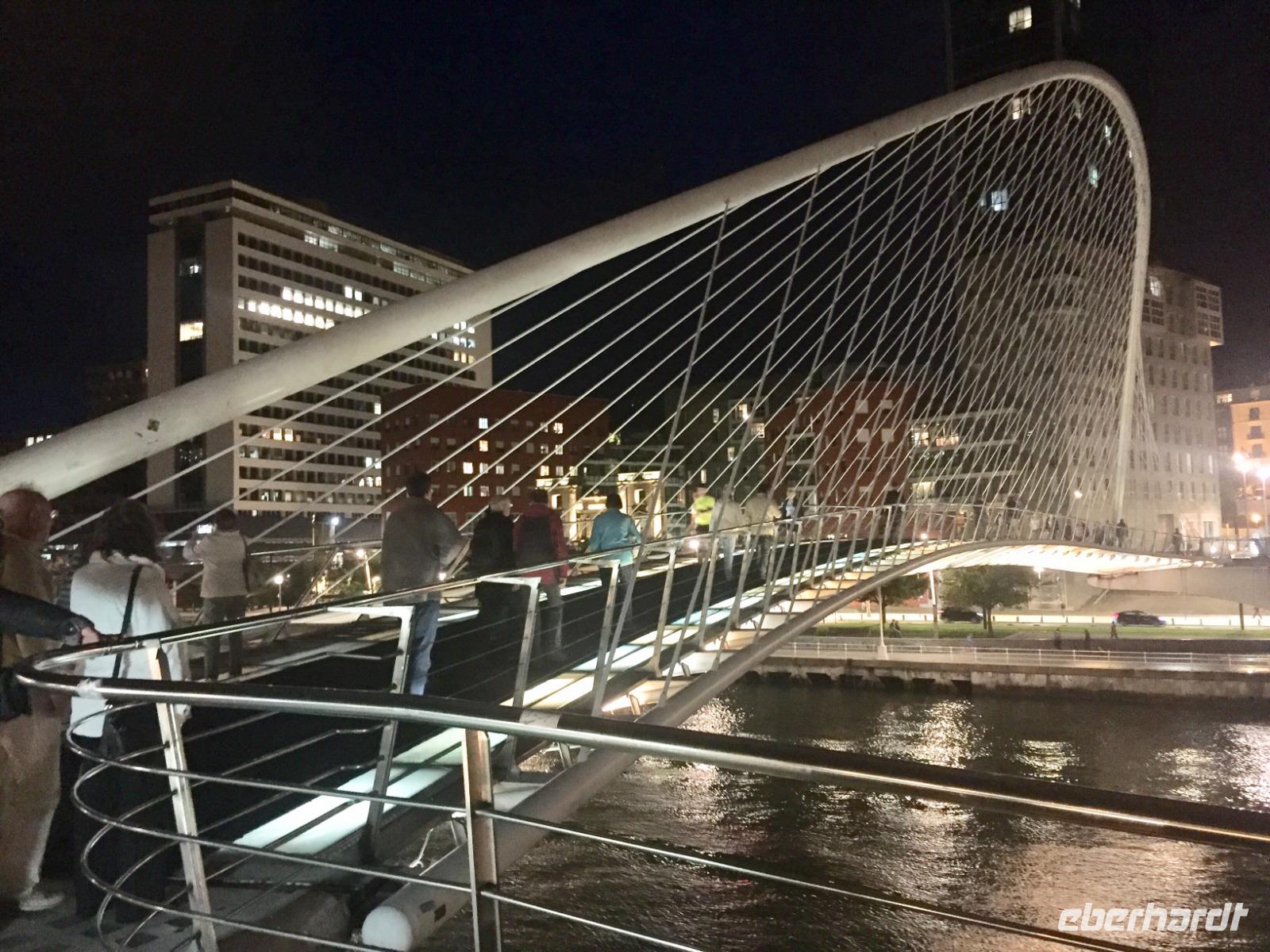 Bilbao erreichten wir am späten Nachmittag. Hier wartete eine weitere Überraschung. Bevor wir zum Hotel fuhren, machten wir Stopp auf dem Monte Artxanda, dem schönsten Aussichtspunkt mit tollem Blick auf Bilbao. Hier hatte Eberhardt travel im noblen Restaurant Txacoli eine Weinprobe des lokalen Tropfens, dem fruchtigen Weißwein Txacoli, begleitet von feinen Pintxos für uns arrangiert. Als Ausgleich für die knappe Weinprobe in Haro.Nach dem Check-in im NH-Hotel Deusto und einer kurzen Pause machten wir uns auf zu einem Spaziergang entlang der Ria de Bilbao, des Flusses Nervión. So konnten wir zur wunderbaren „blauen Stunde" den Blick auf das Guggenheim Museum genießen. Etwas Ausdauer war gefragt, bis wir über die Zubizuri-Brücke des bekannten Architekten Calatrava weiter am Fluss entlang schließlich die Altstadt erreichten. Auf der Plaza Nueva ließen wir es uns schmecken. Per Taxi oder wieder zu Fuß ging es zurück zum Hotel. Was für ein ereignisreicher Tag!