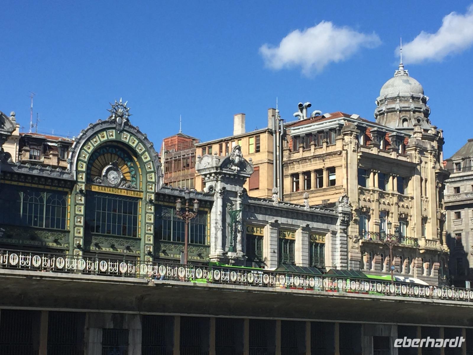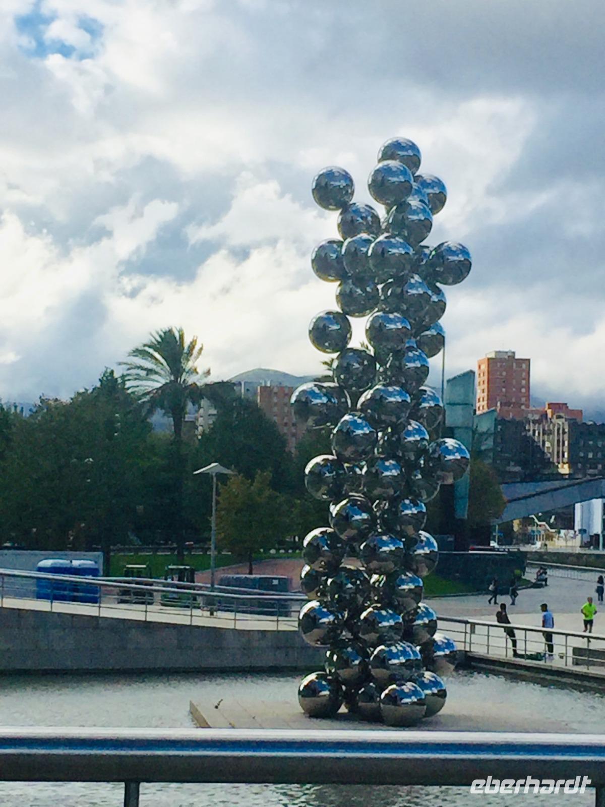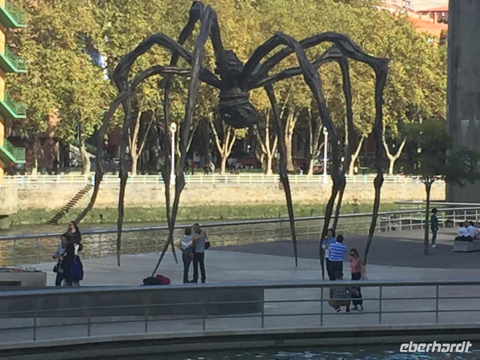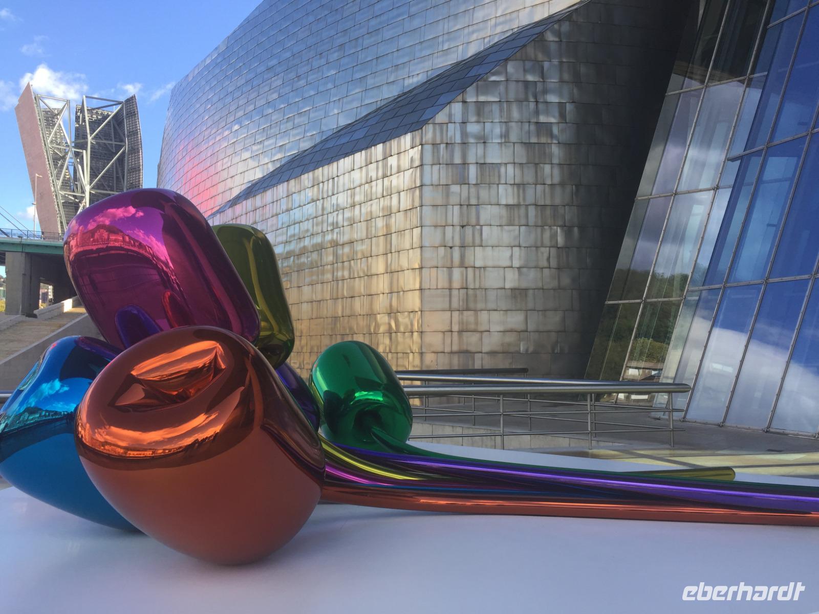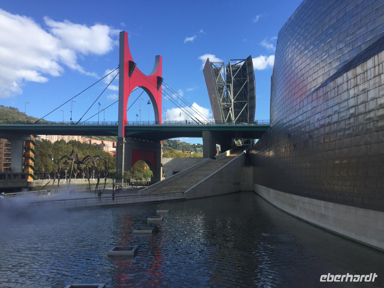 Doch zuerst begaben wir uns heute auf eine kleine Rundfahrt zur Küste, bewunderten die eigenwillige Konstruktion der Biskaya-Brücke mit der Schwebefähre. Entlang der Ria de Bilbao erklärte uns die lokale Führerin Cristina die Verwandlung der Stadt von der einstigen, grauen Industriestadt zur heutigen Kunst- und Architekturhochburg. Vollends überzeugt hat uns die nette Altstadt mit den 7 Gassen, Plaza Nueva, dem Theater Arriaga und der großen Markthalle Mercado de la Ribera.Nach der Mittagspause begaben wir uns ins Mekka der modernen Kunst und Architektur.