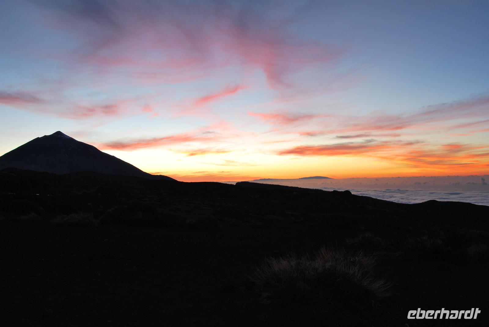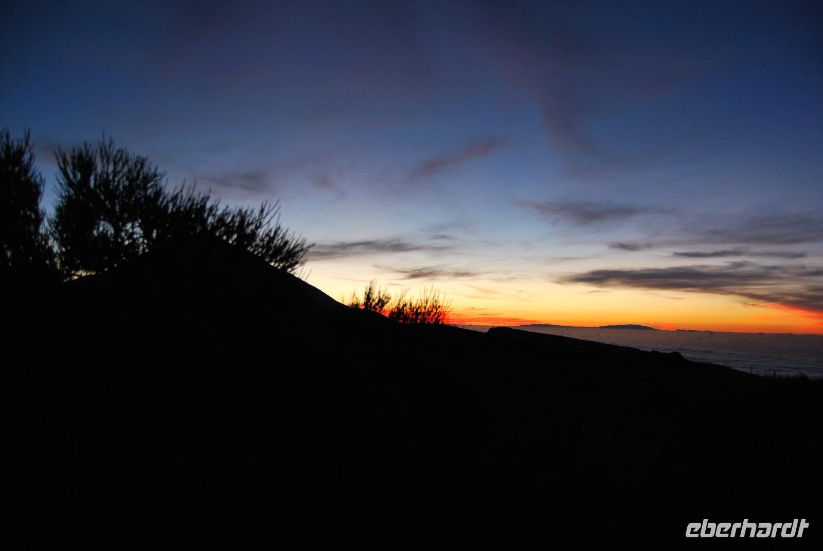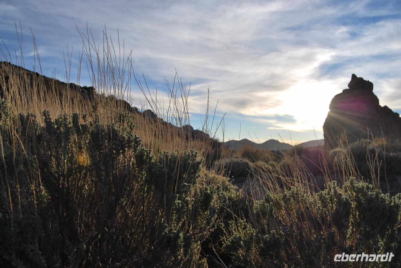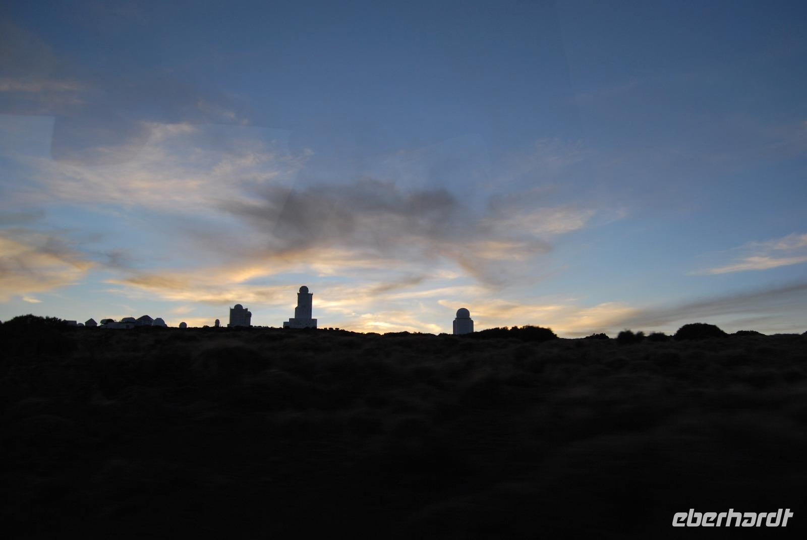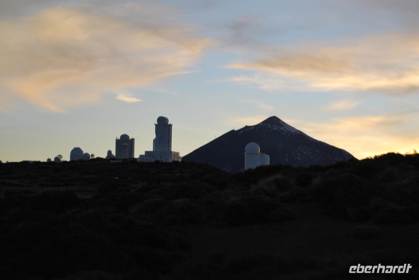 Hoch oben, im sogenannten Kessel, der einen Durchmesser von über 17 Kilometern hat, wirkt es wie eine Mondlandschaft. Zerklüftetes Gestein soweit man gucken kann. Gegen halb sieben erreichten wir die Roques, die als beliebtes Fotomotiv gelten. Die Sonne stand schon sehr tief und zeichnete sehr schönen Schatten auf die Felsen. Dann mussten wir uns ein bisschen beeilen, denn die Sonne war schnell. Wir fuhren in Richtung der Sternwarten, die sich auch im Nationalgebiet befinden. An den Aussichtspunkten Mirador Observatorio del Teide und Mirador Izaña sahen wir wie sich der Himmel verfärbte und der Krater im rötlich-blau-schimmernden Meer versank. Nun war es schon eiskalt geworden und die Finger wurden schon fast zu Eiszapfen. Wir fuhren in das Restaurant Bamby, was uns glücklicherweise noch eine Tasse Kakao, Tee oder Kaffee verkaufte.
