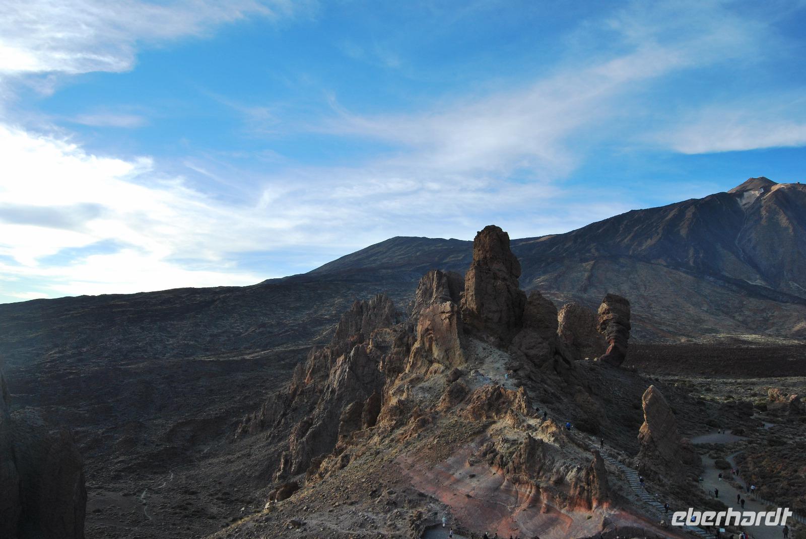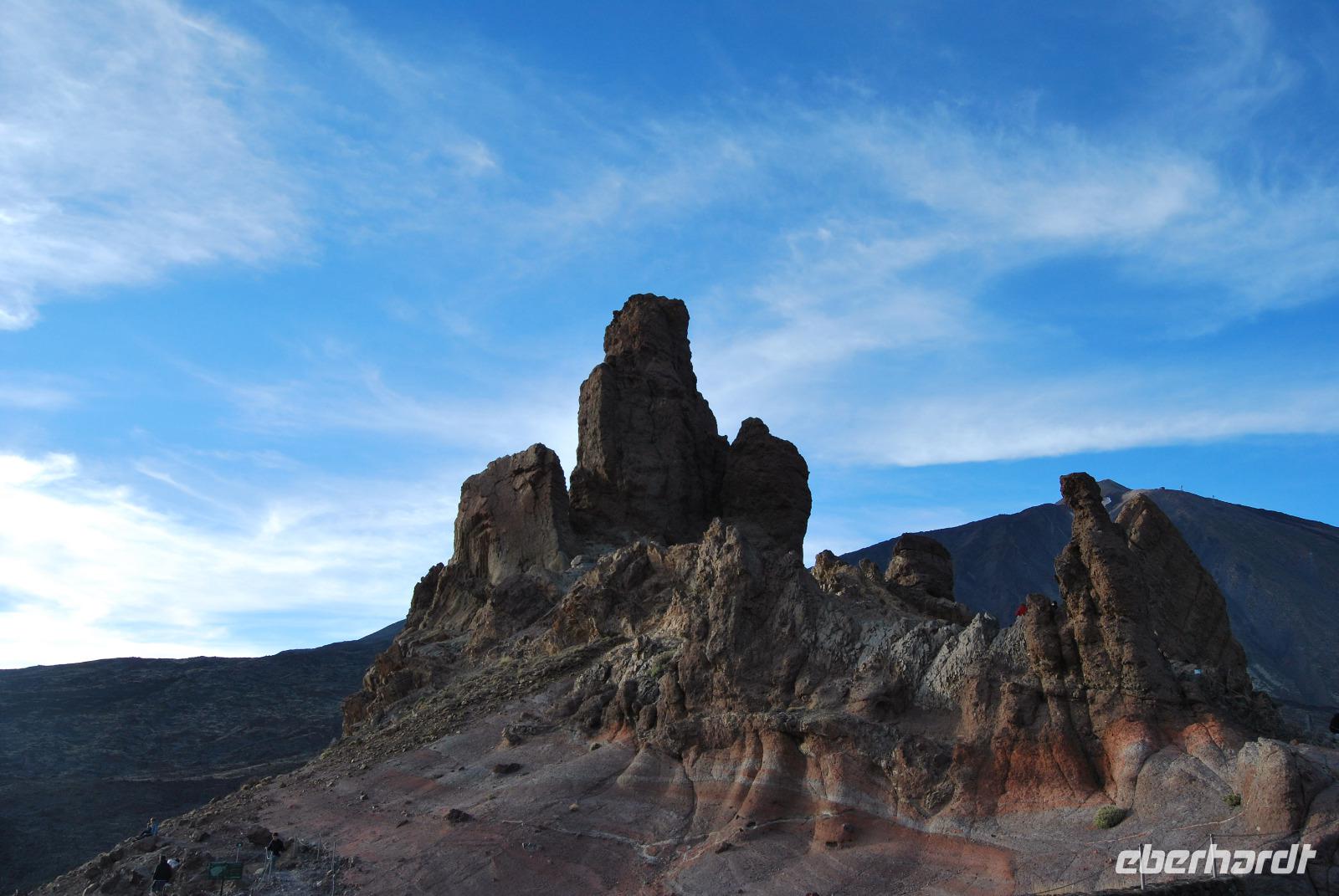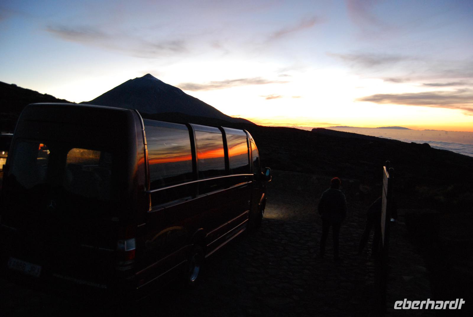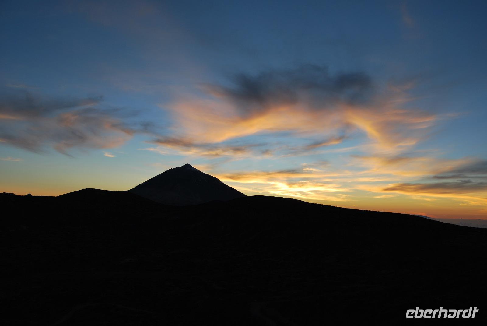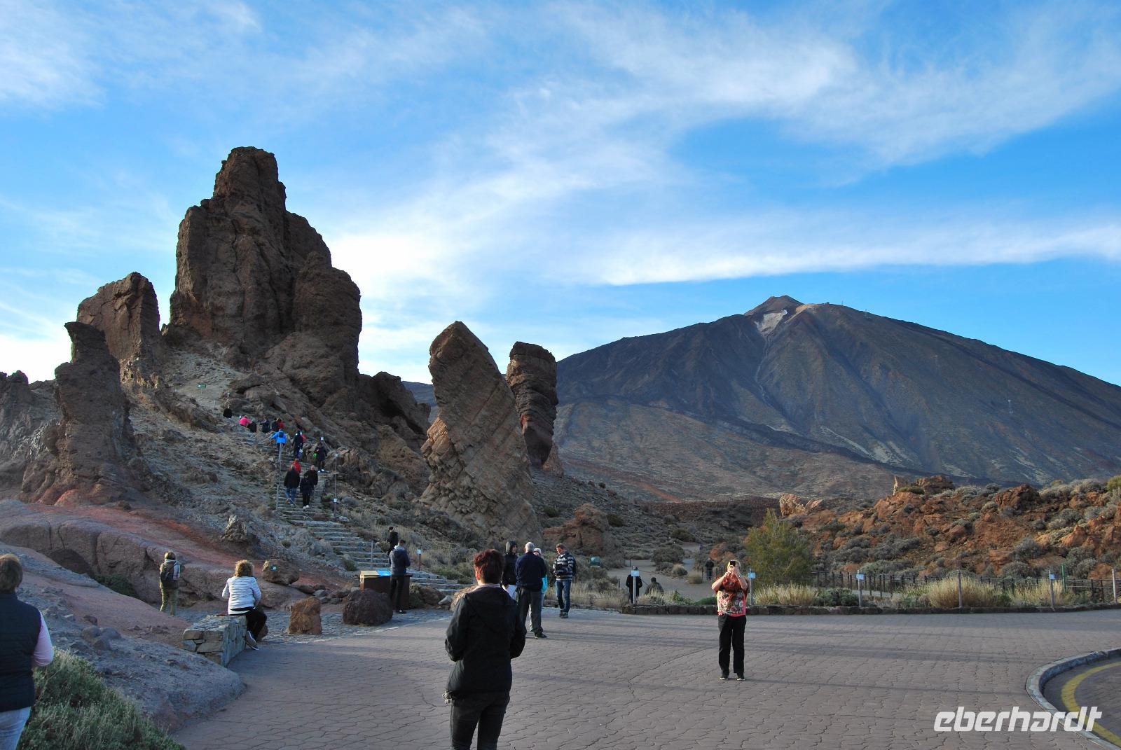 Hoch oben, im sogenannten Kessel, der einen Durchmesser von über 17 Kilometern hat, wirkt es wie eine Mondlandschaft. Zerklüftetes Gestein soweit man gucken kann. Gegen halb sieben erreichten wir die Roques, die als beliebtes Fotomotiv gelten. Die Sonne stand schon sehr tief und zeichnete sehr schönen Schatten auf die Felsen. Dann mussten wir uns ein bisschen beeilen, denn die Sonne war schnell. Wir fuhren in Richtung der Sternwarten, die sich auch im Nationalgebiet befinden. An den Aussichtspunkten Mirador Observatorio del Teide und Mirador Izaña sahen wir wie sich der Himmel verfärbte und der Krater im rötlich-blau-schimmernden Meer versank. Nun war es schon eiskalt geworden und die Finger wurden schon fast zu Eiszapfen. Wir fuhren in das Restaurant Bamby, was uns glücklicherweise noch eine Tasse Kakao, Tee oder Kaffee verkaufte.