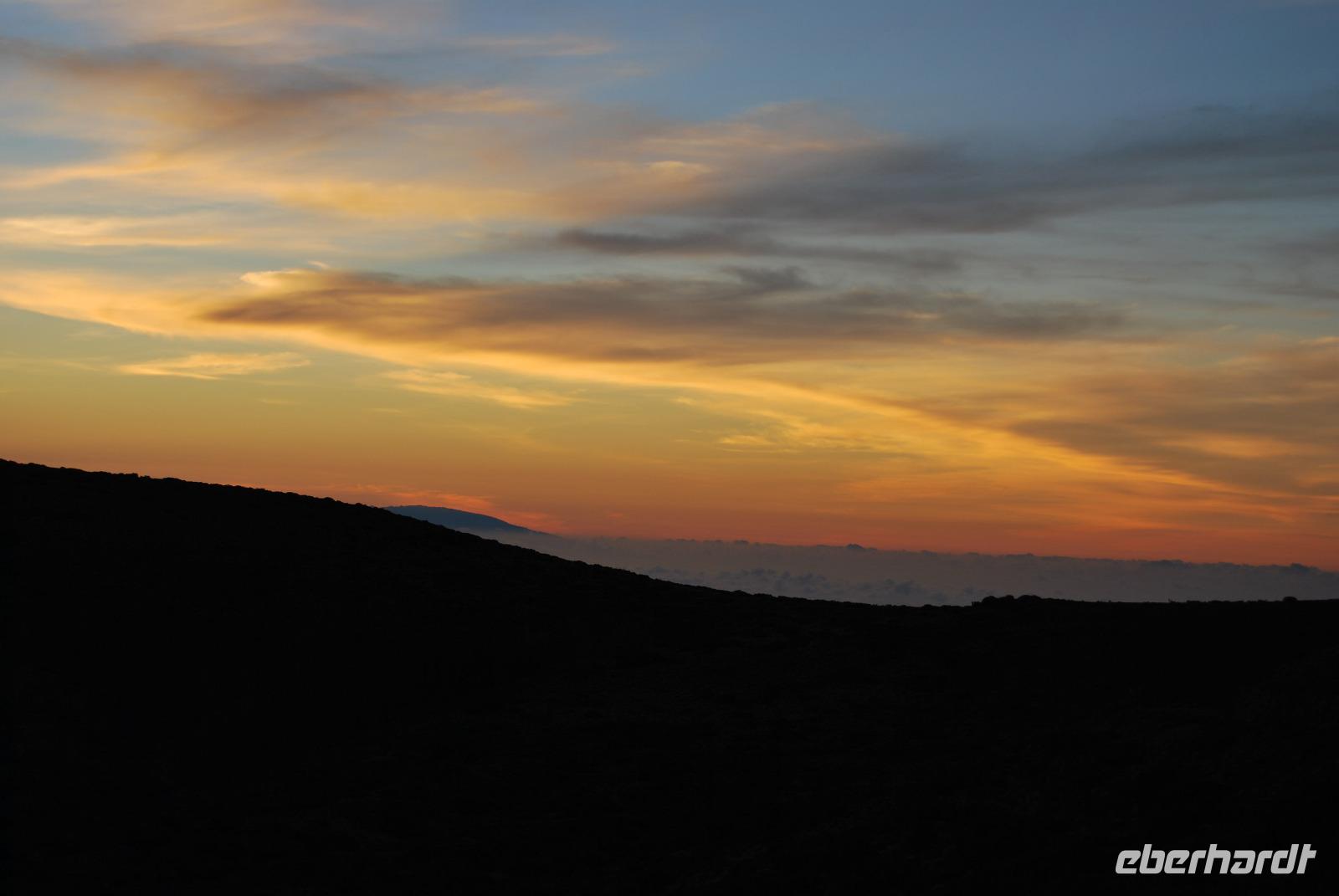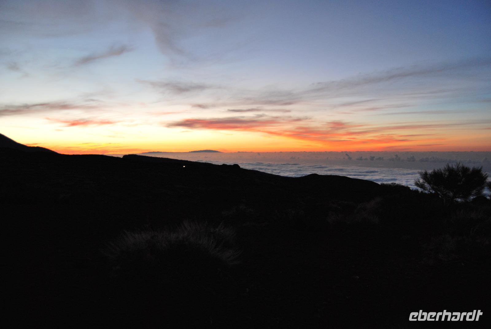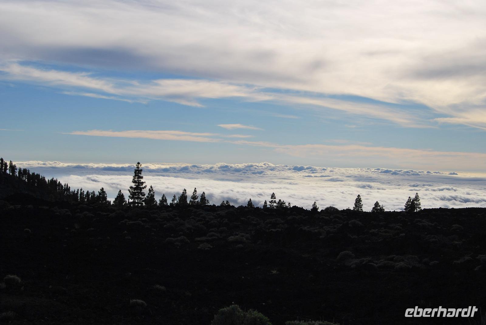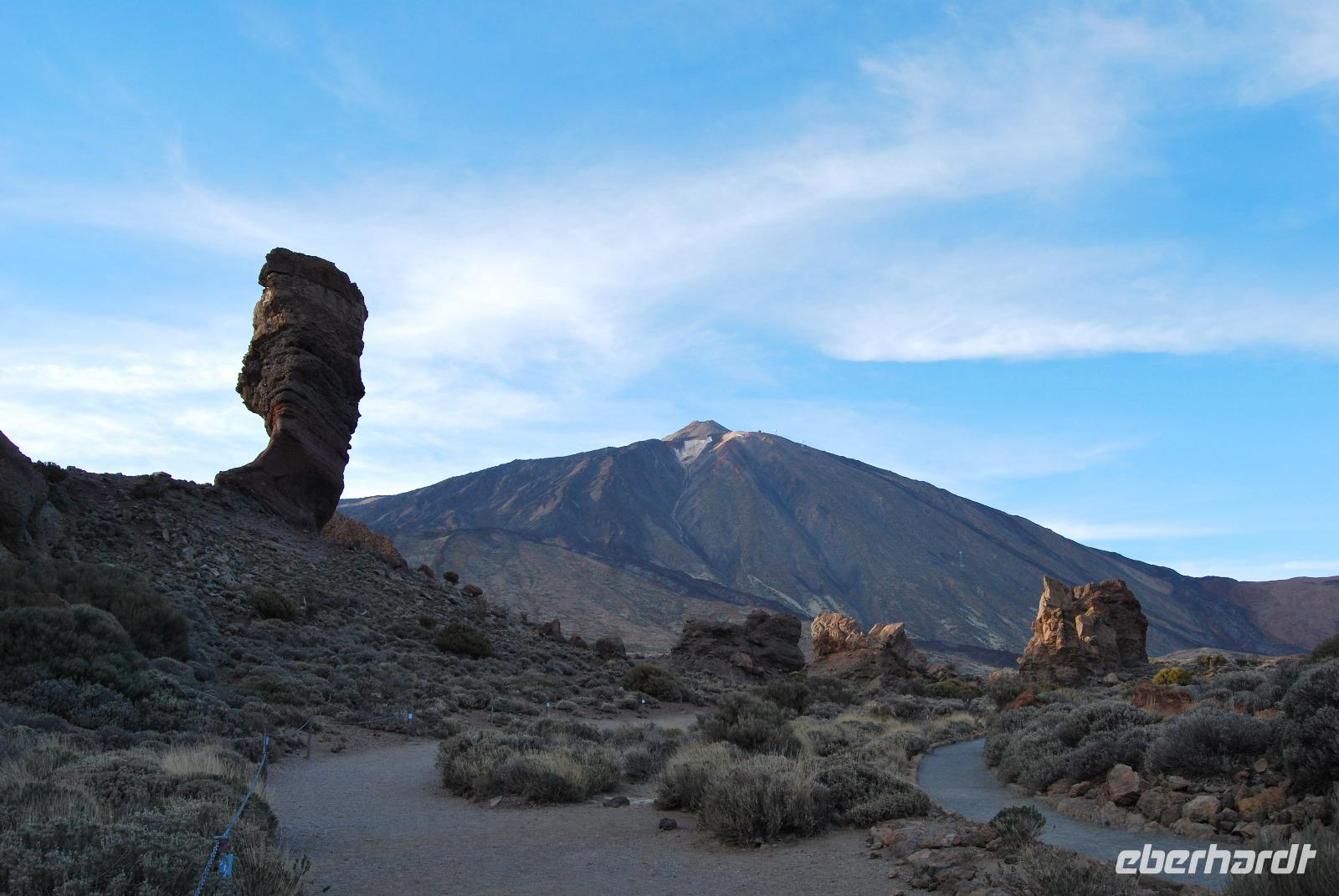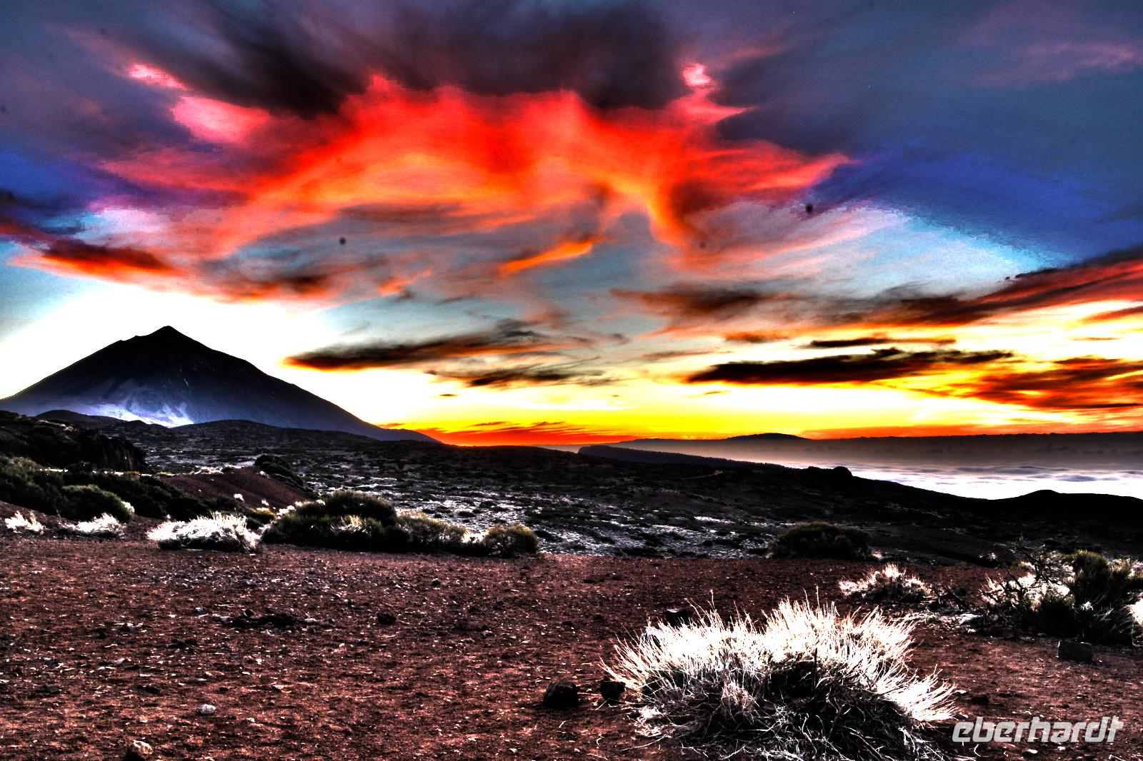 Hoch oben, im sogenannten Kessel, der einen Durchmesser von über 17 Kilometern hat, wirkt es wie eine Mondlandschaft. Zerklüftetes Gestein soweit man gucken kann. Gegen halb sieben erreichten wir die Roques, die als beliebtes Fotomotiv gelten. Die Sonne stand schon sehr tief und zeichnete sehr schönen Schatten auf die Felsen. Dann mussten wir uns ein bisschen beeilen, denn die Sonne war schnell. Wir fuhren in Richtung der Sternwarten, die sich auch im Nationalgebiet befinden. An den Aussichtspunkten Mirador Observatorio del Teide und Mirador Izaña sahen wir wie sich der Himmel verfärbte und der Krater im rötlich-blau-schimmernden Meer versank. Nun war es schon eiskalt geworden und die Finger wurden schon fast zu Eiszapfen. Wir fuhren in das Restaurant Bamby, was uns glücklicherweise noch eine Tasse Kakao, Tee oder Kaffee verkaufte.