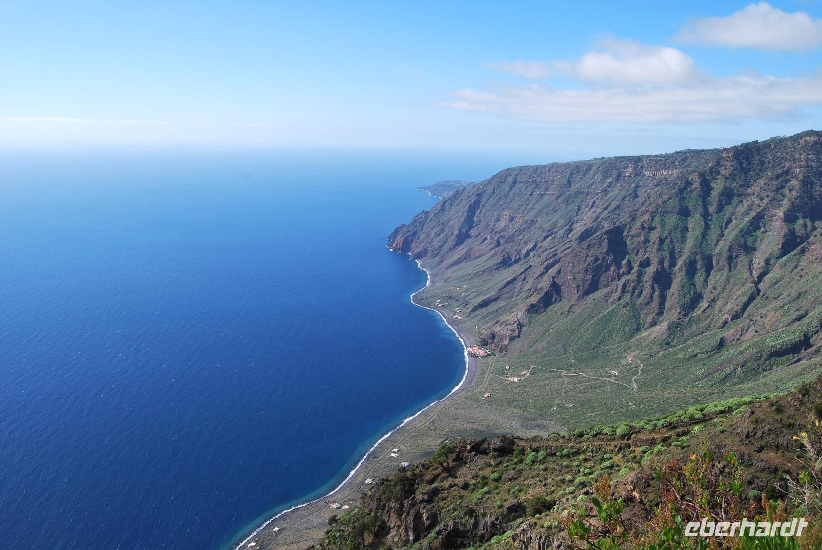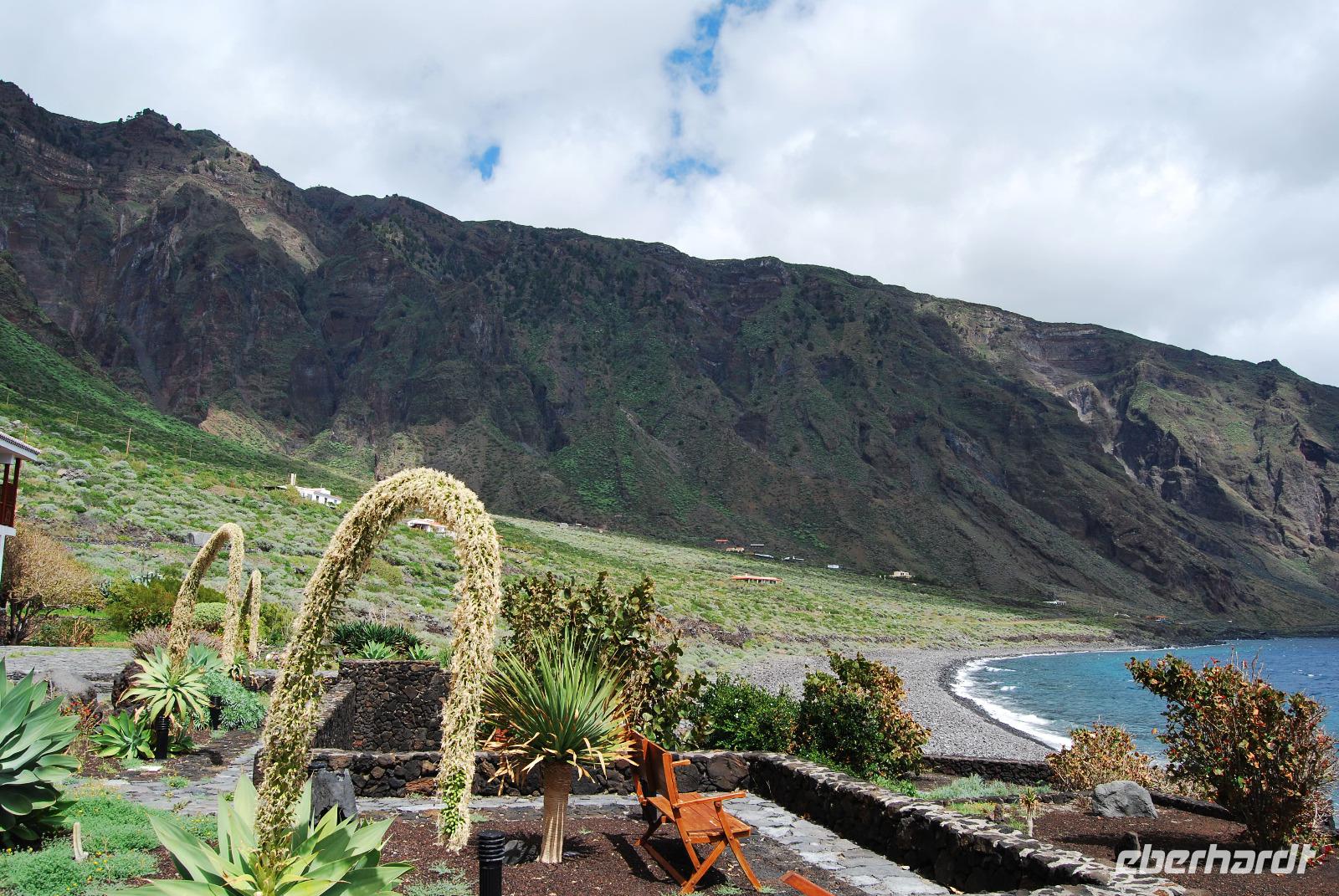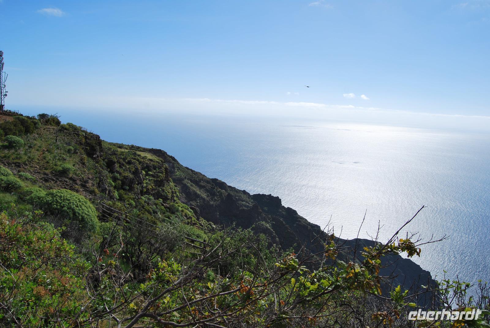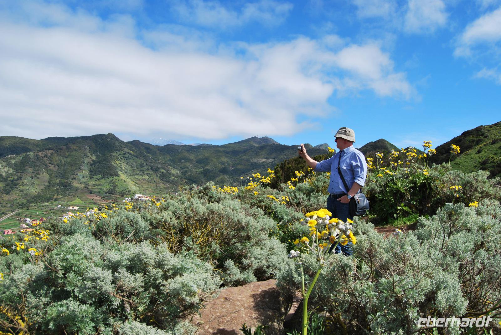 Am Morgen starteten wir unsere Inselrundfahrt in nördlicher Richtung. Erst einmal mussten wir unser Tal verlassen, denn es gab nur einen einzigen Ausgang. Der erste Stopp war dann in der beschaulichen Verwaltungszentrale der Insel, in Valverde. Es ging zum Mirador de Isora und anschließend zum Mirador de Las Playas von wo wir noch einmal unser Hotel von oben sehen konnten und einen herrlichen Blick über das Meer und die Küste hatten. Die Sonne schien hell und die Sicht war ziemlich klar. Der Mirador de Las Playas lag schon in einem kleinen Kiefernwäldchen und Ralf, unser örtlicher Reiseleiter, erklärte und schon einiges über die kanarische Kiefer und einige Pflanzen der Kanaren.