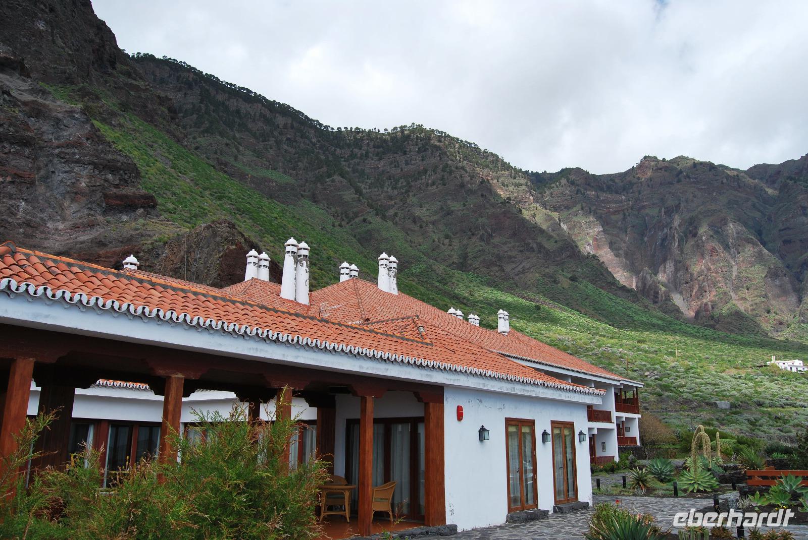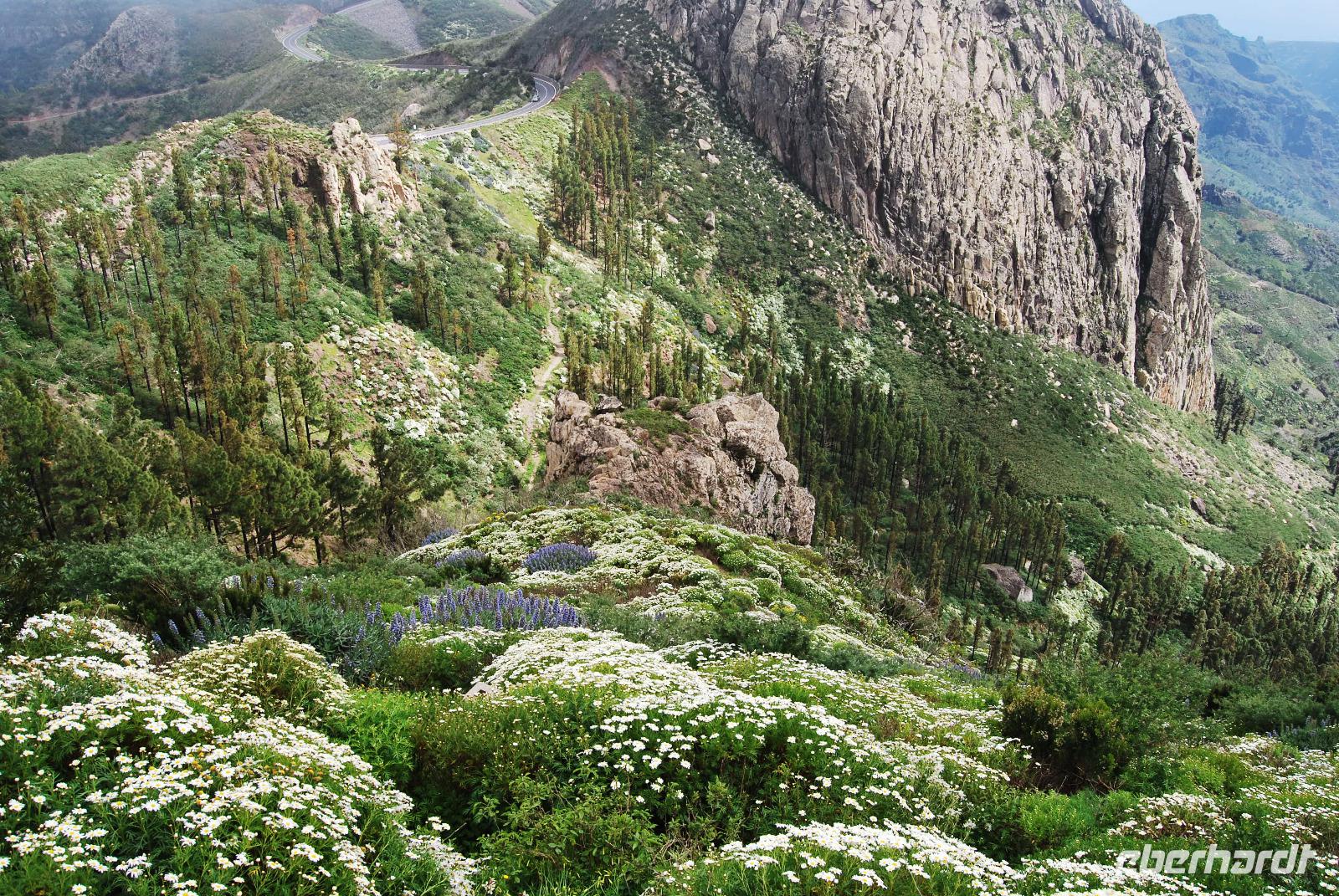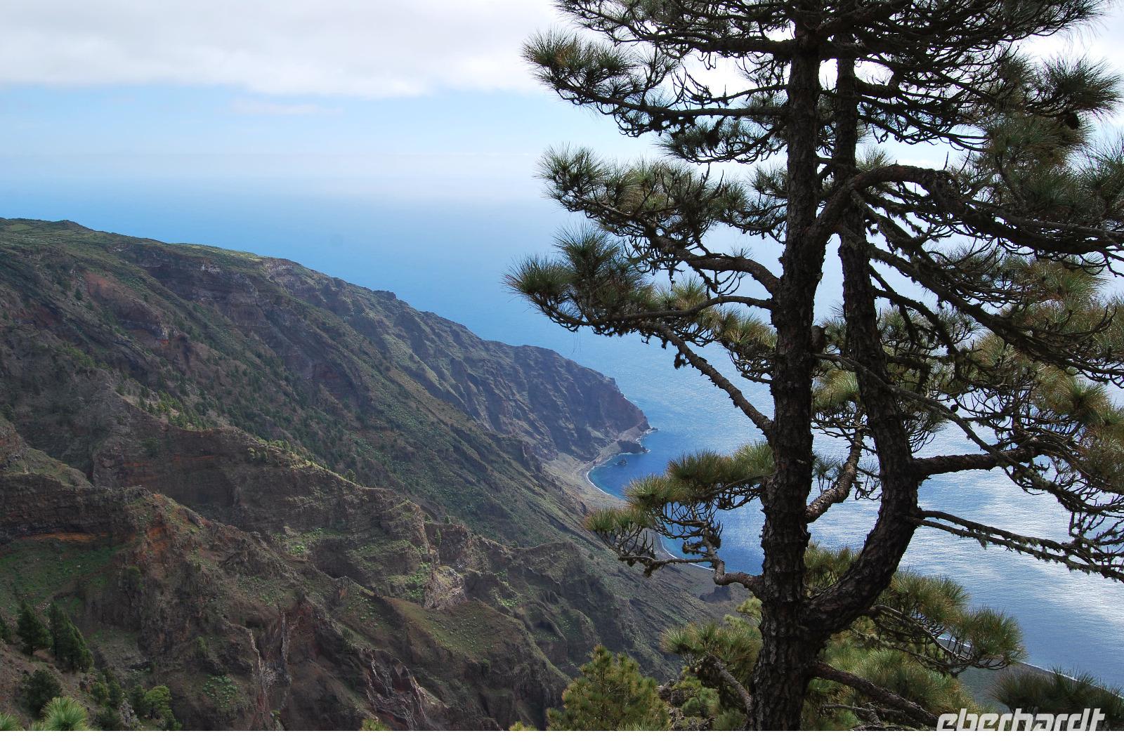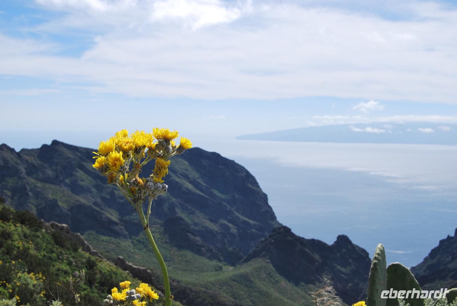 Am Morgen starteten wir unsere Inselrundfahrt in nördlicher Richtung. Erst einmal mussten wir unser Tal verlassen, denn es gab nur einen einzigen Ausgang. Der erste Stopp war dann in der beschaulichen Verwaltungszentrale der Insel, in Valverde. Es ging zum Mirador de Isora und anschließend zum Mirador de Las Playas von wo wir noch einmal unser Hotel von oben sehen konnten und einen herrlichen Blick über das Meer und die Küste hatten. Die Sonne schien hell und die Sicht war ziemlich klar. Der Mirador de Las Playas lag schon in einem kleinen Kiefernwäldchen und Ralf, unser örtlicher Reiseleiter, erklärte und schon einiges über die kanarische Kiefer und einige Pflanzen der Kanaren.