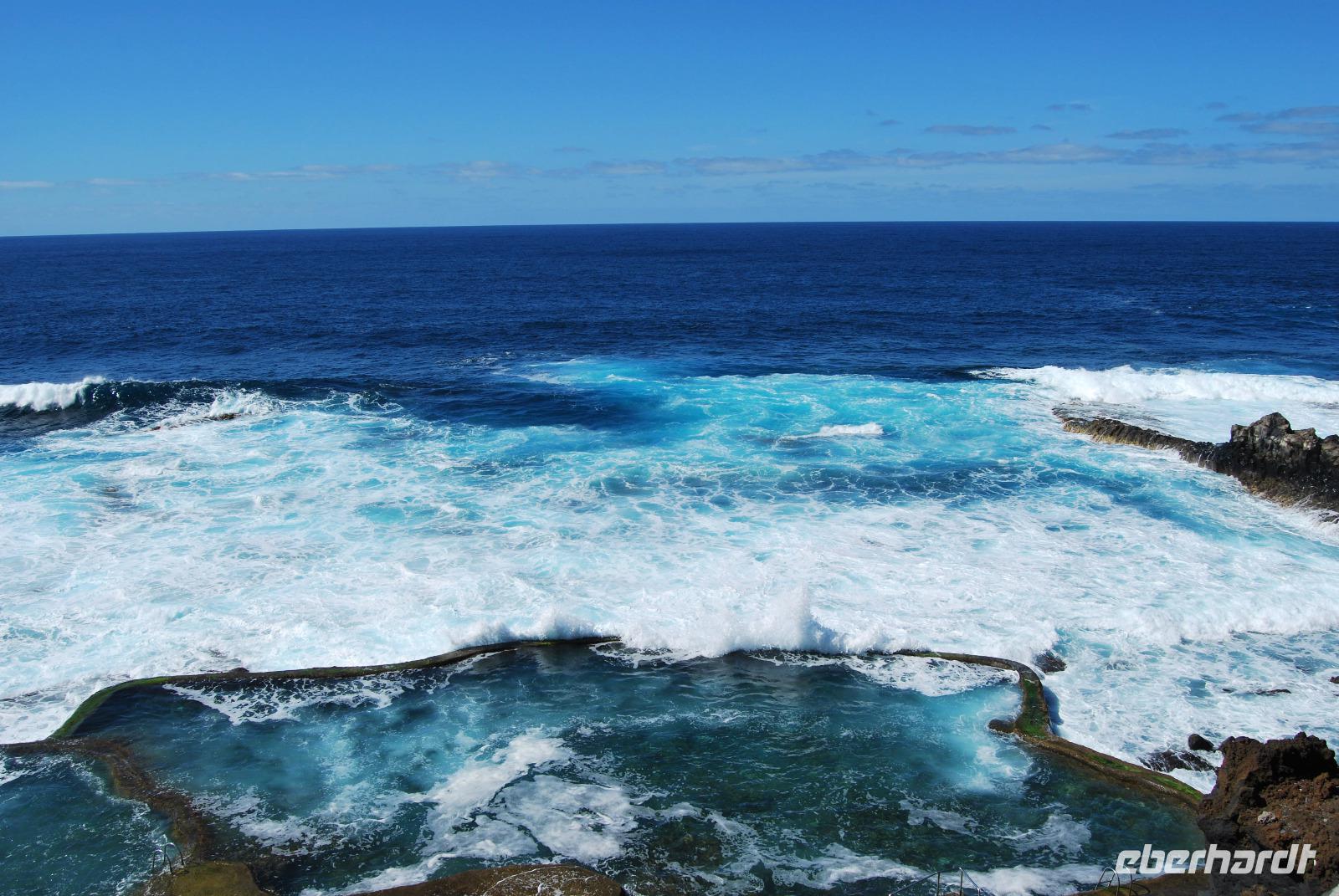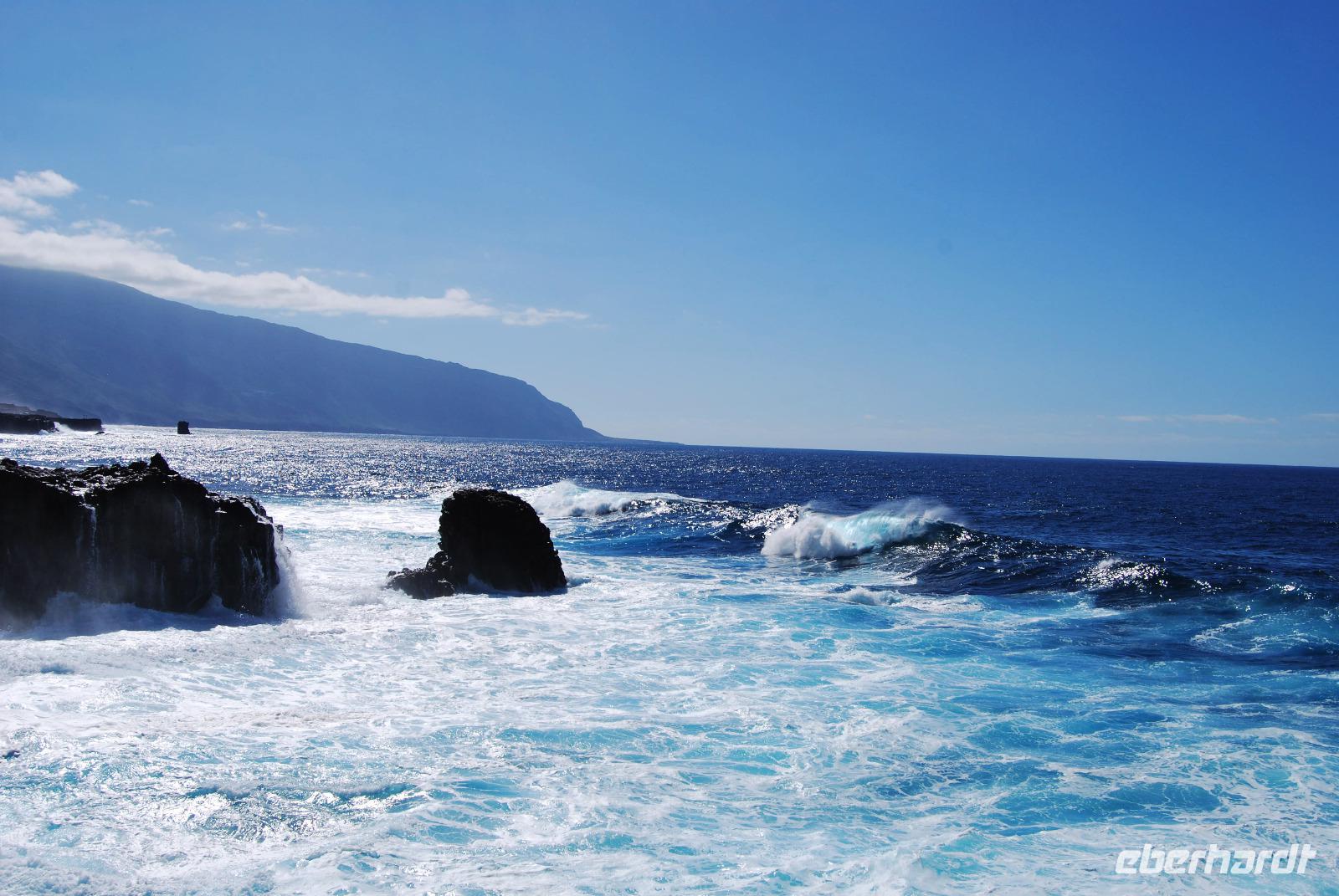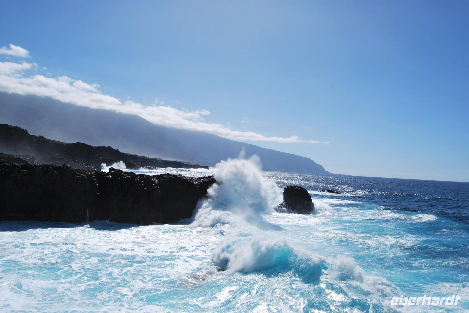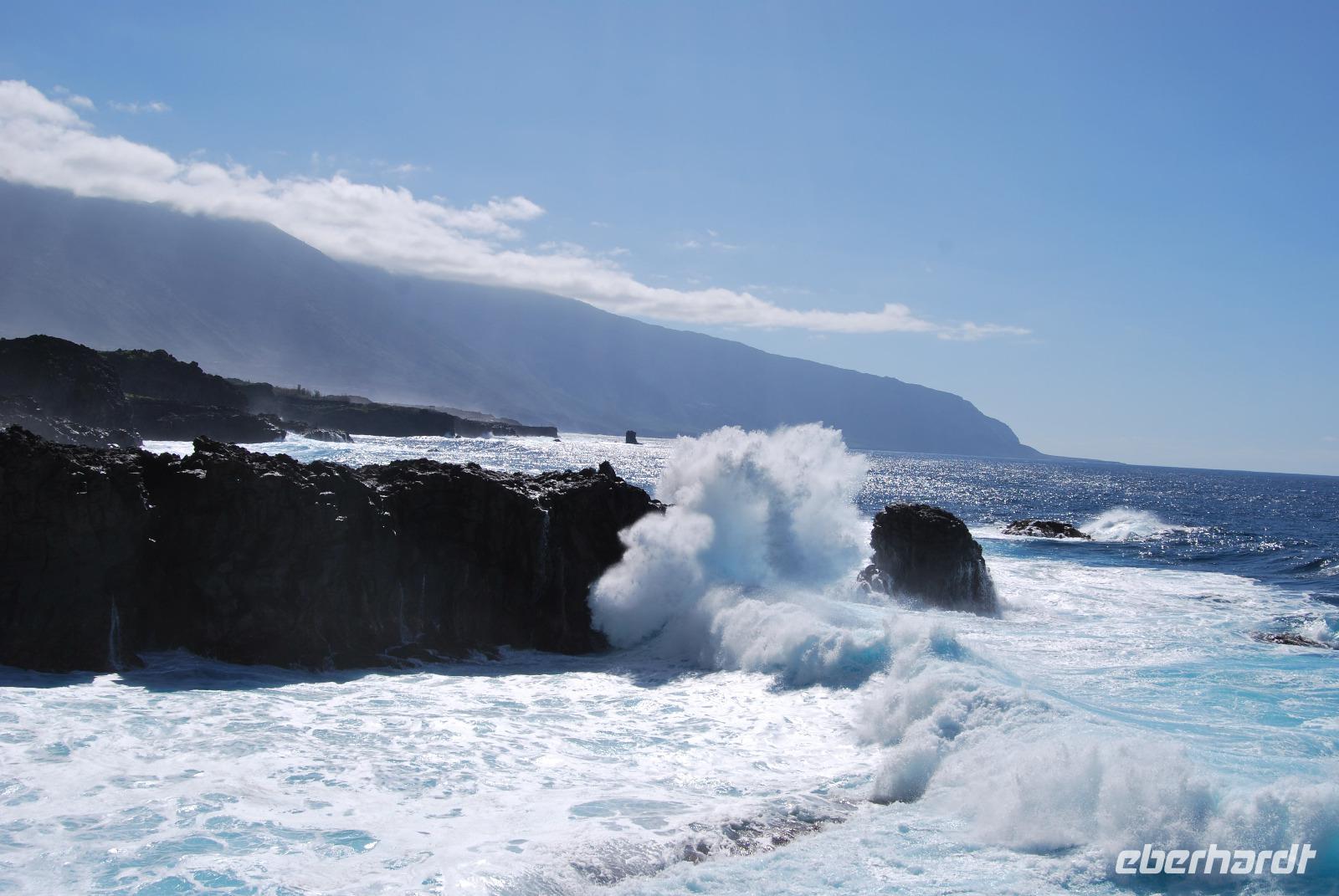 Die Mittagspause bescherte uns dann ein paar Leckereien von der Insel: Salat, Mojo, Garnelen und einiges mehr. Das Restaurant Joapira im Dörfchen Frontera tischte uns auf. Die Rundfahrt über El Hierro führte uns als nächstes zu einer Ananas-Plantage und dem einstigen kleinsten Hotel der Welt mit nur 4 Zimmer. Direkt am Meer gelegen, mit relativ starker Brandung soll schon mancher seekrank geworden sein. Die schroffen Felsen, die blaue See, gewaltige Welle und tosende Brandung beeindruckten uns sehr. Ein schönes Schauspiel, dem man einige Zeit zusehen konnte.