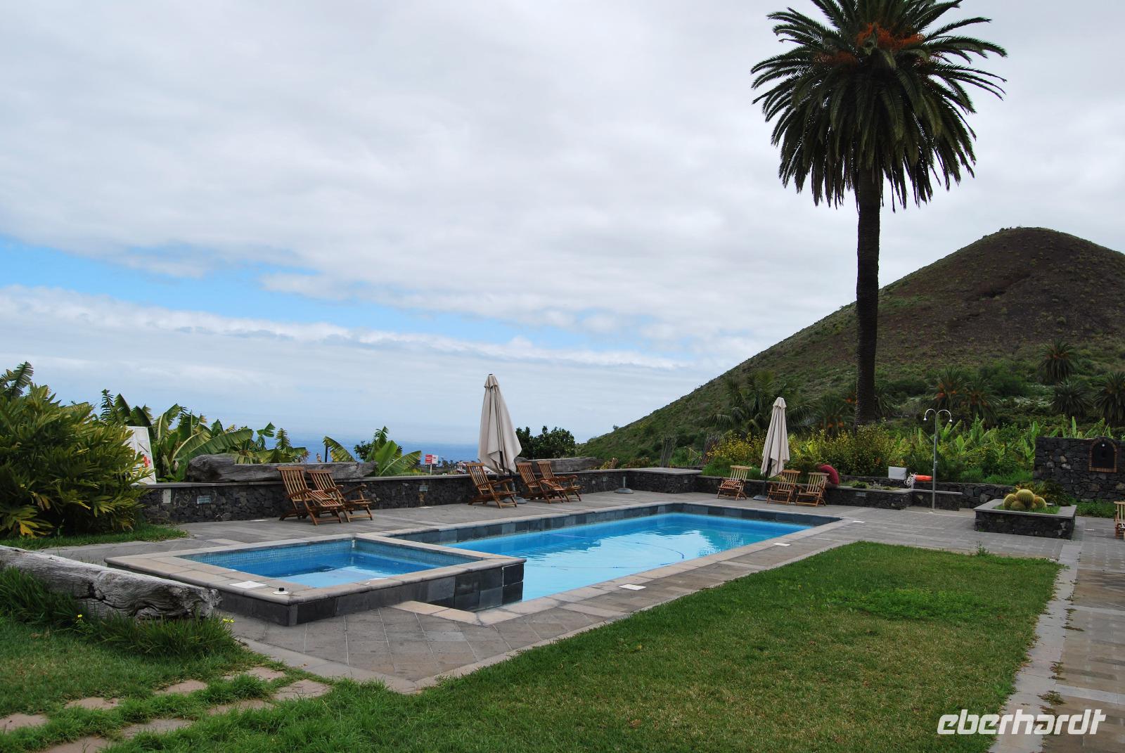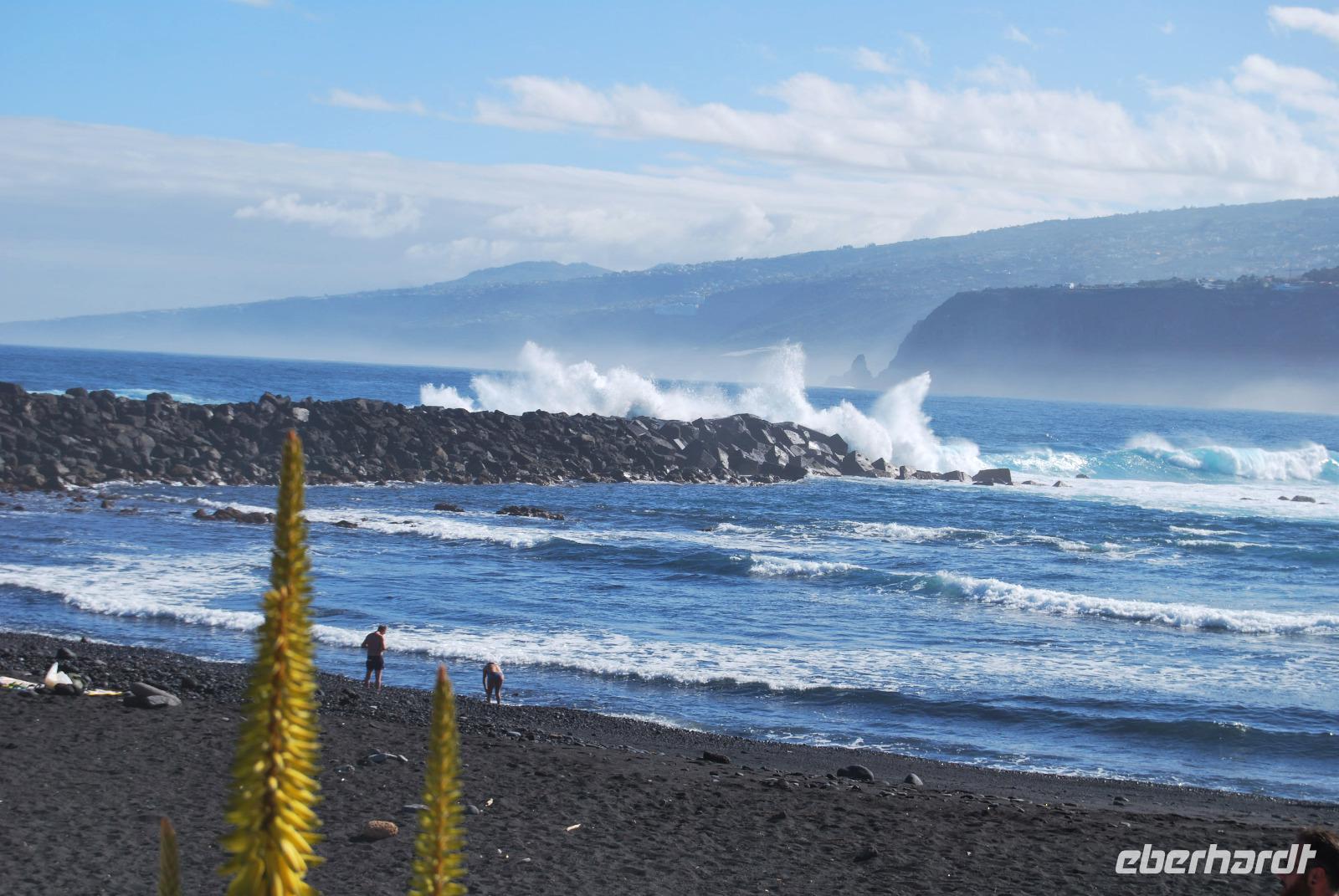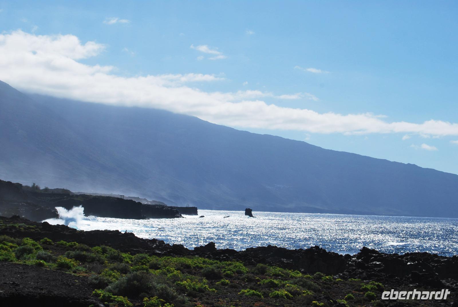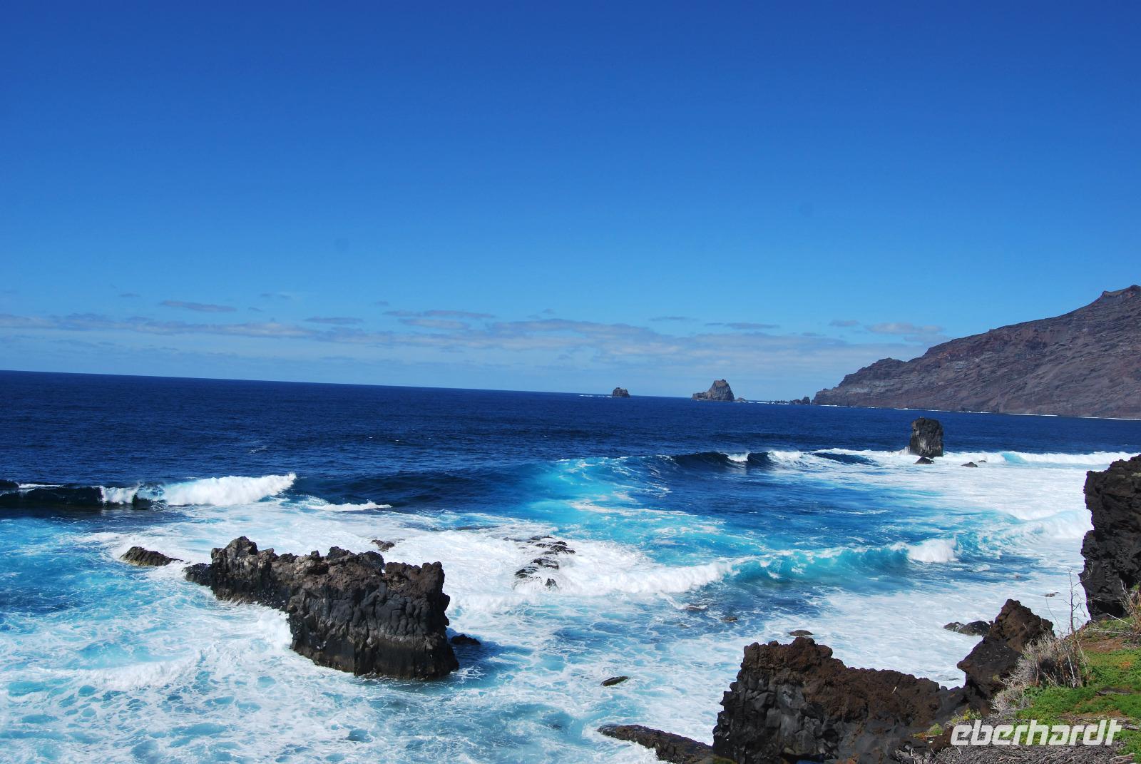Die Mittagspause bescherte uns dann ein paar Leckereien von der Insel: Salat, Mojo, Garnelen und einiges mehr. Das Restaurant Joapira im Dörfchen Frontera tischte uns auf. Die Rundfahrt über El Hierro führte uns als nächstes zu einer Ananas-Plantage und dem einstigen kleinsten Hotel der Welt mit nur 4 Zimmer. Direkt am Meer gelegen, mit relativ starker Brandung soll schon mancher seekrank geworden sein. Die schroffen Felsen, die blaue See, gewaltige Welle und tosende Brandung beeindruckten uns sehr. Ein schönes Schauspiel, dem man einige Zeit zusehen konnte.
