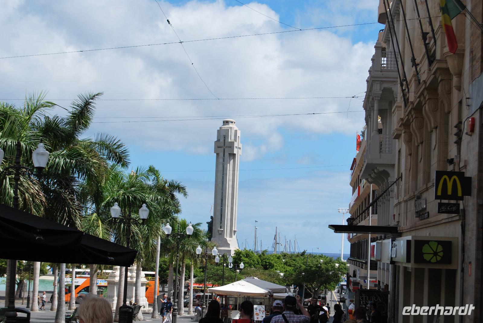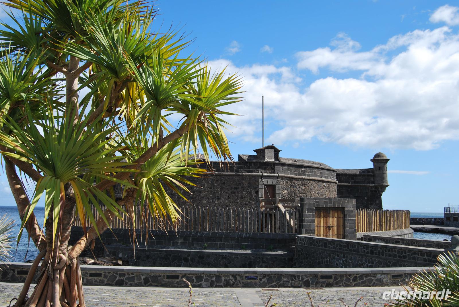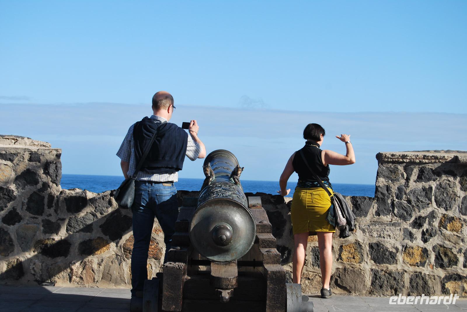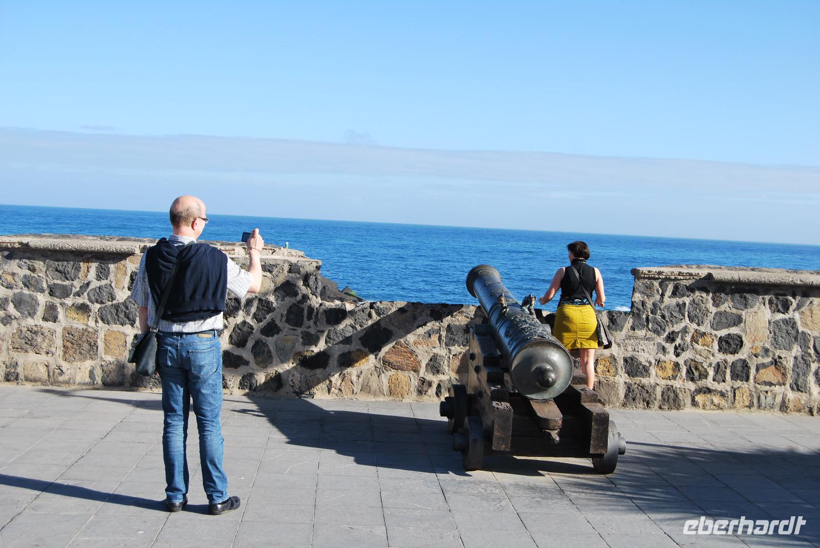 Nach der angenehmen Führung verkosteten wir noch einen Bananenlikör und natürlich ein paar frische kanarische Bio-Bananen. Dann ging es nach Santa Cruz - im Parque Garcia Sanabria begann unser Stadtrundgang. Das lag ganz in der Nähe von dem Hotel, in dem wir die erste Nacht verbrachten. Wir liefen bis zur Plaza el Chicharo, wo auch ein Denkmal des Chicharo-Fisches zu sehen ist. Denn dies ist eine Makrelen-Art die hier besonders gern gegessen und gefangen wird. Deshalb werden die Bewohner von Santa Cruz liebevoll Chicharritos genannt. An der Plaza España legten wir unsere Mittagspause ein und genossen die umliegenden Lokalitäten. Zum Abschluss des heutigen Tages fuhren wir mit dem Bus zum Auditorium von Santa Cruz. Das Wahrzeichen der Stadt wurde ebenfalls von Manrique entworfen und liegt als unverwechselbare weiße Welle direkt am Hafen der Stadt. Nebenan ist noch ein alter Zeitzeuge aus der jungen spanischen Besatzerzeit zu sehen - das Castillo de San Juan von 1643. Einst haben hier zwölf dieser Castillos den damaligen Hafen der Stadt La Laguna beschützt.
