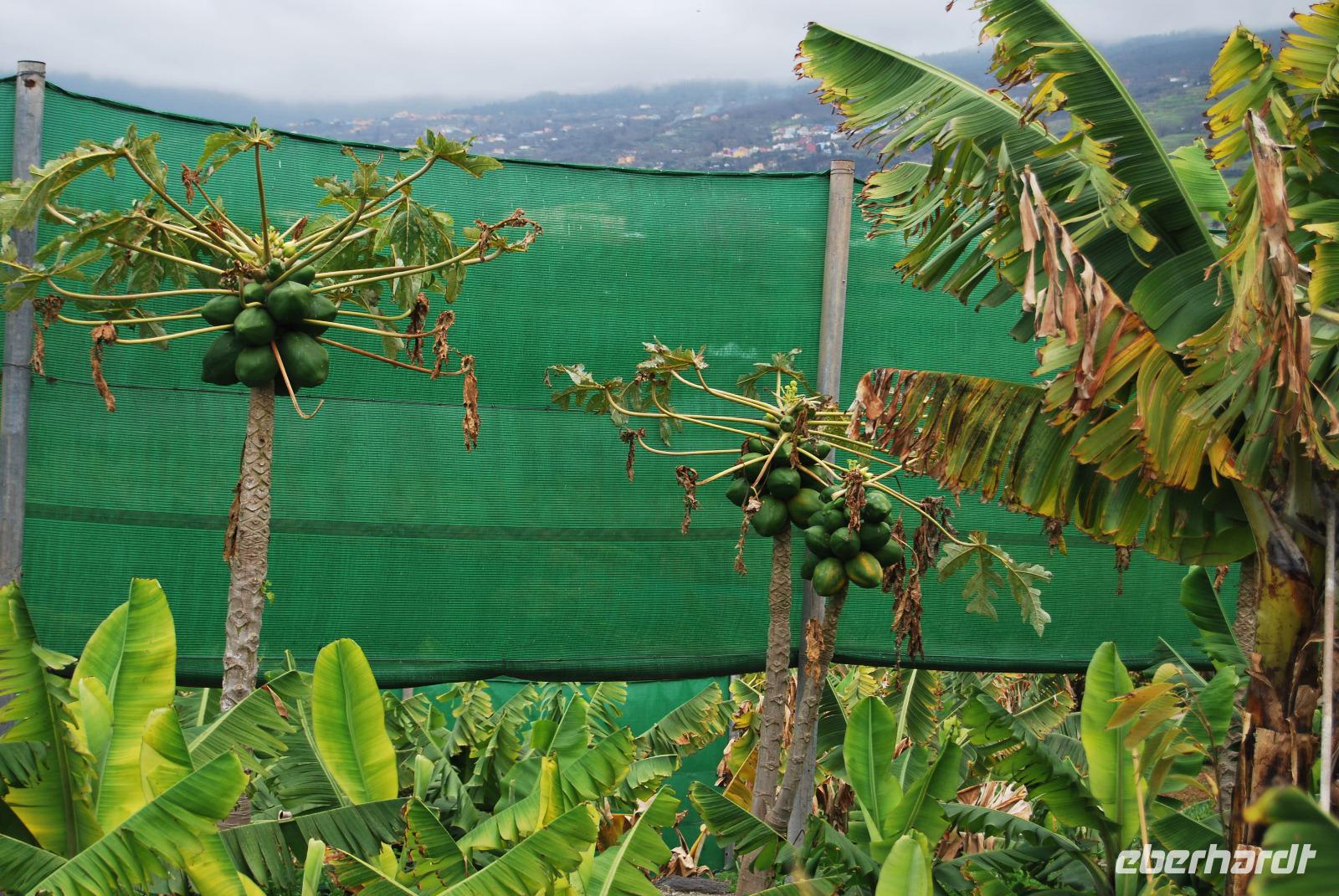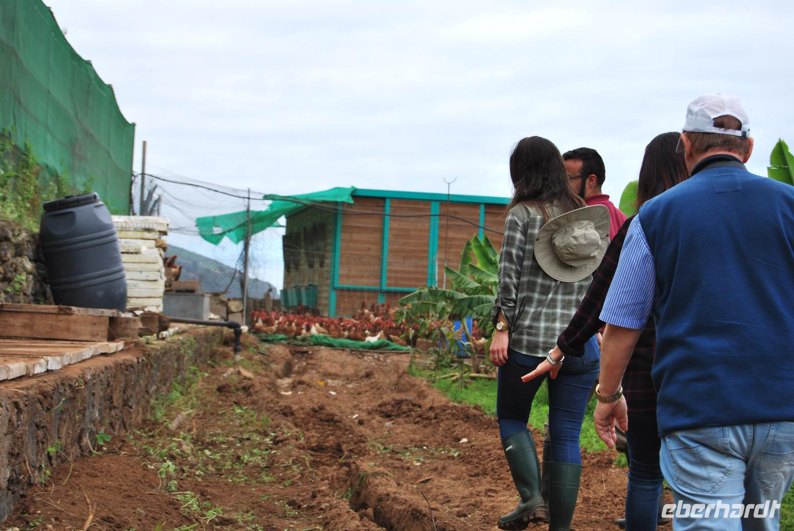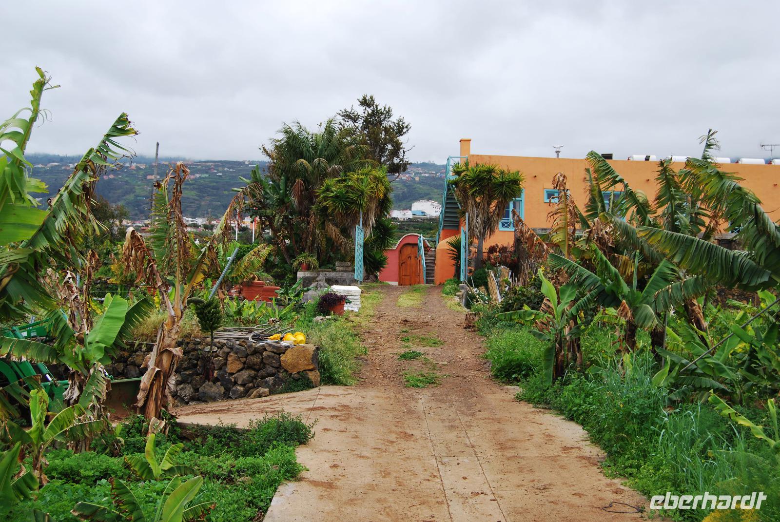 Bevor wir nach Santa Cruz fuhren, waren wir noch in Los Realejos auf die Finca El Patio de Tita geladen. In dem Casa Rual, dem ländlichen Haus, fanden wir eine Bio-Farm vor. Carmen, die den Hof schon in der 5. Generation bewirtschaftet zeigt uns zusammen mit dem „Chef-Farmer" Christian das Gelände. Auf gut 22.000 Quadratmetern werden hier vor allem Bananen angebaut. Aber auch Kartoffeln, Fenchel, Möhren, Avocado und Papaya sind immer mal wieder zwischen den Reihen gepflanzt - ganz ökologisch eben. Auch die hunderten von Hühnern, die täglich um die 200 Eier geben, werden gelegentlich als Unkrautvernichter eingesetzt. Nicht zu vergessen sind die Bienen die ebenfalls zur Farm gehören.