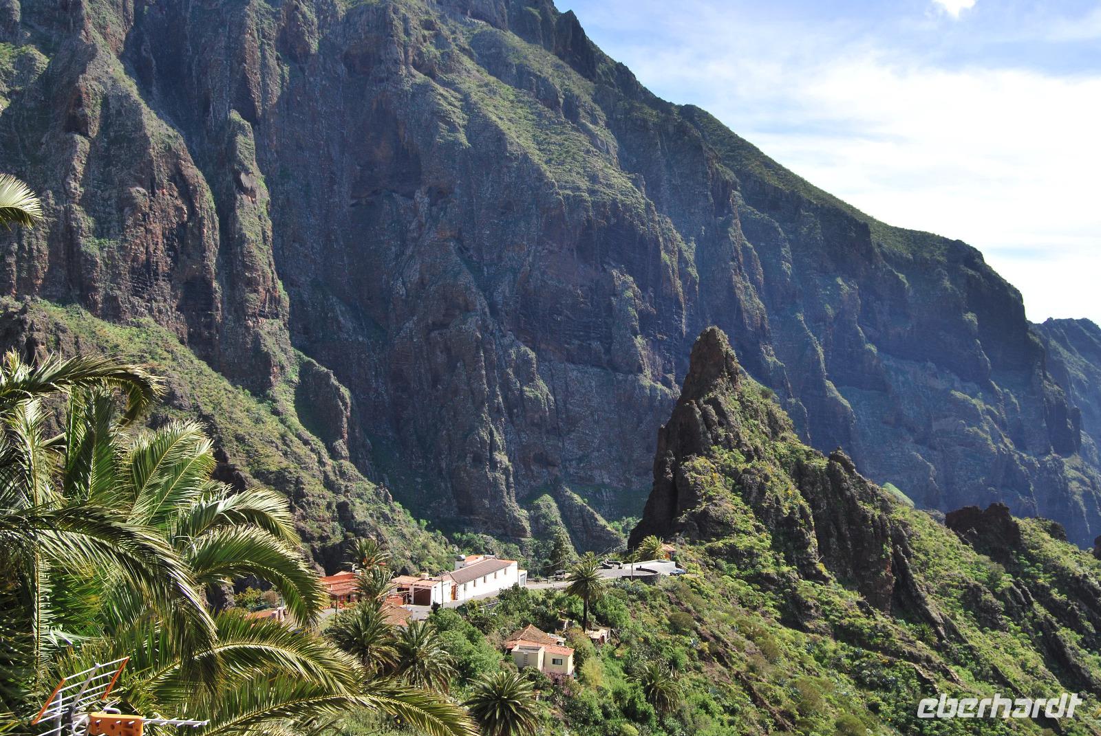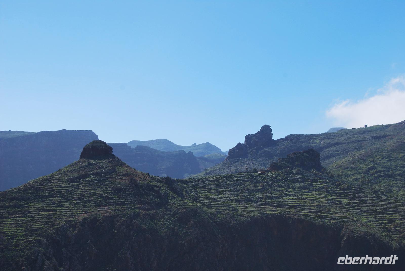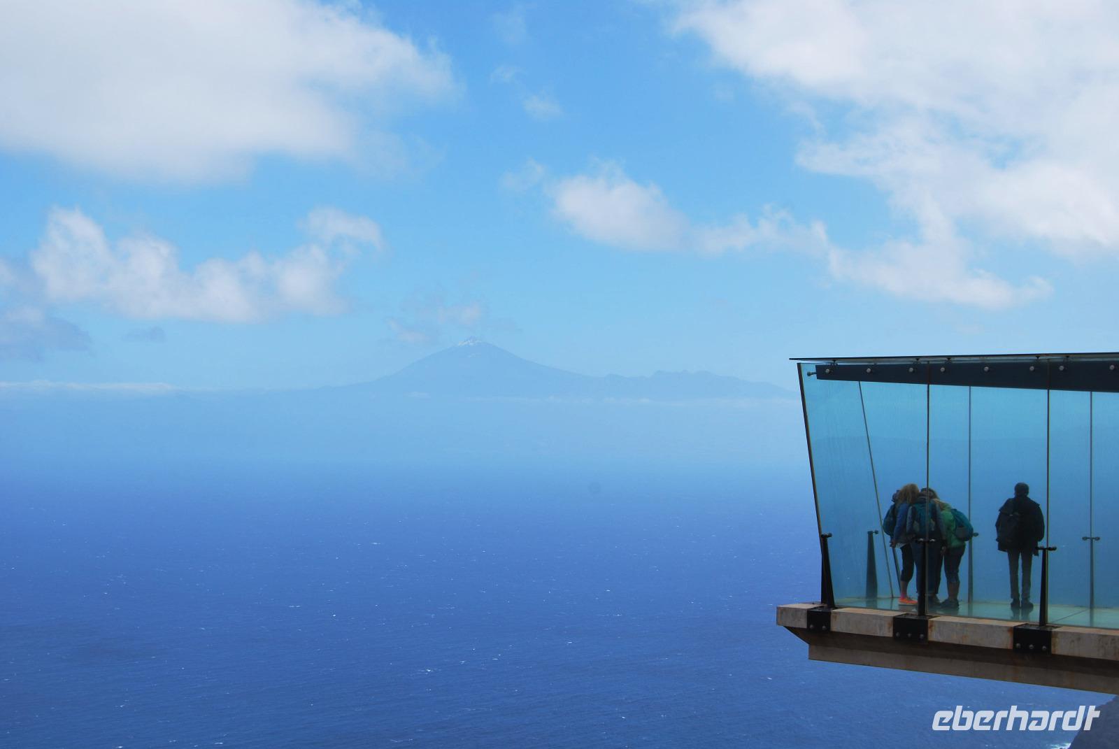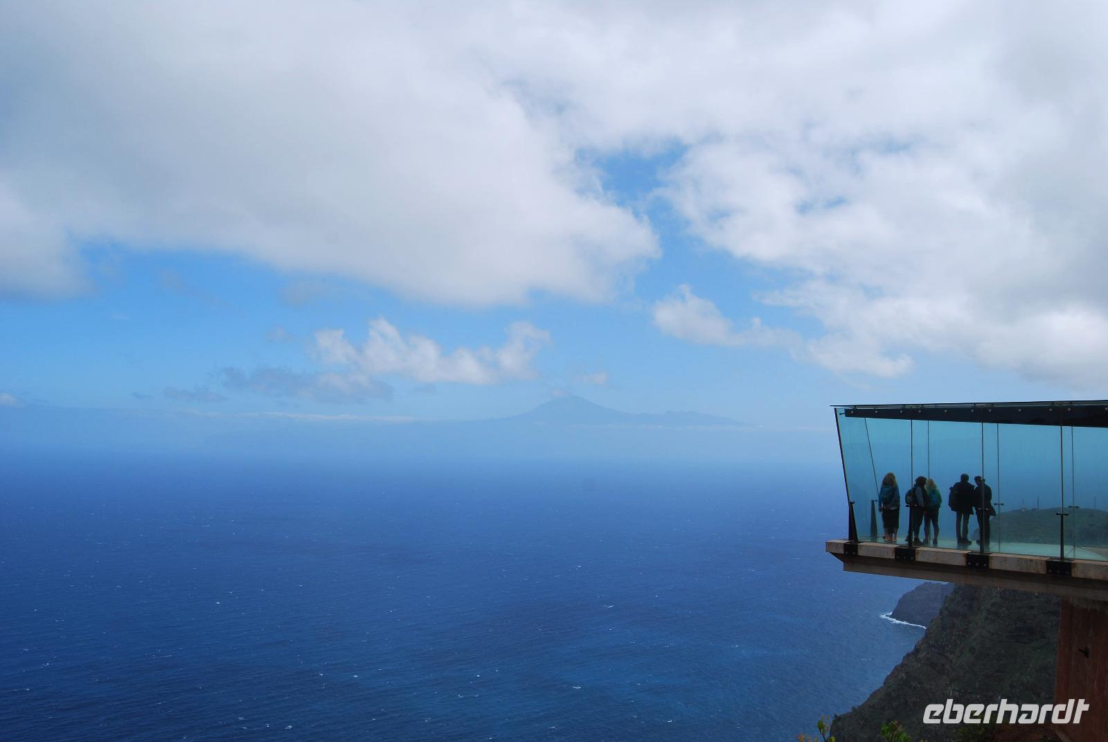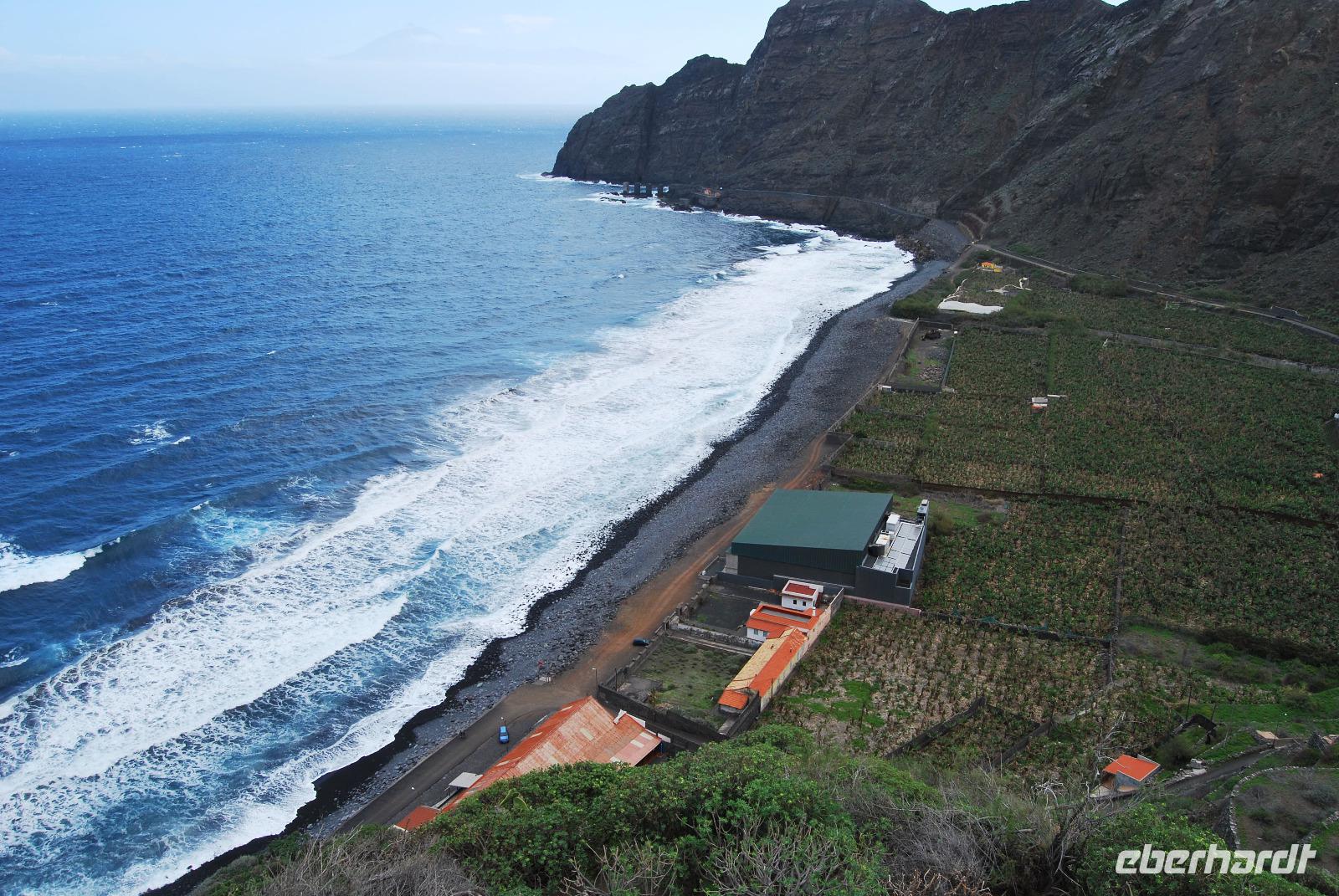 Als dann plötzlich vier große Reisebusse vor der Tür standen, suchten wir schnell das Weite und setzten unsere Rundreise fort. Am Ende von Hermigua machten wir noch einen Fotostopp und hielten Ausschau über den schmalen Küstenstreifen. Die Bananen drängten sich im dichten Grün bis an den Strand. In der Ferne war auch noch der alte Anleger zusehen, von dem einst die Bananenschiffe beladen wurden. Dann fuhren wir die steilen Klippen bei Agulo hinauf, denn wir wollten zum Mirador de Abrante. Das an der Felskante gelegene Restaurant war wie immer sehr beeindruckend. Uns wurde ein köstliches Menü serviert und im Anschluss gab es noch eine kurze Vorführung vom Koch und Kellner der Silbio, wie die Pfeifsprache der Gomeros genannt wird. Die Silbio zählt zum immateriellen Kulturerbe und wird mittlerweile auch wieder in den Schulen auf La Gomera unterrichtet. Früher konnten sich die Menschen so über weite Strecken und Schluchten Informationen übermitteln.