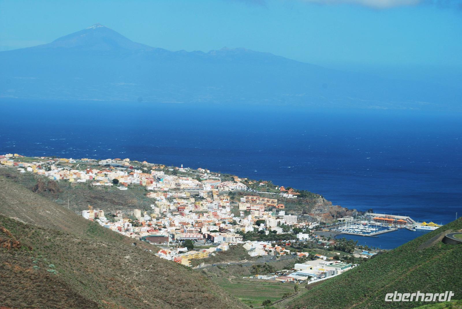 An diesem Donnerstag mussten wir, die den zusätzlichen Ausflug nach La Gomera machen wollten, extrem früh aufstehen. Ab 5 Uhr morgens gab es Frühstück, um 6 Uhr war die Abfahrt geplant. Denn wir fuhren ganz in den Süden von Teneriffa nach Los Christianos. Damit wir rechtzeitig die Fähre erreichten und nicht im Stau stecken blieben war dies leider erforderlich. Mit dem Katamaran von Fred Olsen setzten wir dann auf die 38 Kilometer entfernte Insel über. Von San Sebastian, der Hauptstadt der Insel, ging es die nördliche Bergstraße hinauf. Wir stoppten am Mirador de Manaderos mit Blick auf den prall gefüllt Stausee von Chejelipes. Als nächstes bogen wir in den Norden der Insel ab. Im langgezogenen Tal von Hermigua sahen wir zahlreiche Bananenanpflanzungen. Wir machten einen kurzen Stopp an einem Souvenirgeschäft. Dort zeigte uns Gisela ein paar typische Produkte der Insel La Gomera. Wir durften den Palmenhonig verkosten, der eigentlich ein Sirup ist und nur hier auf der Insel gewonnen wird. Mit einem aufwändigen Prozess werden die Palmen geköpft, entsaftet und aufbereitet. Jede Palme steht auf Gomera unter Naturschutz und das entsaften der Pflanzen kann nur alle paar Jahre erfolgen, wird strengsten überwacht und jede Entnahme muss beantragt werden.