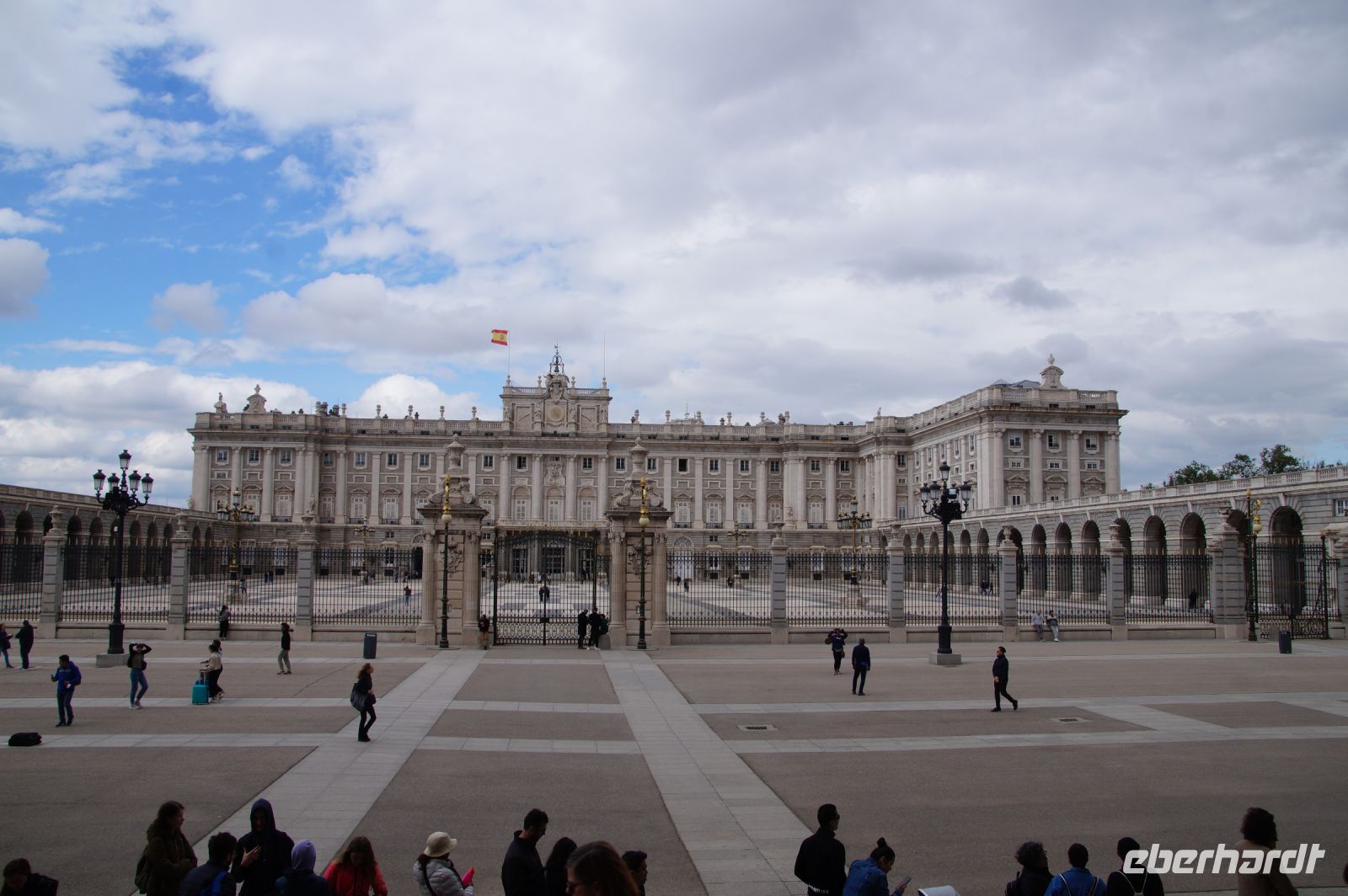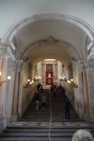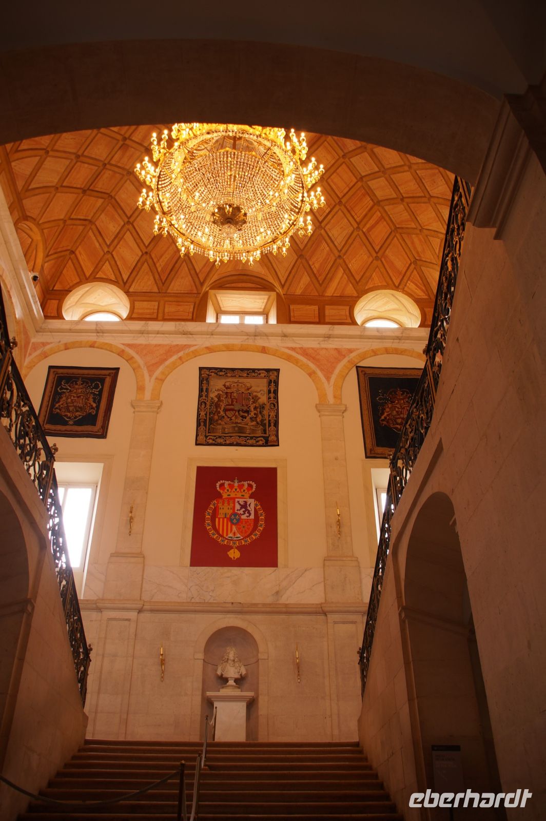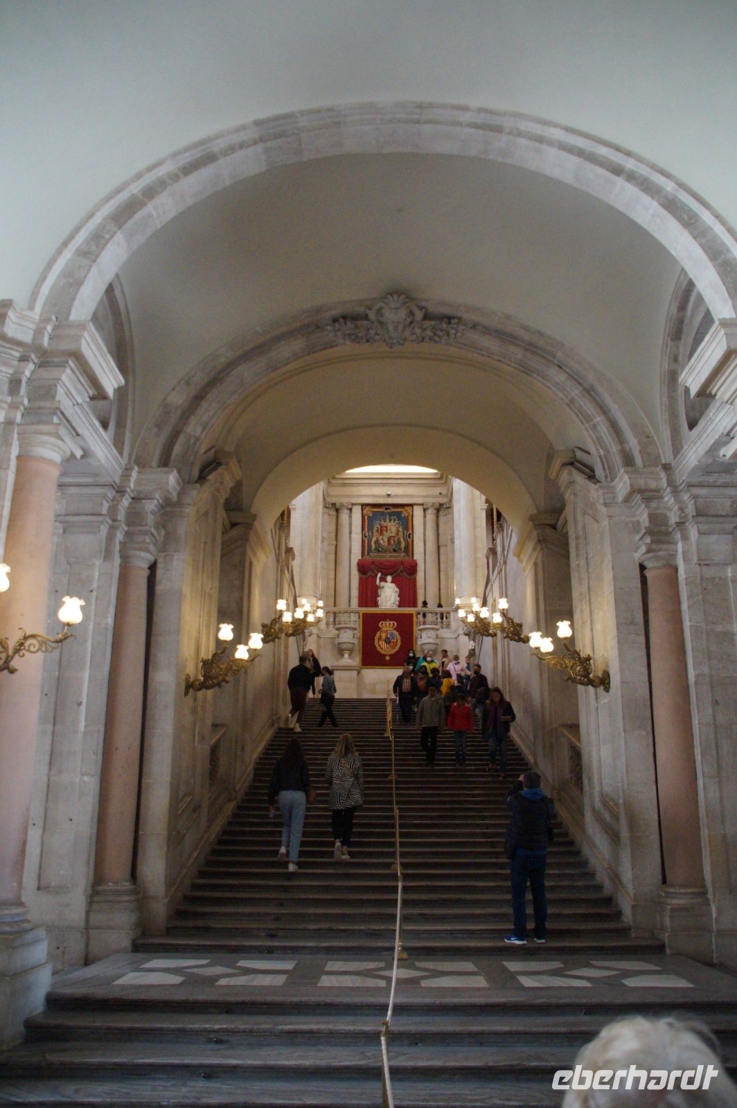 Anschließend ging es zum Königspalast, den wir durchwanderten. Wir stiegen die Botschaftertreppe hinauf und begaben uns durch die Repräsentationsräume der spanischen Monarchie. Nun... man spricht von "Madrid de los Austrias", denn es waren die Habsburger (" 'absburgos" für die Spanier, was denen aber nicht so leicht über die Zunge kommt, weshalb sie sich in "los Austrias" flüchten), welche aus dem unbedeutenden Dörflein auf dem Felsen über dem Manzanares mit einer verfallenen arabischen Qasba (Alcazaba) die Hauptstadt ihres Imperiums machten, "in dem die Sonne nicht untergeht". Als Karl V./Carlos I. 1516 die Regierung in Spanien antrat, vollzog sich gerade der Sprung von Kuba auf das mexikanische Festland, sein Reich reichte von Wien bis zum Pazifik, als sein Sohn Philipp an der Macht war, wurde eine Inselgruppe erobert, die in westlichen Sprachen bis heute als die Philippinen firmiert (nur dass Philipp aufgrund der habsburgischen Teilung nicht mehr über die österreichischen Gebiete regierte, sondern die Spanischen Niederlande als einzigen Teil im Heiligen Römischen Reich beherrschte, in dem jetzt sein in Spanien geborener Onkel Ferdinand Kaiser war und die habsburgischen Stammlande in Österreich beherrschte.
