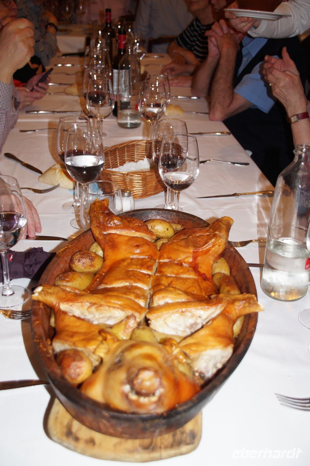 Wir machten einen Umweg am ägyptischen Debodtempel vorbei, da erlebte der erste Reisegast schon seine erste Tiefe. Eben hatte er noch einen Gruß an seine Schwägerin geschickt, als er plötzlich sein Handy vermisste. Da es ausgeschaltet war, und er sich sicher war, die Tasche verschlossen zu haben, blieb fast nur Taschendiebstahl übrig. Mit Verspätung kamen wir entsprechend im Botín, einem seit 1725 sich im Betrieb befindlichen Restaurant an, wo wir Suppe und Spanferkelchen bekamen. Lediglich dem Diebstahlopfer wollte es verständlicherweise nicht schmecken.