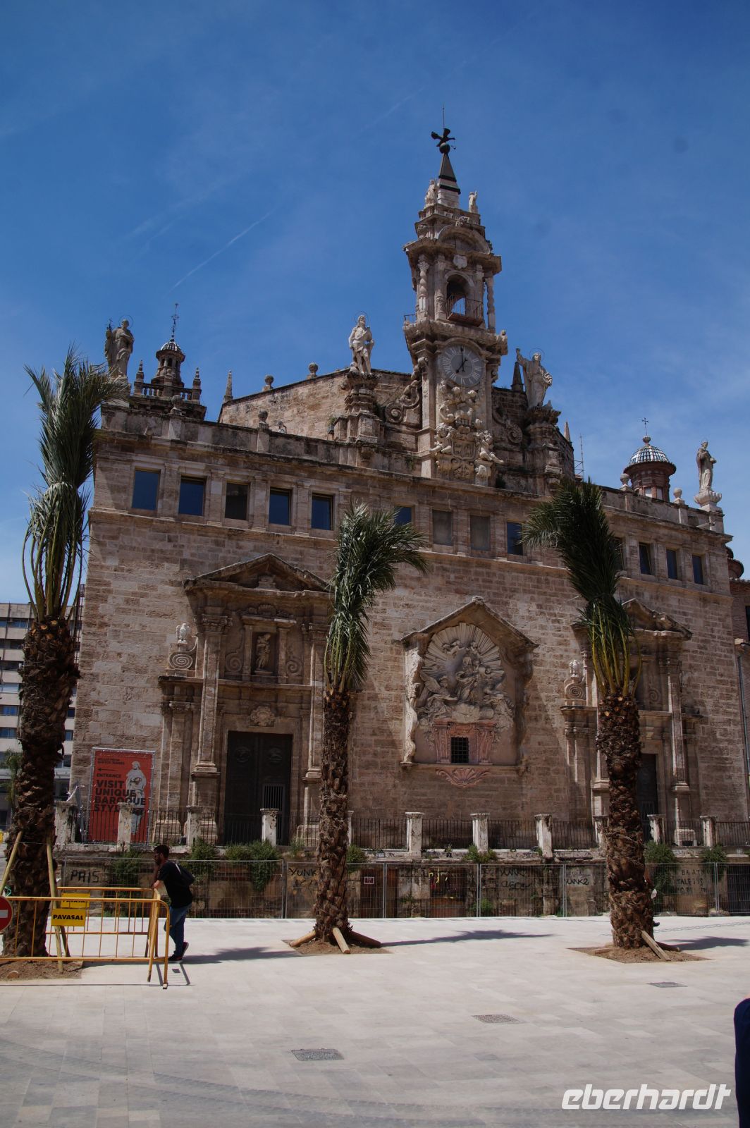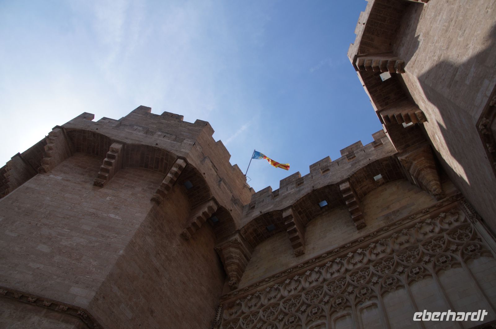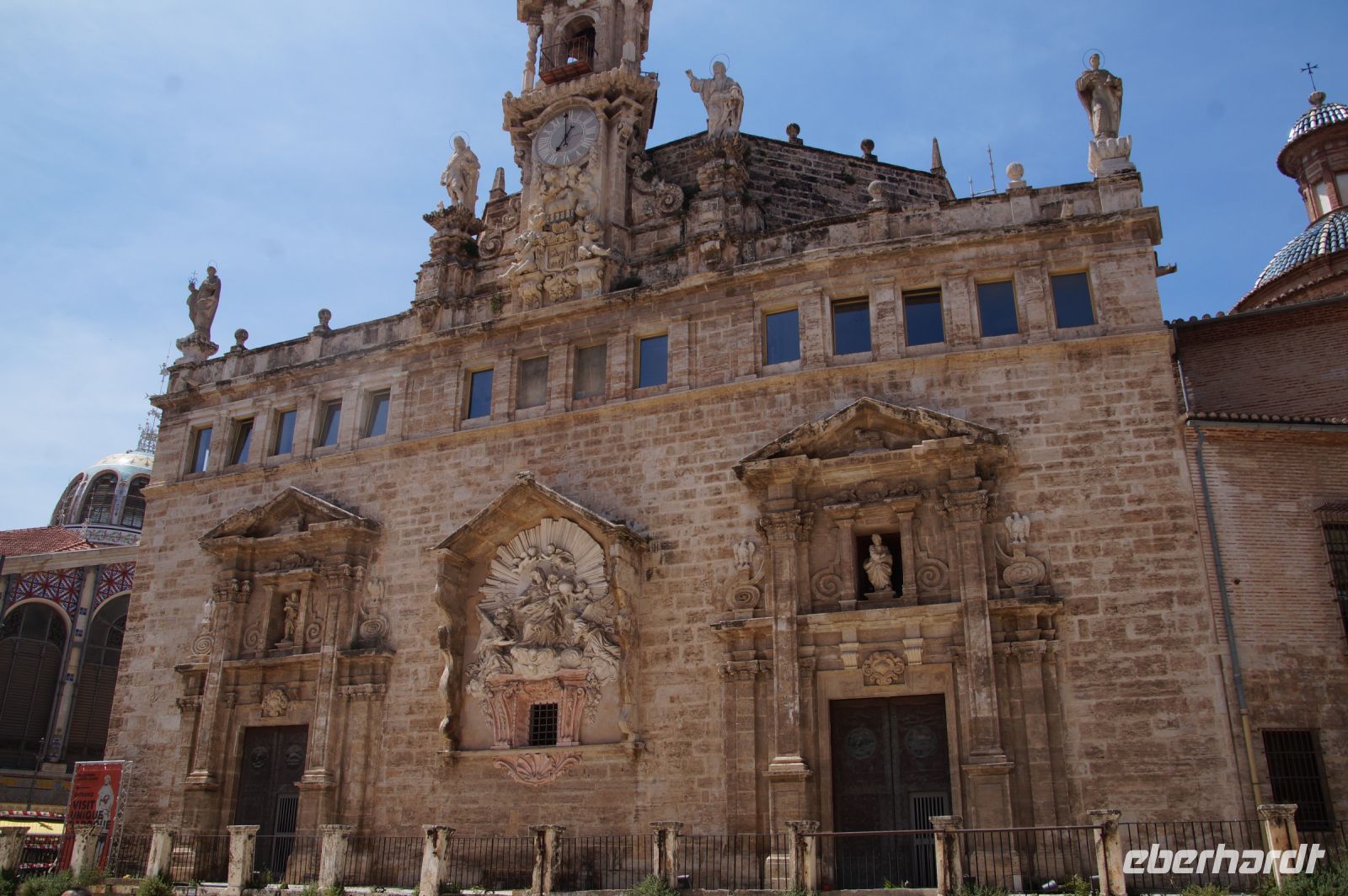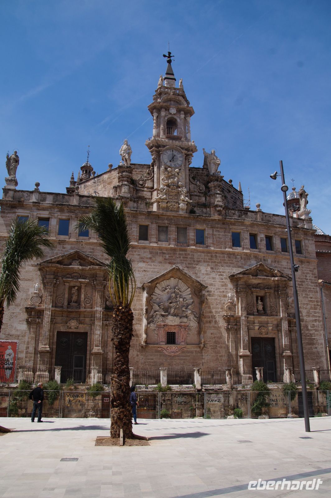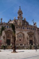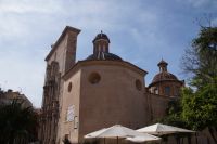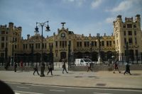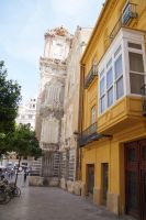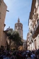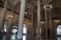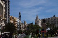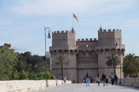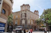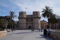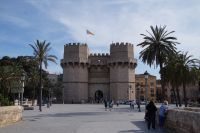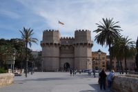 Neben Architektur aus der allerjüngsten Zeit sahen wir rund um den Hafen aber auch Lagerhäuser im Jugendstil, in denen früher die Orangen auf ihre Verschiffung warteten. Wir sahen Jugendstil in der Stadt und dann im Kontrast mittelalterliche Stadttore. An einem solchen, nach seinen beiden flankierenden Türmen Torres de Serranos genannt, stiegen wir aus und erschlossen uns die Stadt von hier aus zu Fuß. Recht schnell standen wir auf dem Jungfrauenplatz (Plaza de la Virgen) mit der barocken Basilika der Virgen de los Desamparados (Heilige Jungfrau der Hilfsbedürftigen), der man römische Inschriftensteine in die Fassade gesetzt hatte und der Kathedrale.