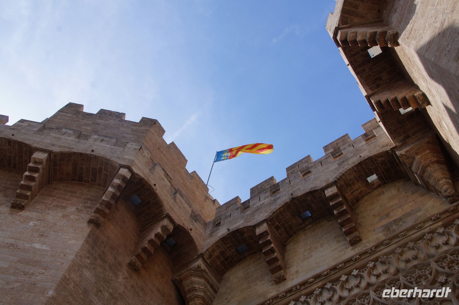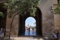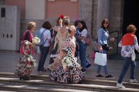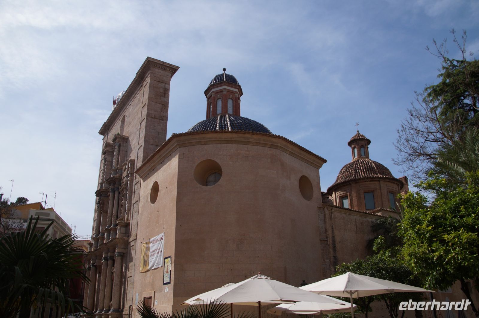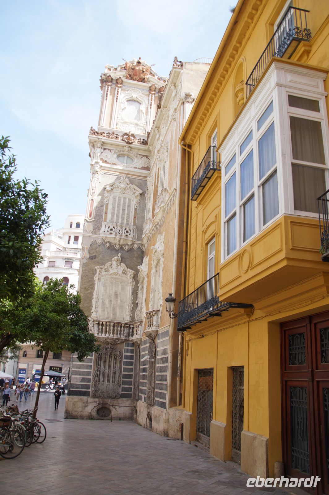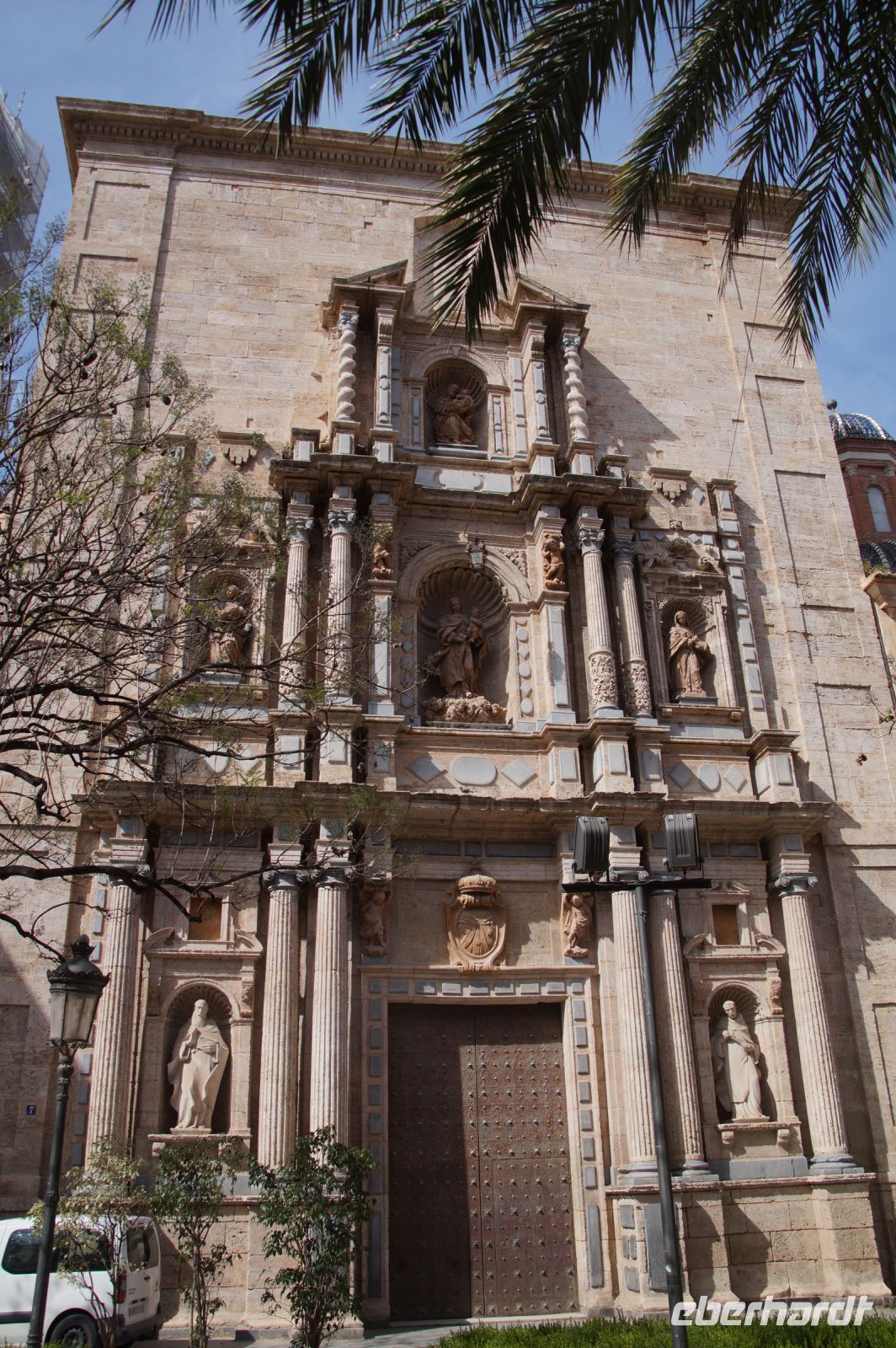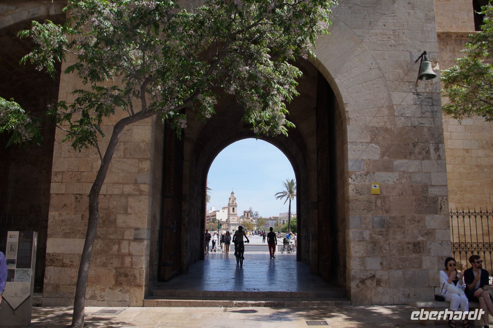 Neben Architektur aus der allerjüngsten Zeit sahen wir rund um den Hafen aber auch Lagerhäuser im Jugendstil, in denen früher die Orangen auf ihre Verschiffung warteten. Wir sahen Jugendstil in der Stadt und dann im Kontrast mittelalterliche Stadttore. An einem solchen, nach seinen beiden flankierenden Türmen Torres de Serranos genannt, stiegen wir aus und erschlossen uns die Stadt von hier aus zu Fuß. Recht schnell standen wir auf dem Jungfrauenplatz (Plaza de la Virgen) mit der barocken Basilika der Virgen de los Desamparados (Heilige Jungfrau der Hilfsbedürftigen), der man römische Inschriftensteine in die Fassade gesetzt hatte und der Kathedrale.