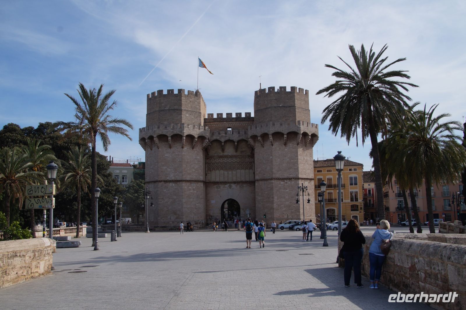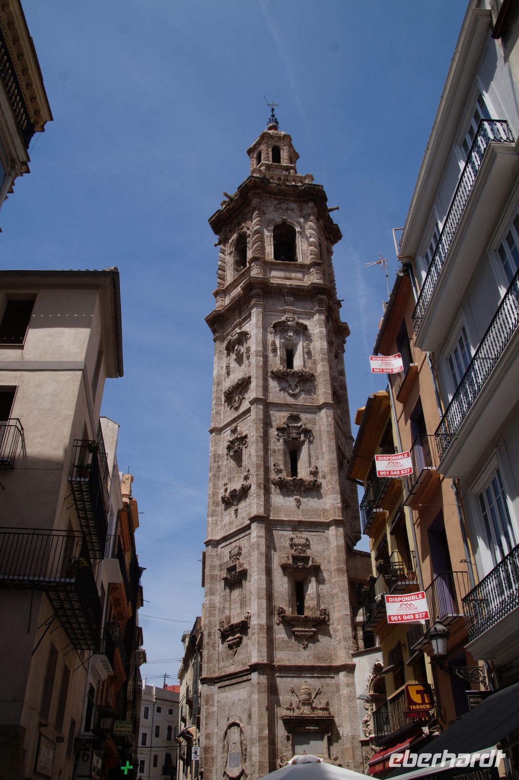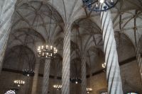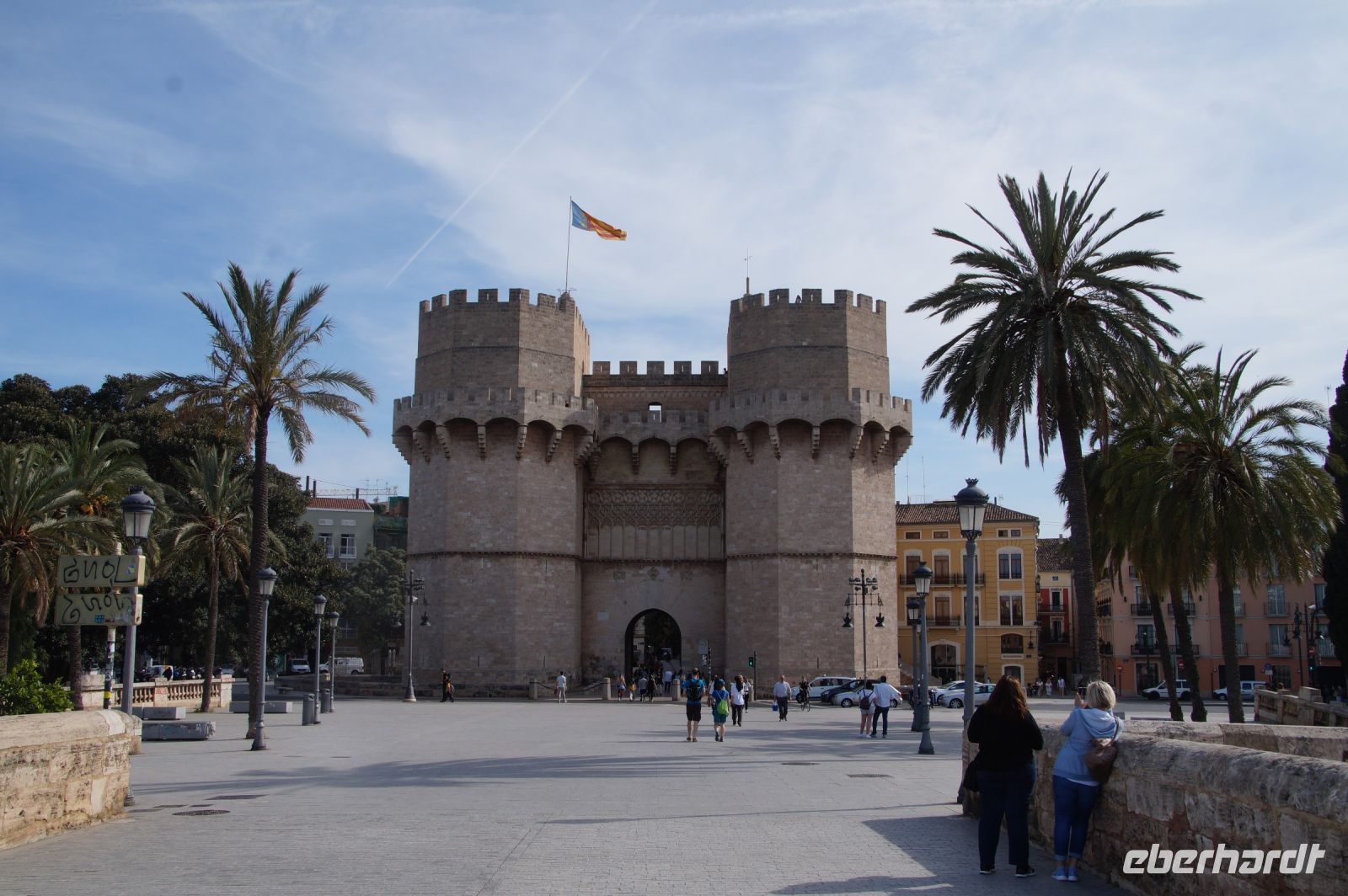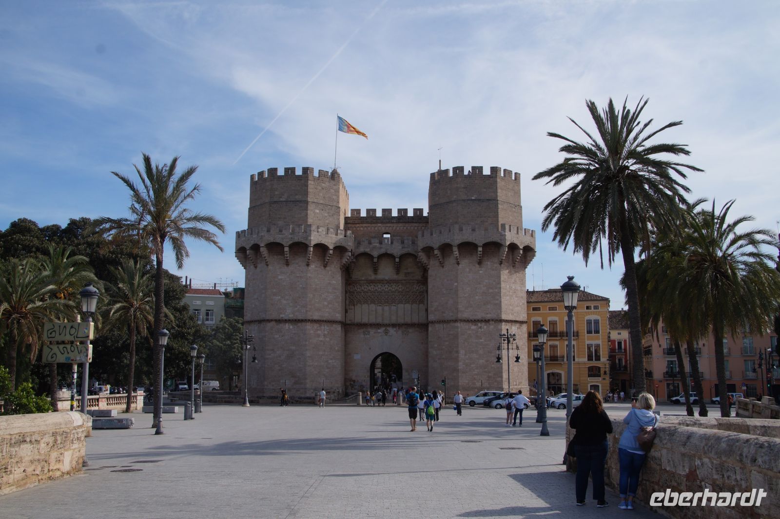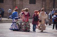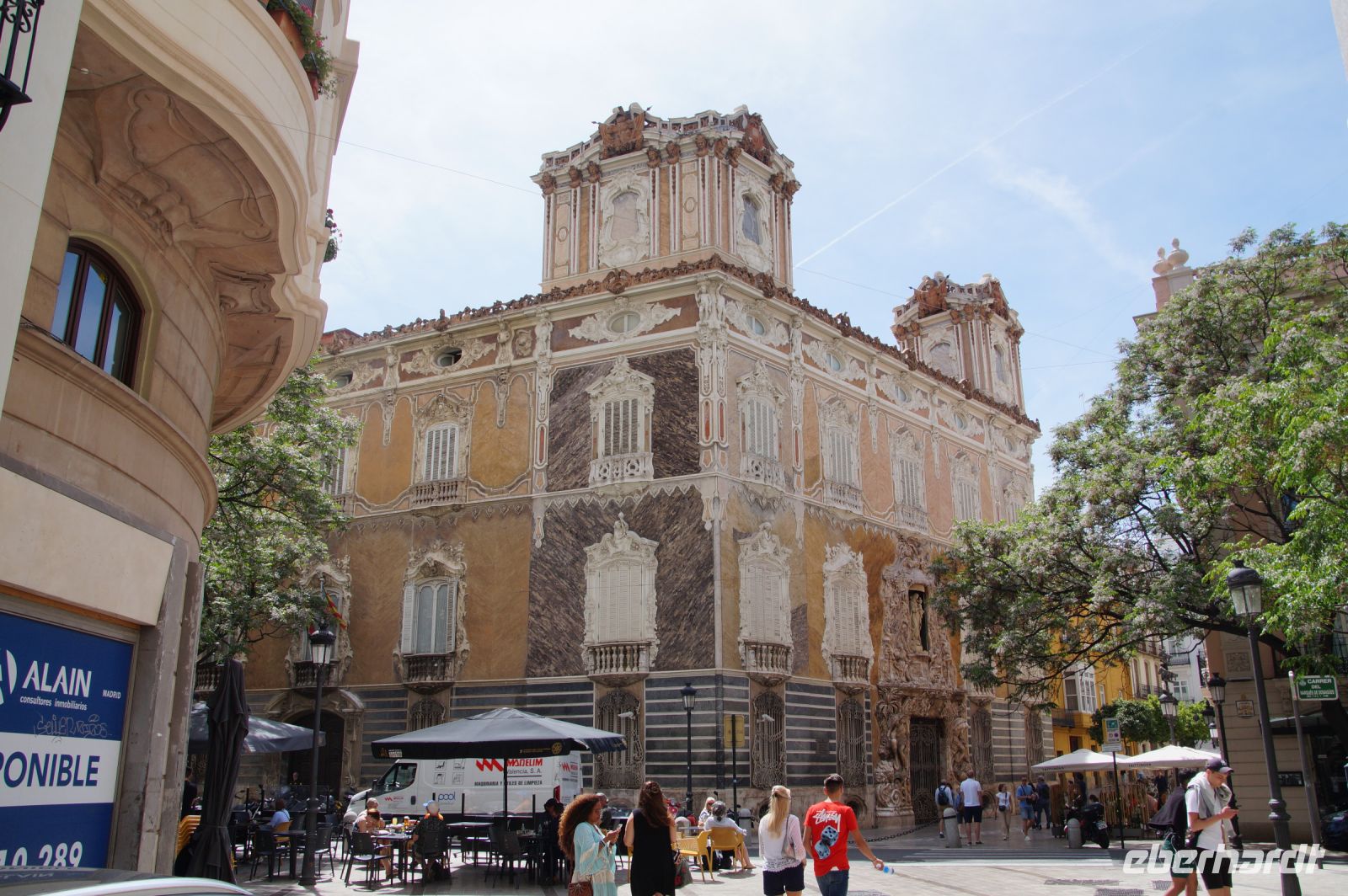 Neben Architektur aus der allerjüngsten Zeit sahen wir rund um den Hafen aber auch Lagerhäuser im Jugendstil, in denen früher die Orangen auf ihre Verschiffung warteten. Wir sahen Jugendstil in der Stadt und dann im Kontrast mittelalterliche Stadttore. An einem solchen, nach seinen beiden flankierenden Türmen Torres de Serranos genannt, stiegen wir aus und erschlossen uns die Stadt von hier aus zu Fuß. Recht schnell standen wir auf dem Jungfrauenplatz (Plaza de la Virgen) mit der barocken Basilika der Virgen de los Desamparados (Heilige Jungfrau der Hilfsbedürftigen), der man römische Inschriftensteine in die Fassade gesetzt hatte und der Kathedrale.