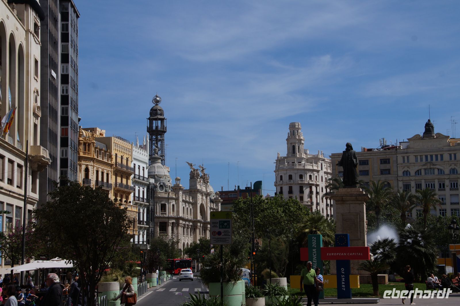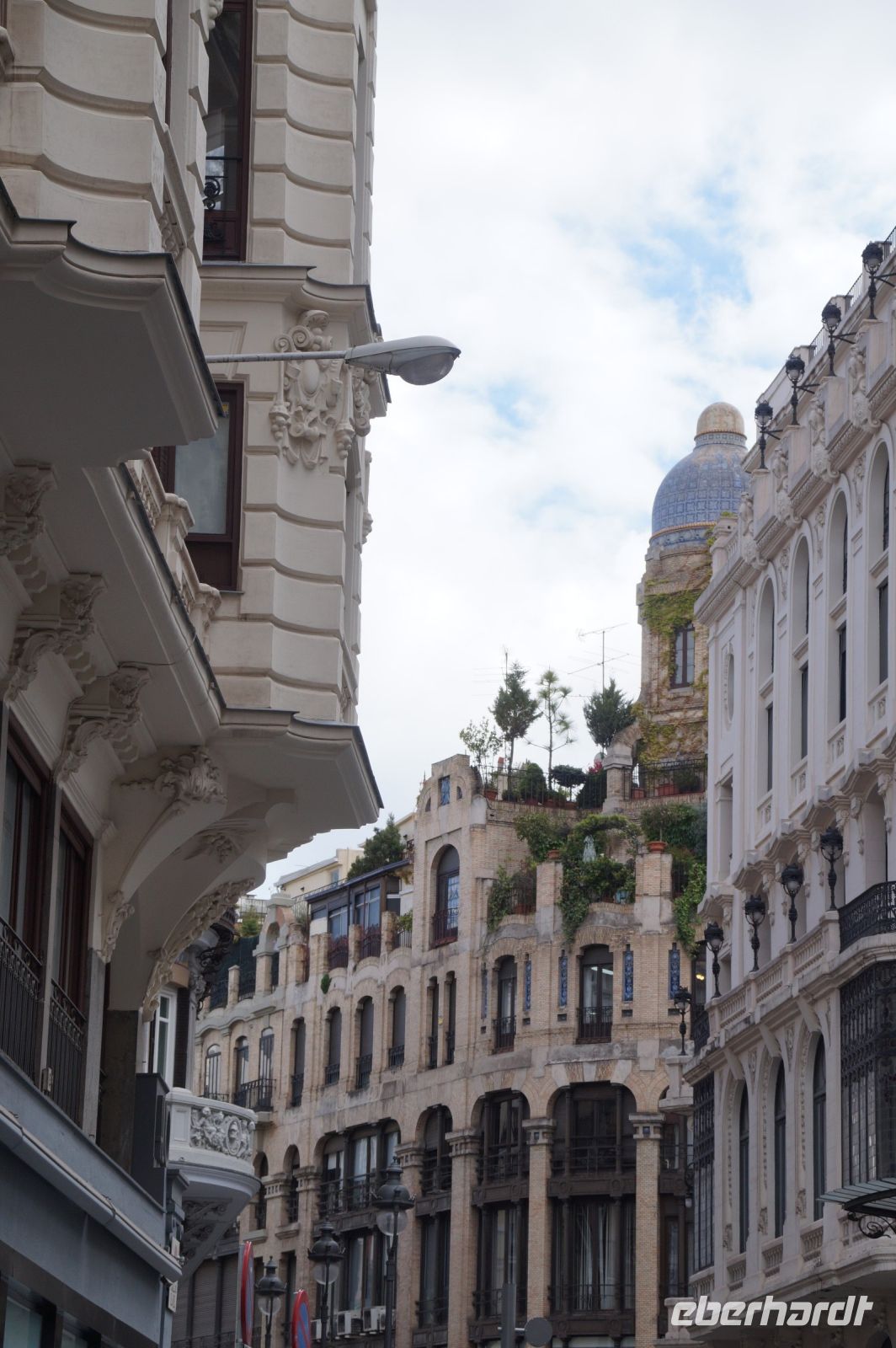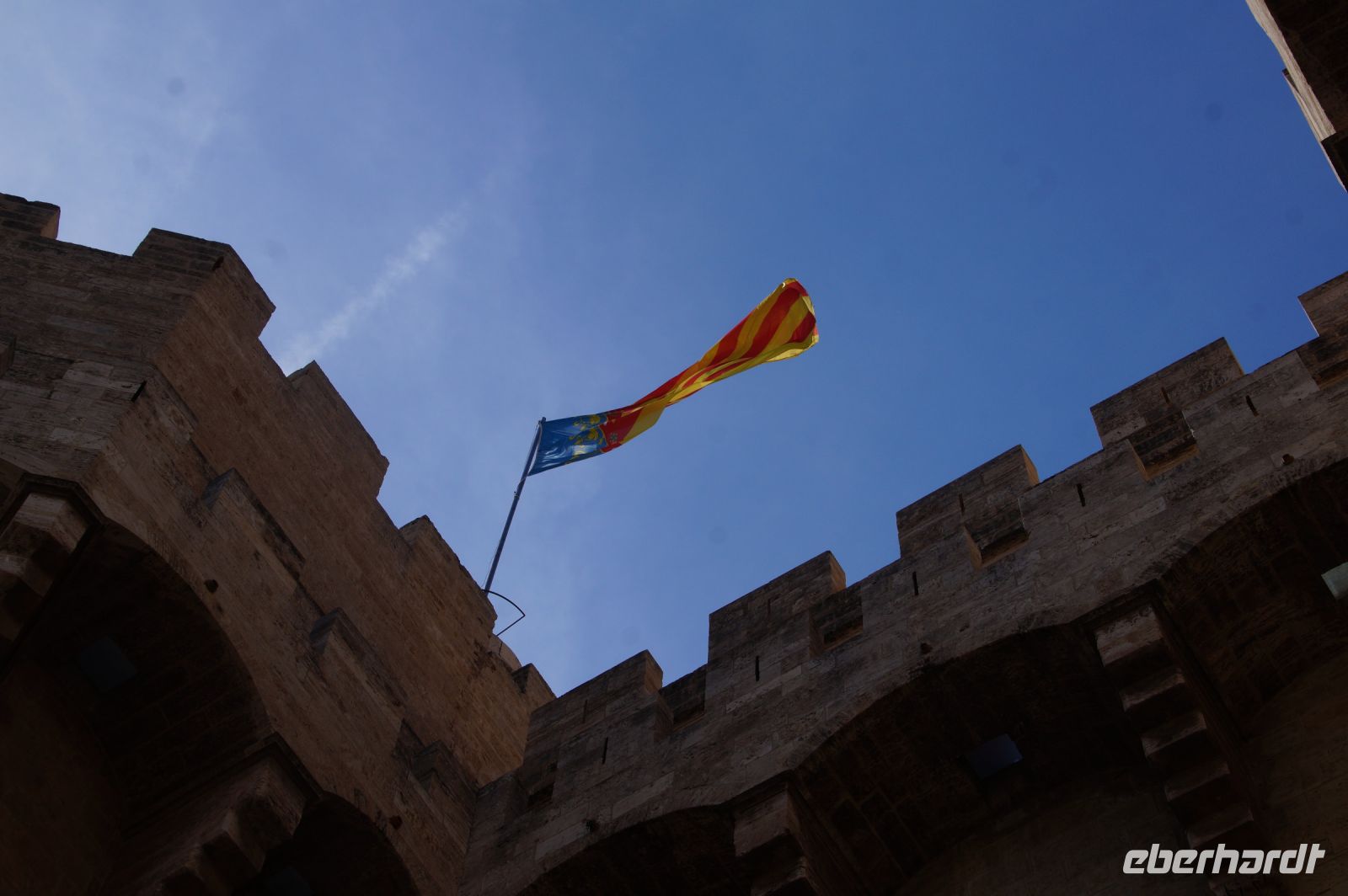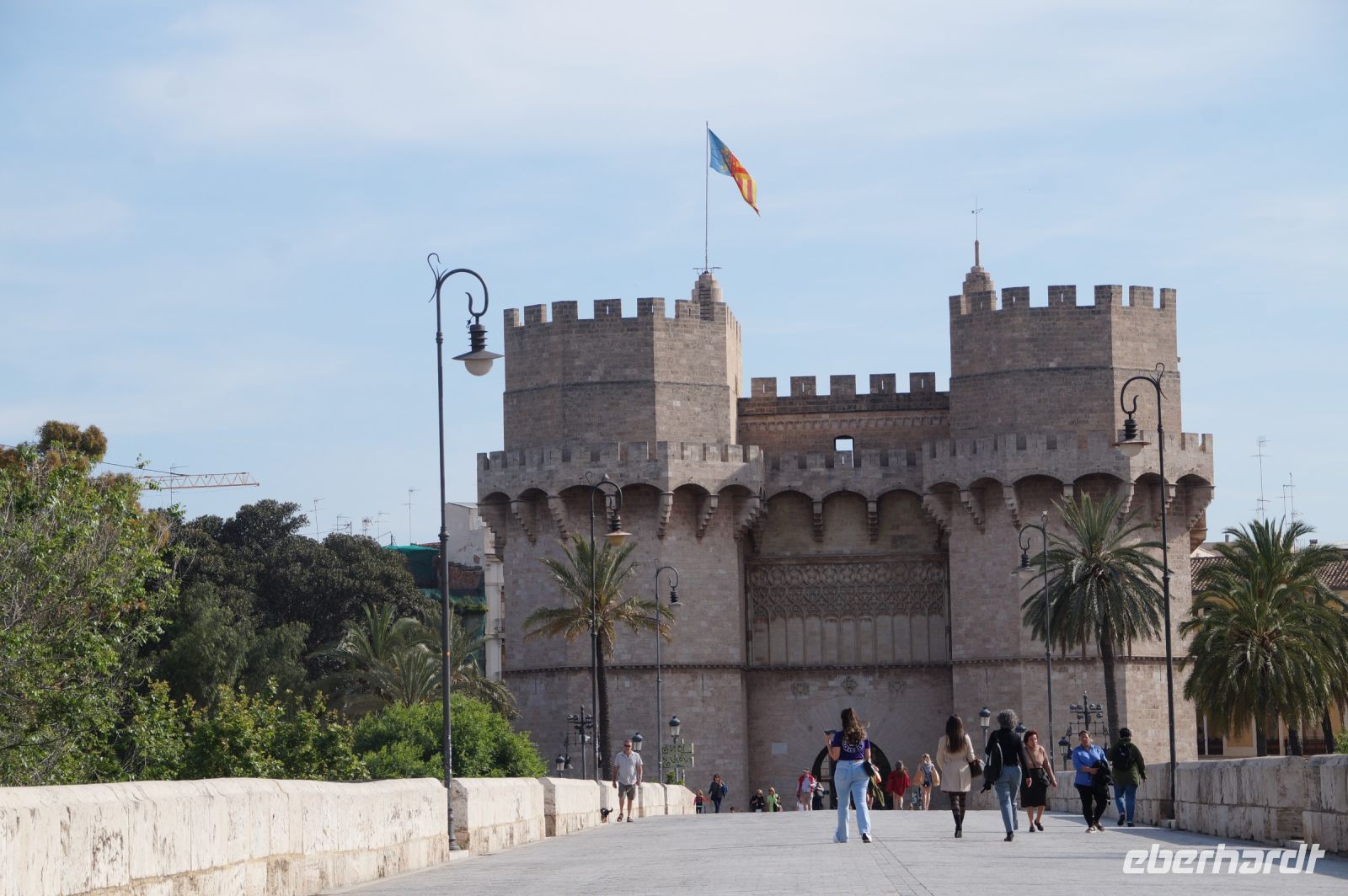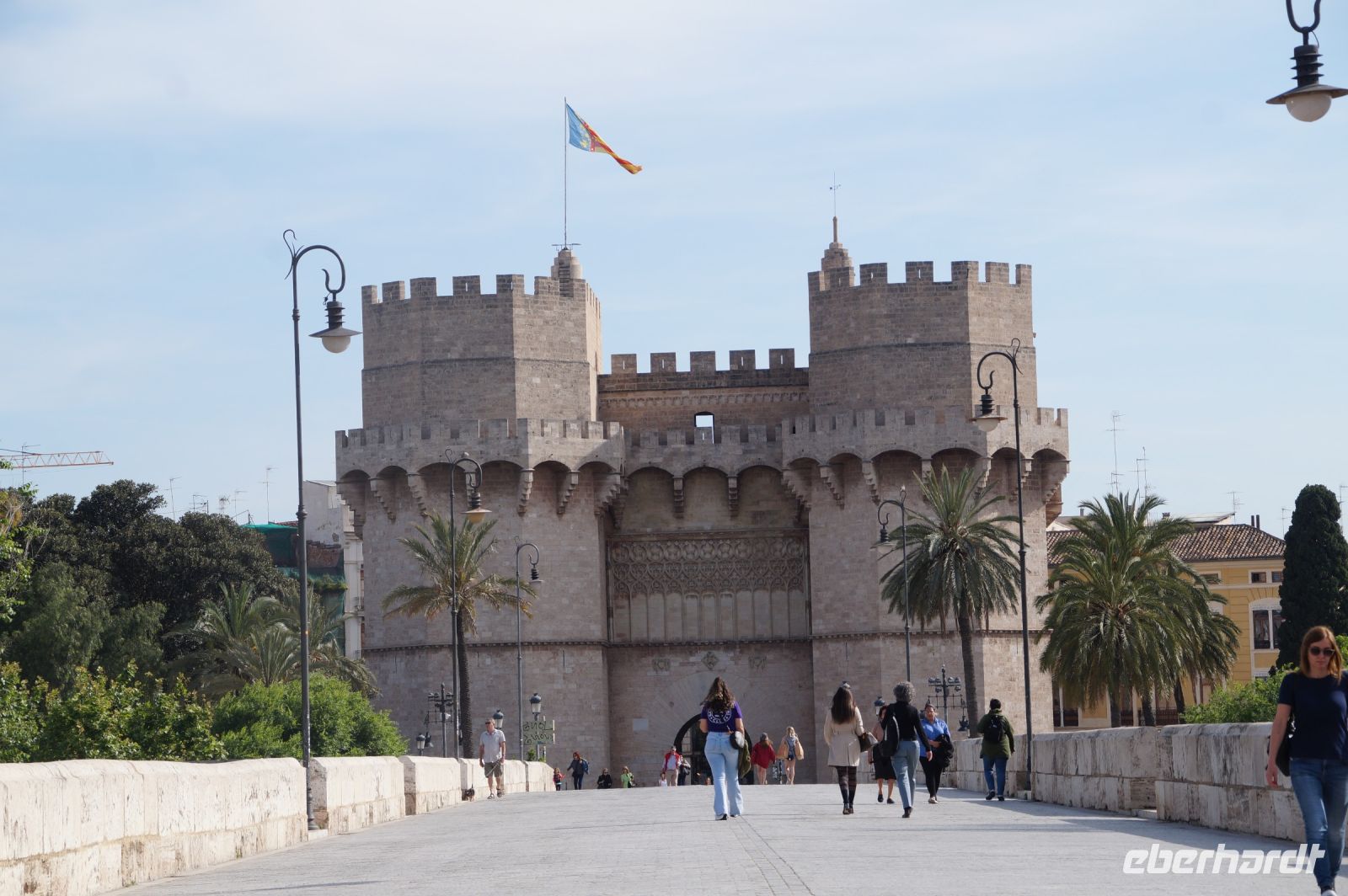 Neben Architektur aus der allerjüngsten Zeit sahen wir rund um den Hafen aber auch Lagerhäuser im Jugendstil, in denen früher die Orangen auf ihre Verschiffung warteten. Wir sahen Jugendstil in der Stadt und dann im Kontrast mittelalterliche Stadttore. An einem solchen, nach seinen beiden flankierenden Türmen Torres de Serranos genannt, stiegen wir aus und erschlossen uns die Stadt von hier aus zu Fuß. Recht schnell standen wir auf dem Jungfrauenplatz (Plaza de la Virgen) mit der barocken Basilika der Virgen de los Desamparados (Heilige Jungfrau der Hilfsbedürftigen), der man römische Inschriftensteine in die Fassade gesetzt hatte und der Kathedrale.