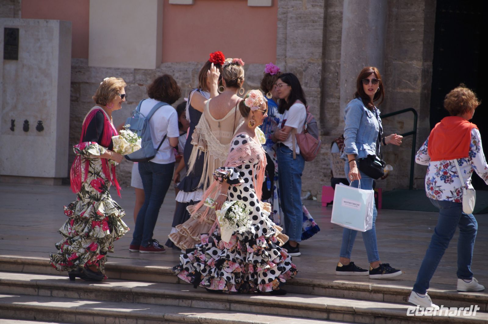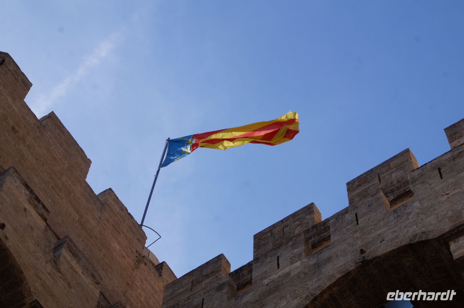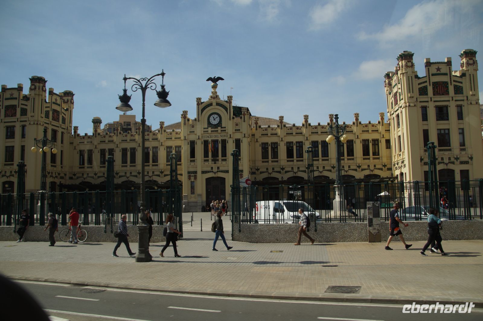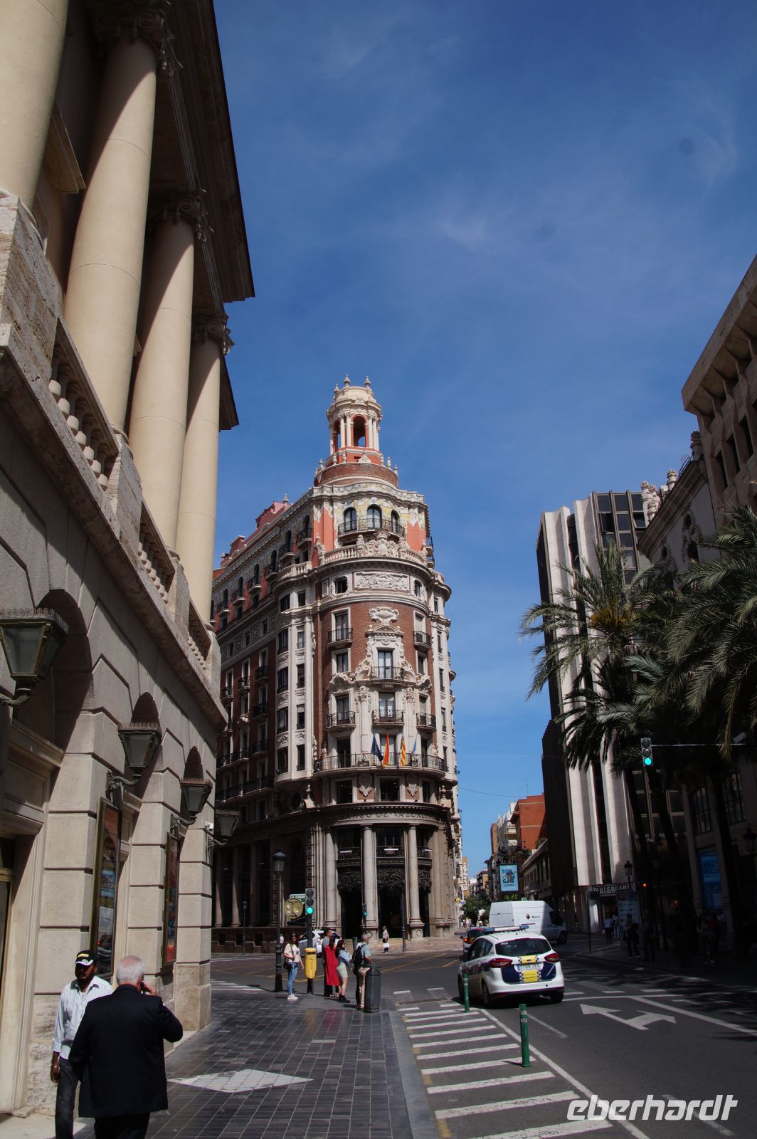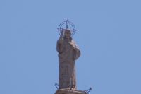 Neben Architektur aus der allerjüngsten Zeit sahen wir rund um den Hafen aber auch Lagerhäuser im Jugendstil, in denen früher die Orangen auf ihre Verschiffung warteten. Wir sahen Jugendstil in der Stadt und dann im Kontrast mittelalterliche Stadttore. An einem solchen, nach seinen beiden flankierenden Türmen Torres de Serranos genannt, stiegen wir aus und erschlossen uns die Stadt von hier aus zu Fuß. Recht schnell standen wir auf dem Jungfrauenplatz (Plaza de la Virgen) mit der barocken Basilika der Virgen de los Desamparados (Heilige Jungfrau der Hilfsbedürftigen), der man römische Inschriftensteine in die Fassade gesetzt hatte und der Kathedrale.