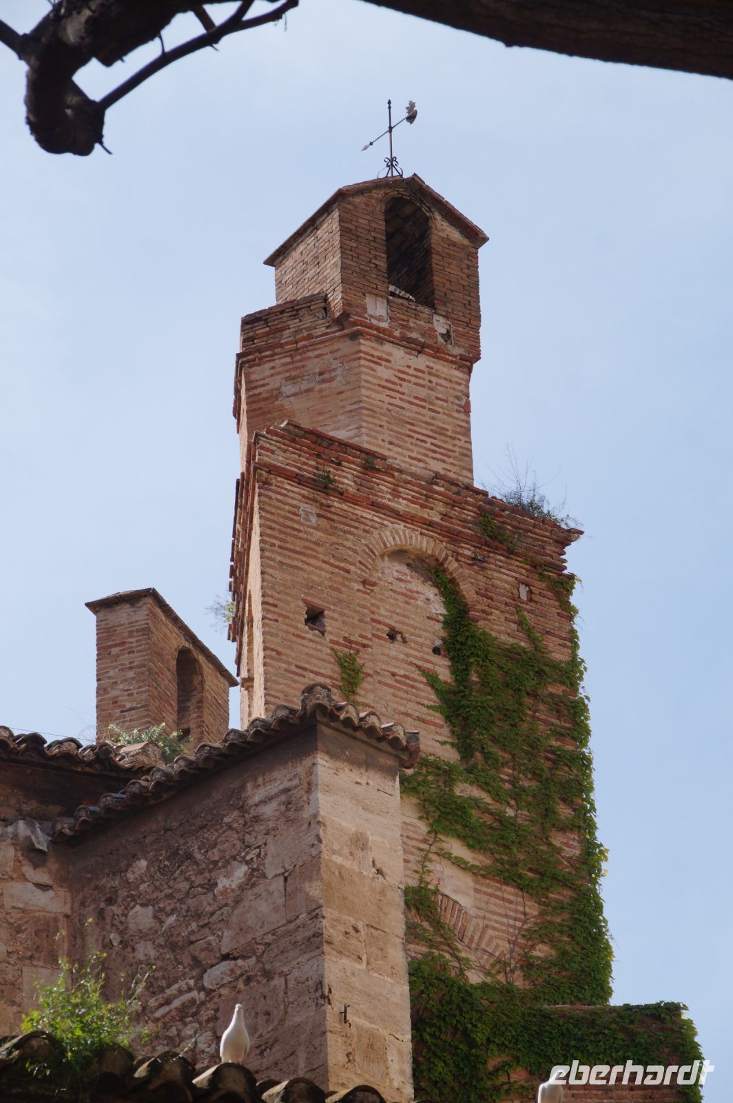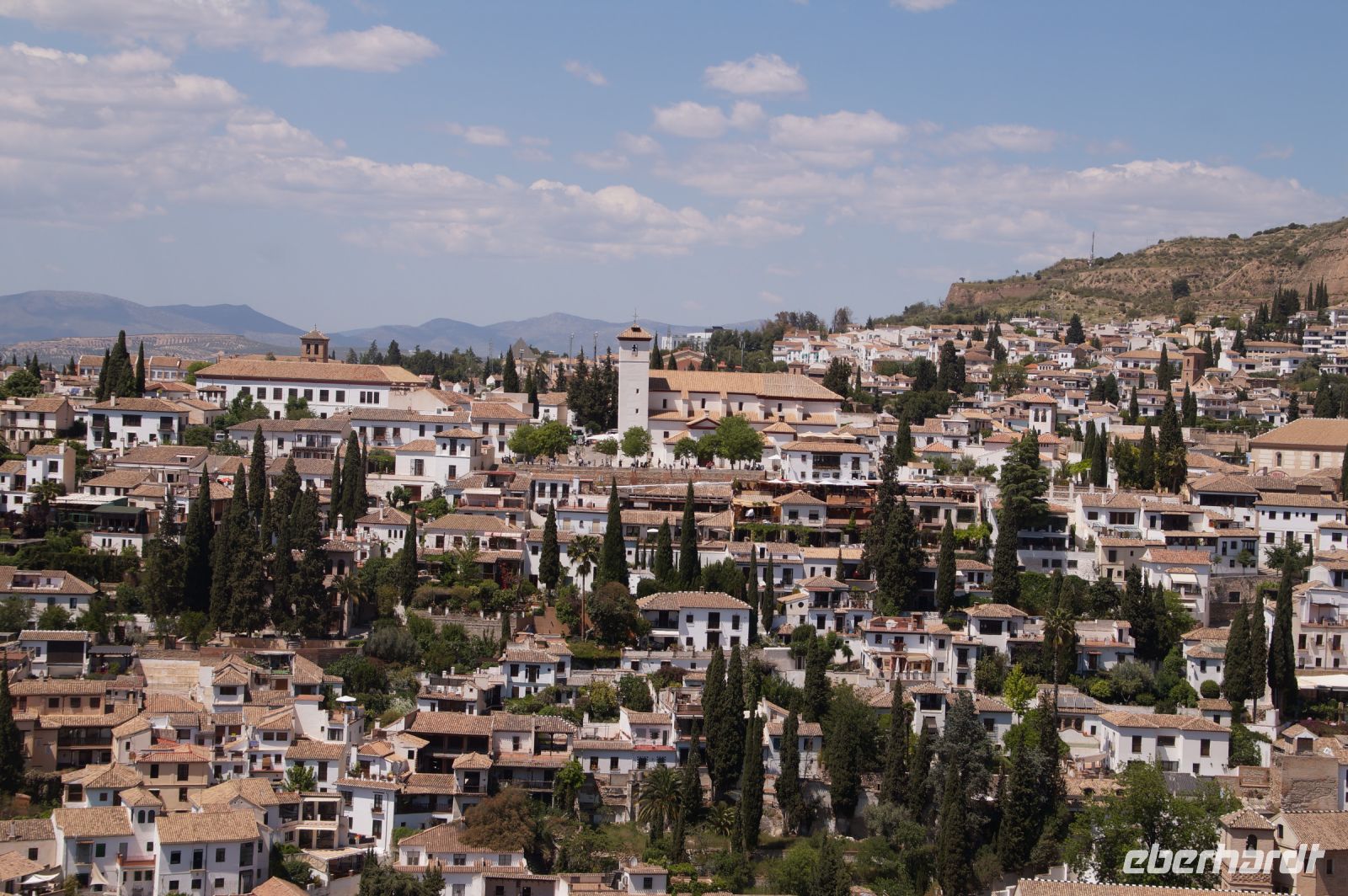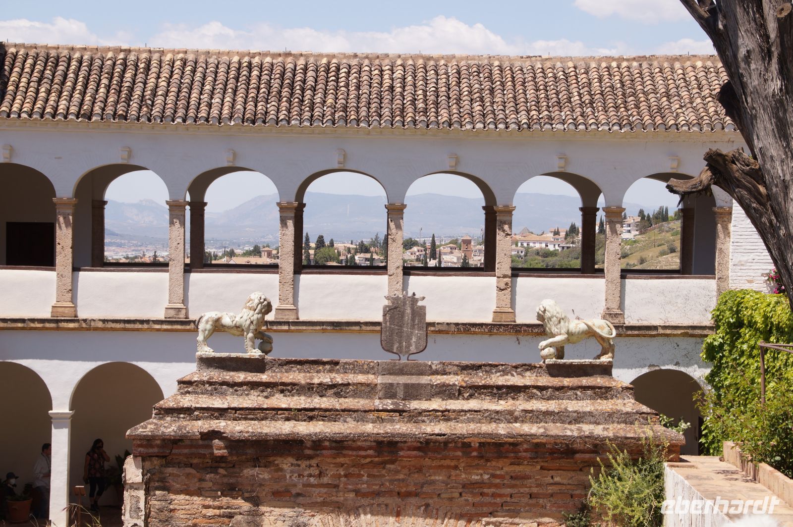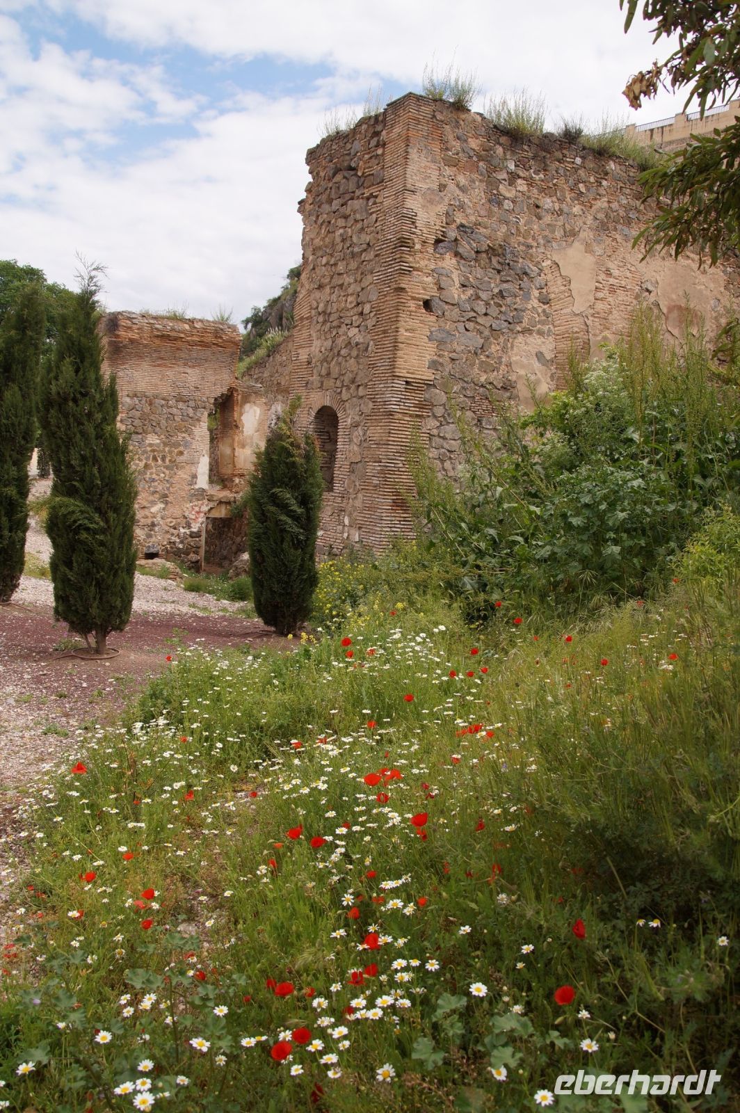 Normalerweise bitte ich die Busfahrer bei Ankunft in Granada am Mirador San Cristobal zu halten. Wir schauen dann von dort über die Altstadt rüber zur Alhambra und schauen uns noch den Aljibe (Brunnen) und die gleichnamige Kirche an, die teilweise aus Grabsteinen gemauert ist. Diesmal lag es nahe, dies bei der Abfahrt zu tun. Vom Aussichtspunkt selbst entfernten wir uns recht schnell, damit ein Hochzeitspaar sich ungestört fotografieren lassen konnte.