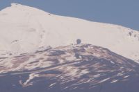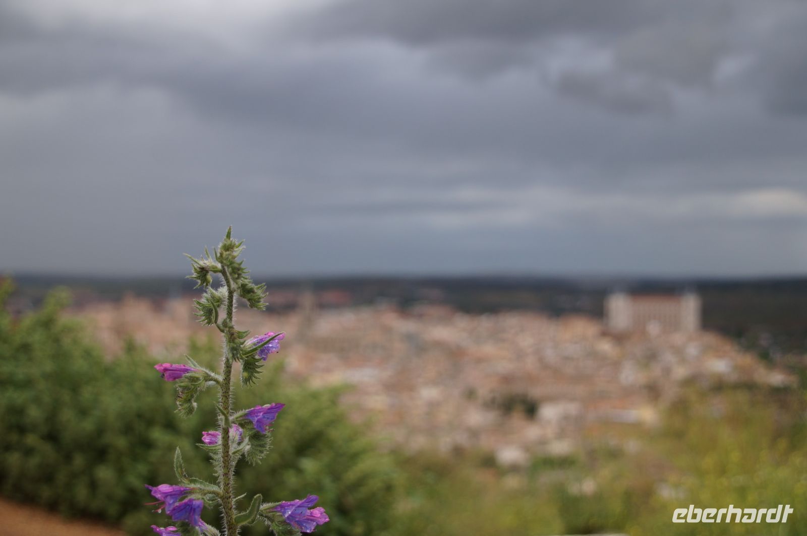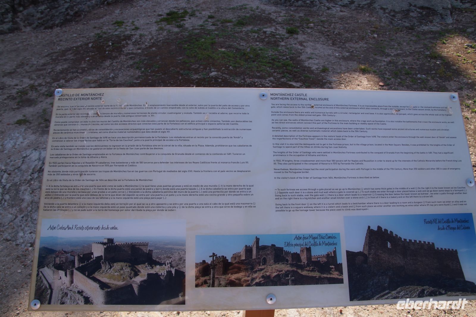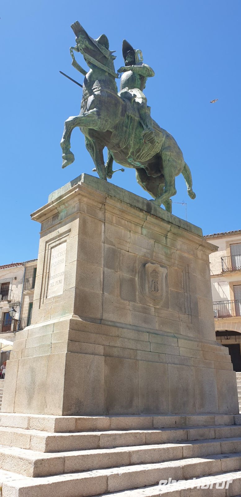 In Trujillo fuhr Santi an ein paar Polizisten und einer halbherzigen Absperrung, die dem Verkehr das Weiterfahren verbot, vorbei und setzte uns mitten auf der Plaza Mayor, unter dem Denkmal von Trujillos bekanntestem Sohn - Francisco Pizarro - ab. Von hier aus stiegen wir bergan, um die Burg von Trujillo zu erreichen. Die aber war... geschlossen. Nun ja, immerhin hatten wir von dort oben einen wunderschönen Blick auf die verschneite Sierra de Gredos und probierten die Pflanzenerkennungs-App von Frau F.