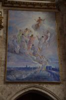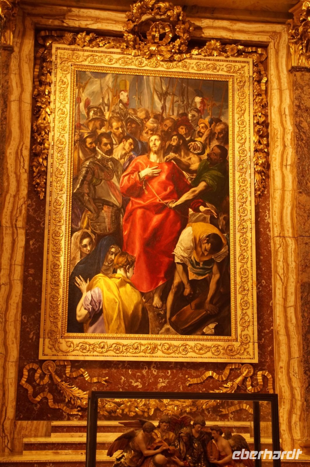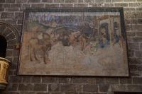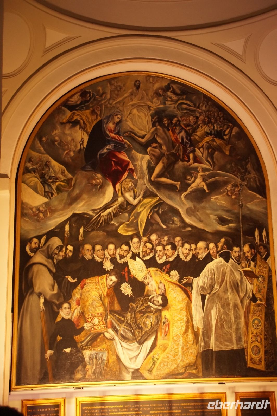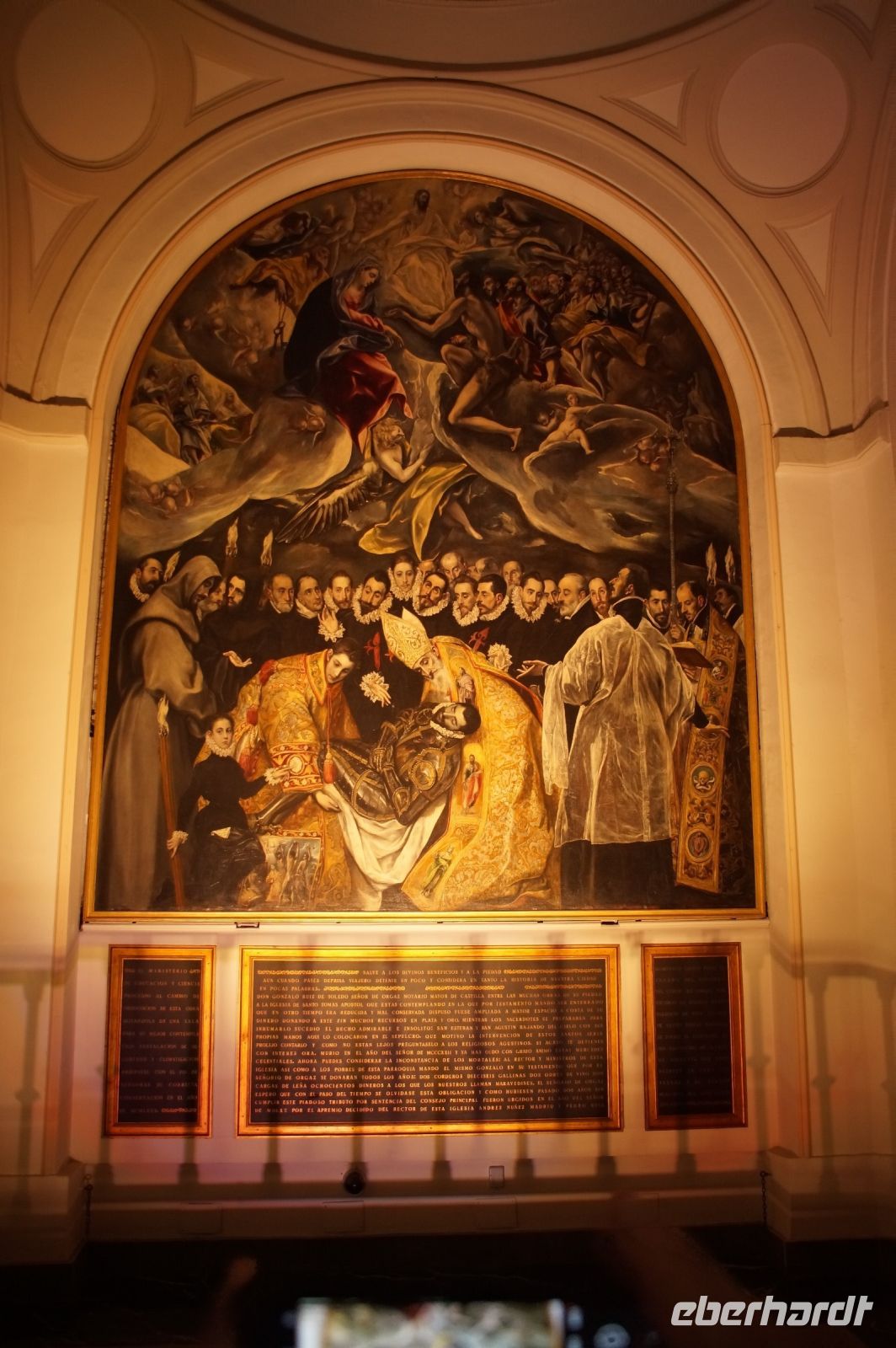 Unser nächstes Ziel war die Kirche Santo Tomé. Eigentlich nur eine Seitenkapelle derselben, in dieser wurde im 14. Jhdt. der Graf von Orgaz begraben. Der Graf hatte testamentarisch verfügt, dass das Dorf Orgaz der Kirche Santo Tomé jährlich 800 Goldmünzen sowie zwei Hammel, sechzehn Hühner, zwei Ziegenhäute Wein und zwei Ladungen Brennholz für den Unterhalt des Priesters und der Gemeindebediensteten sowie die Bedürftigen der Pfarrei abzuliefern habe. Das war natürlich - insbesondere der monetäre Anteil - sehr viel für das Dorf. Im 16. Jhdt. musste die Pfarrei die über 300 Jahre zuvor verfügten Zahlungen einklagen. Dass sie den Prozess gewann, führte dazu, dass die Grabkapelle des Grafen von Orgaz heute einer der toledanischen Besuchermagnete ist, denn so konnte der Pfarrer El Greco dafür bezahlen, die Beerdigung des Grafen von Orgaz, bei welcher der Legende zufolge der Heilige Stephanus und der Heilige Augustinus vom Himmel herabgestiegen waren, zu malen. Der Künstler verewigte auch gleich seinen Sohn und sich selbst in dem Gemälde.