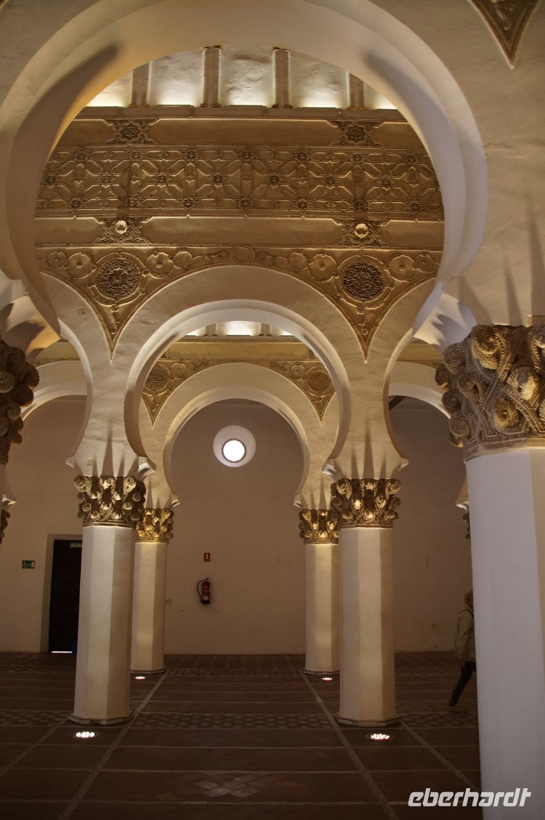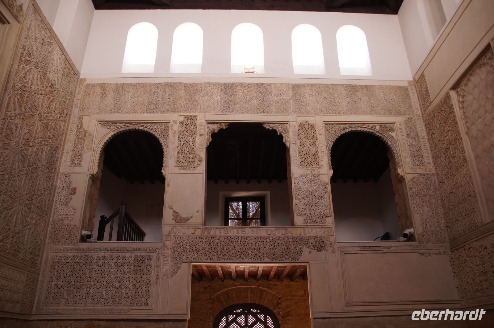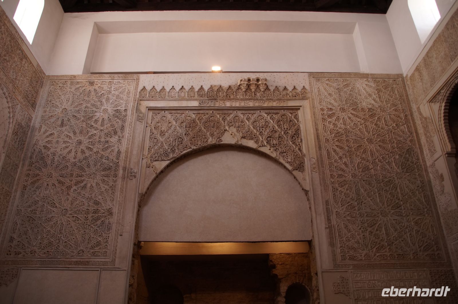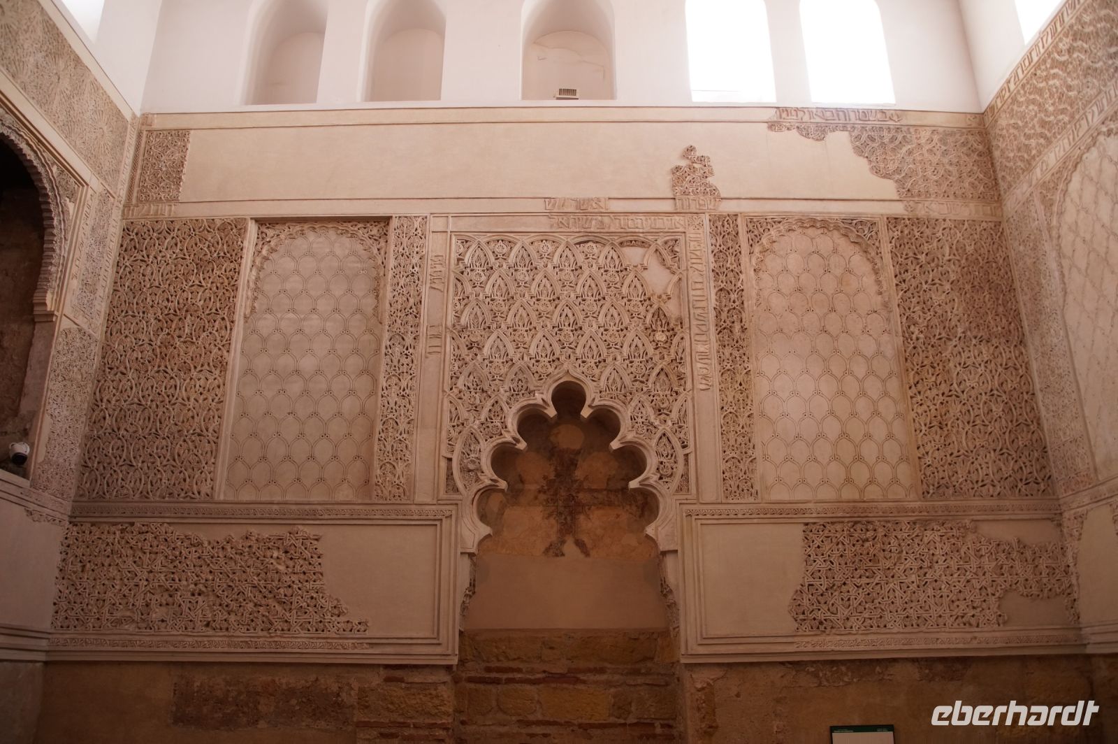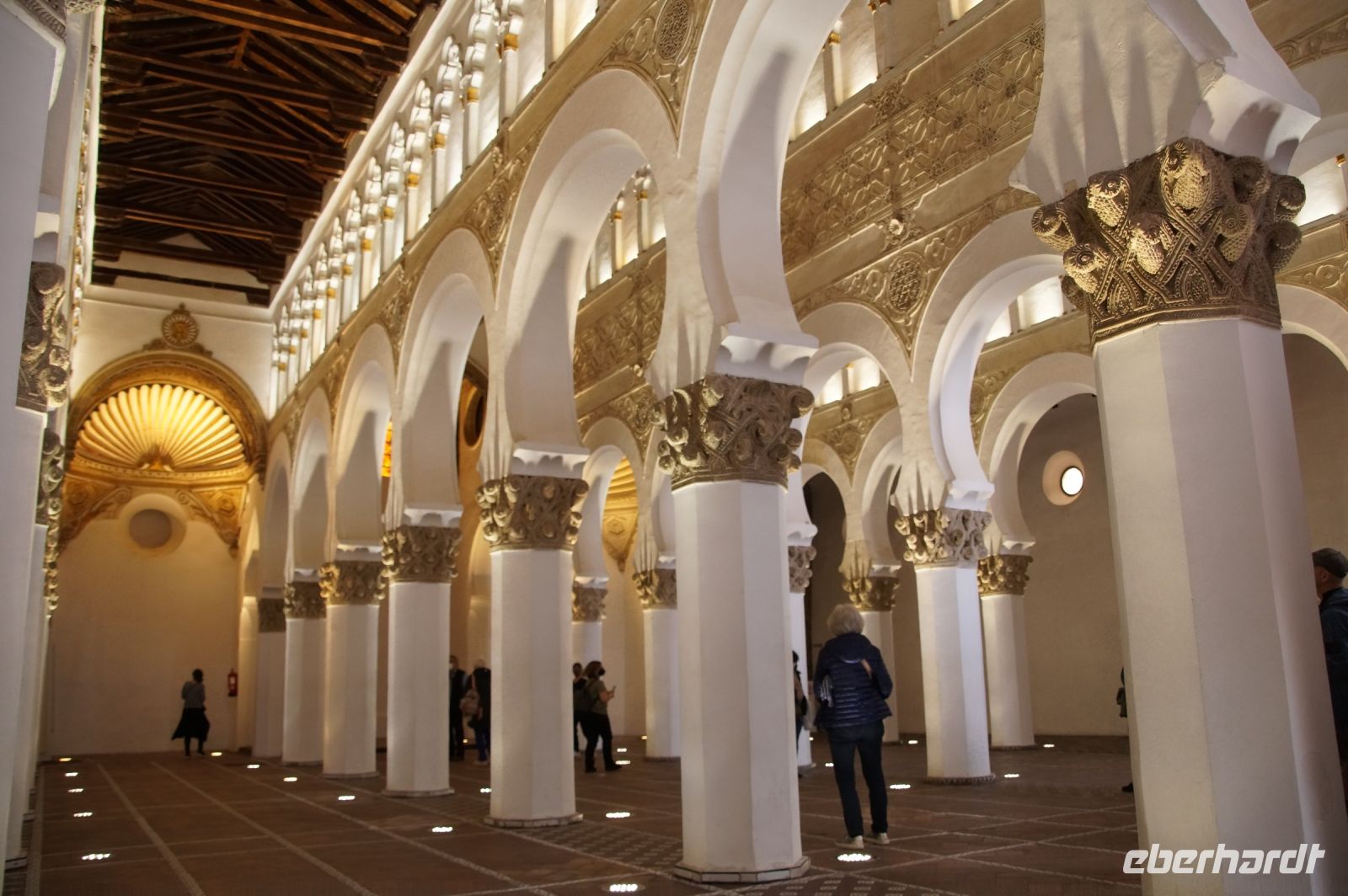 Die als Santa María la Blanca eine Zeit lang als Kirche benutzte Synagoge aus dem 12. Jahrhundert war ein nach außen hin unscheinbarer Bau, der sich im Innern als fünfschiffig erwies, mit meist runden, vorne aber auch spitzzulaufenden Hufeisenbögen. Ein in seiner Schlichtheit sehr schöner Bau, der seine Schönheit erst allmählich offenbarte. Denn man musste schon mit dem Blick den Säulen nach oben folgen, um über den Hufeisenbögen die prächtigsten Verzierungen zu sehen.