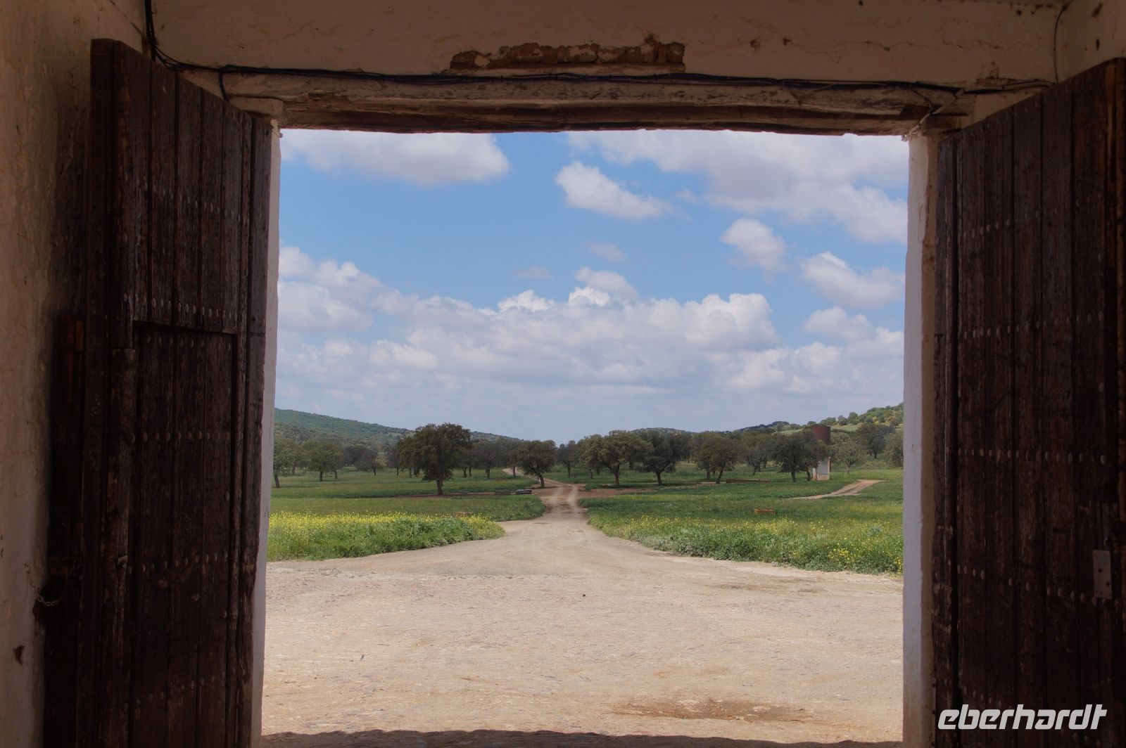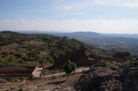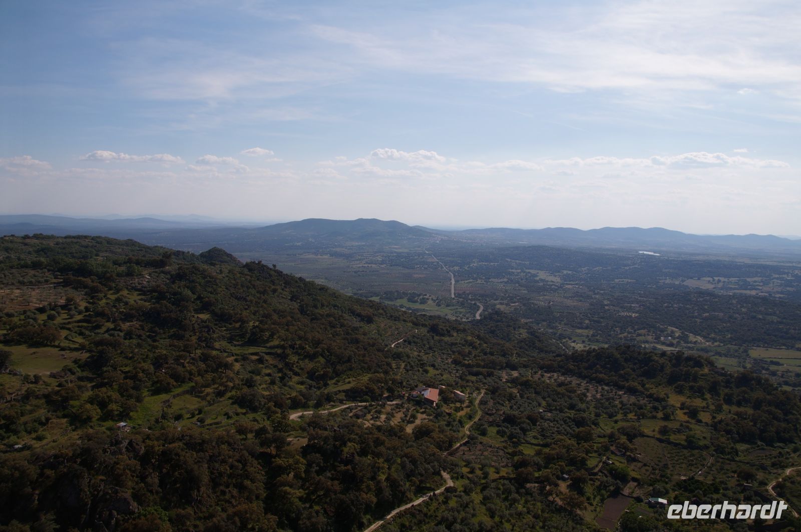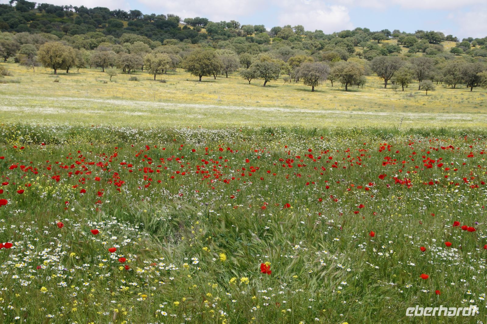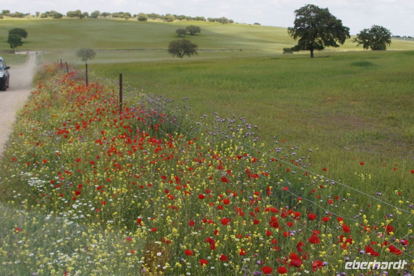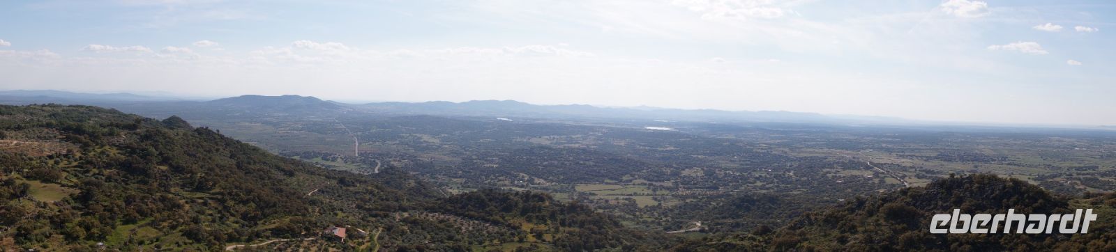 Wir fuhren zunächst einmal von Almagro aus eine durch die niedrigen Gebirge sich windende Straße, an verschiedenen iberischen Eichensorten (Korkeichen, Steineichen, portugiesische Eichen) vorbei und begleitet von wahren Blütenmeeren der weiß mit einem Stich rosa blühenden Zistrosen, welche den roten Mohn und die weiße Hundskamille der Felder in der Mancha abgelöst hatten.
