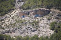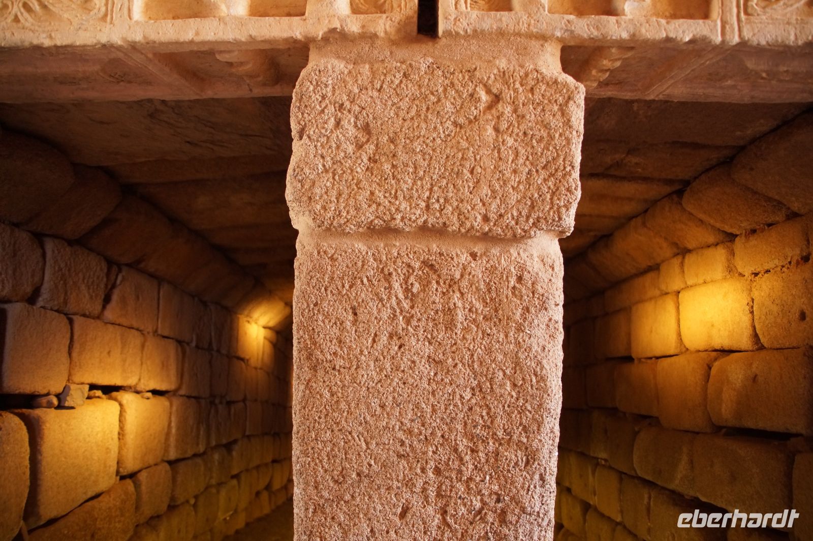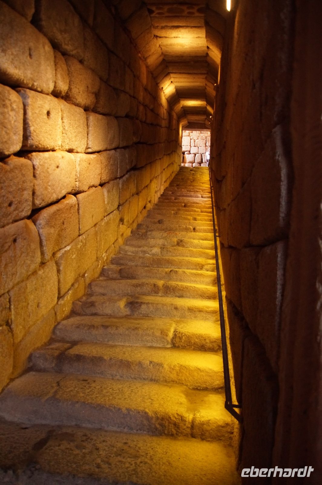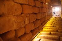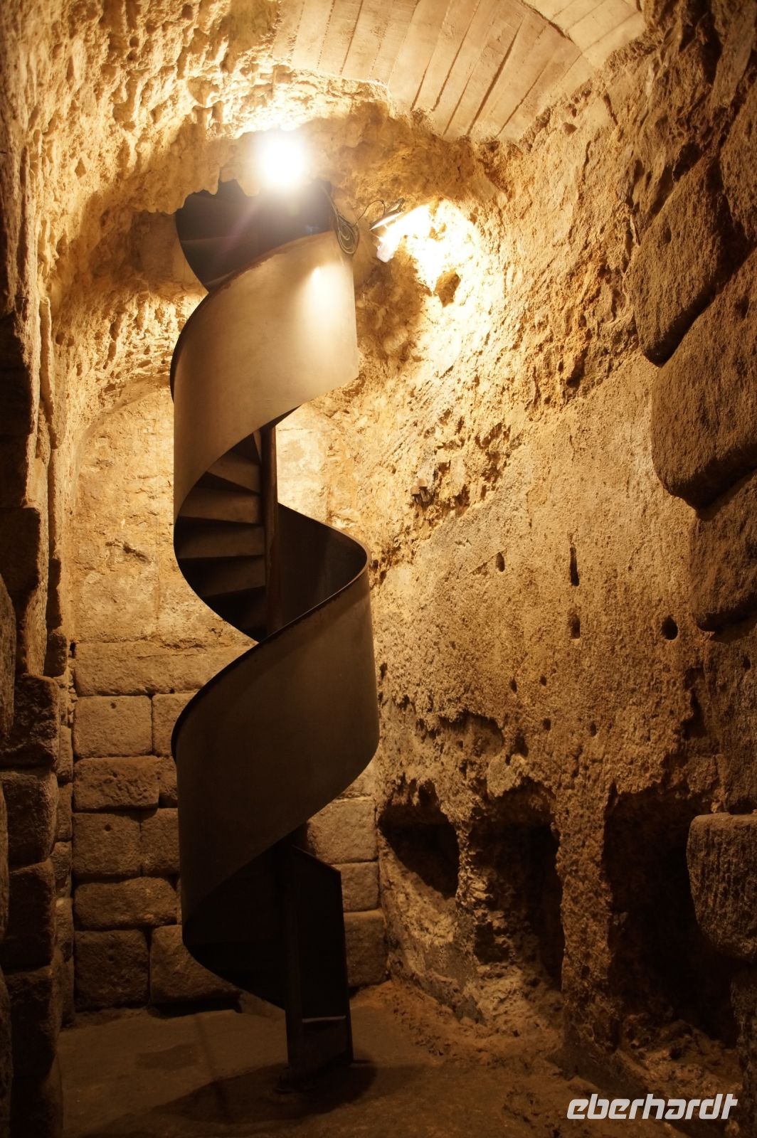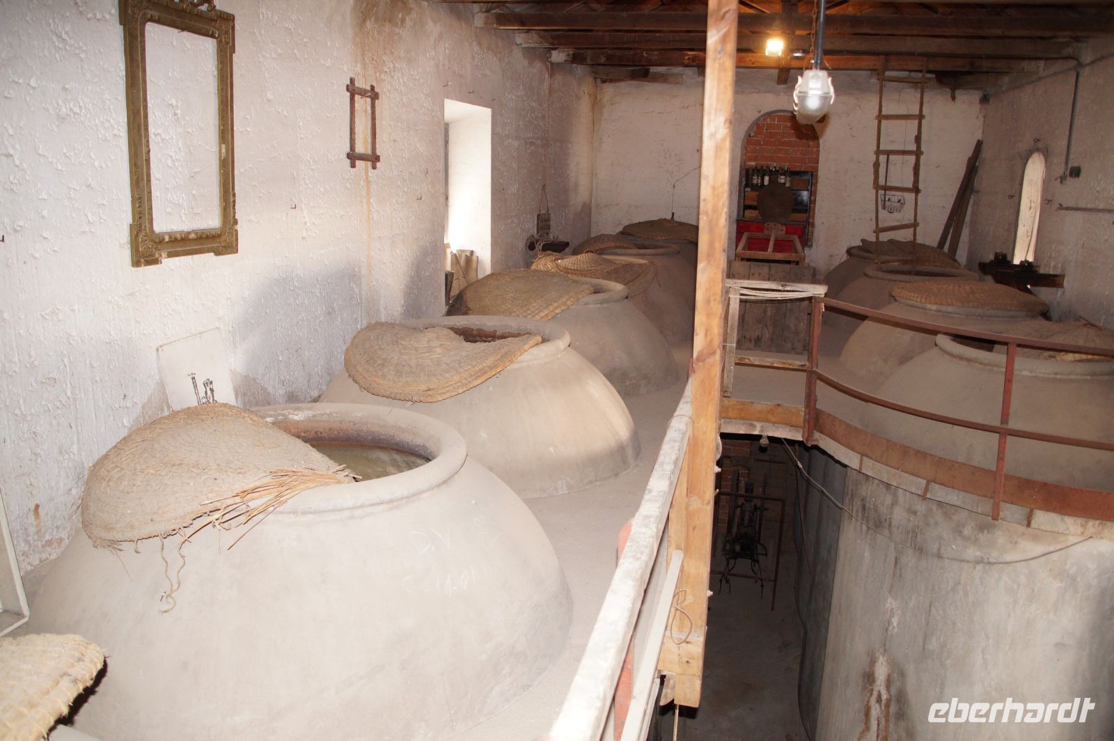 Danach ging es in die eigentliche Bodega. Dazu mussten wir eine Treppe in den Untergrund hinabsteigen, denn die Bodega ist in den anstehenden Kalkstein gehauen und befindet sich daher unterirdisch unter dem Betriebshof. Hier stehen noch die alten Tinajas, riesige Weinamphoren, in denen die Weine früher reiften. Da es erst kurz zuvor geregnet hatte - wir hatten ja selbst Regen in Madrid und Toledo mitbekommen - tropfte es hier oder dort mal von der Decke. Kalkstein ist eben wasserdurchlässig.