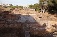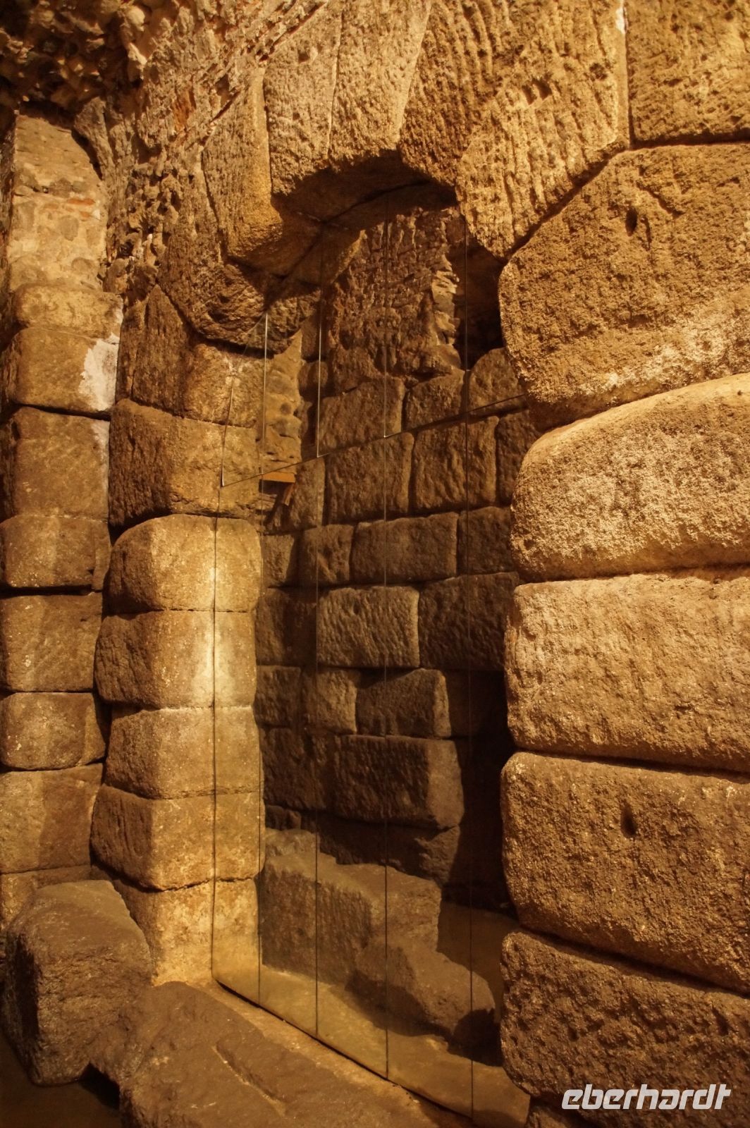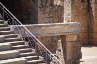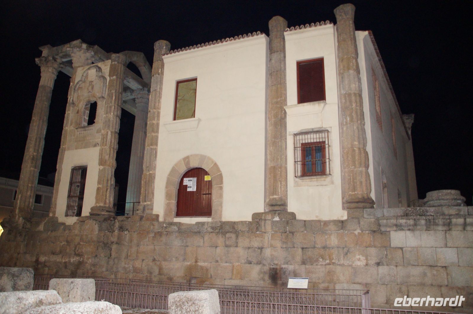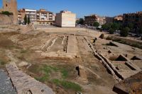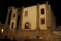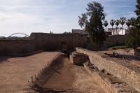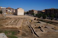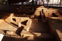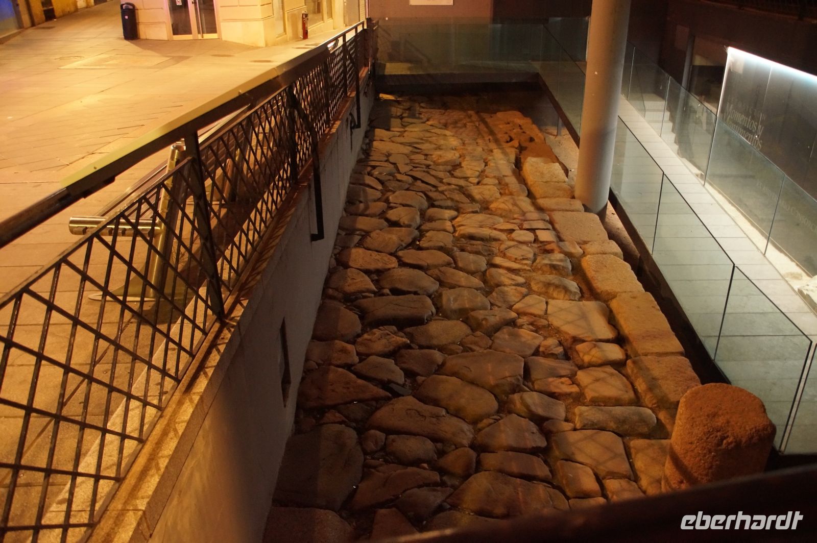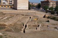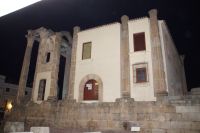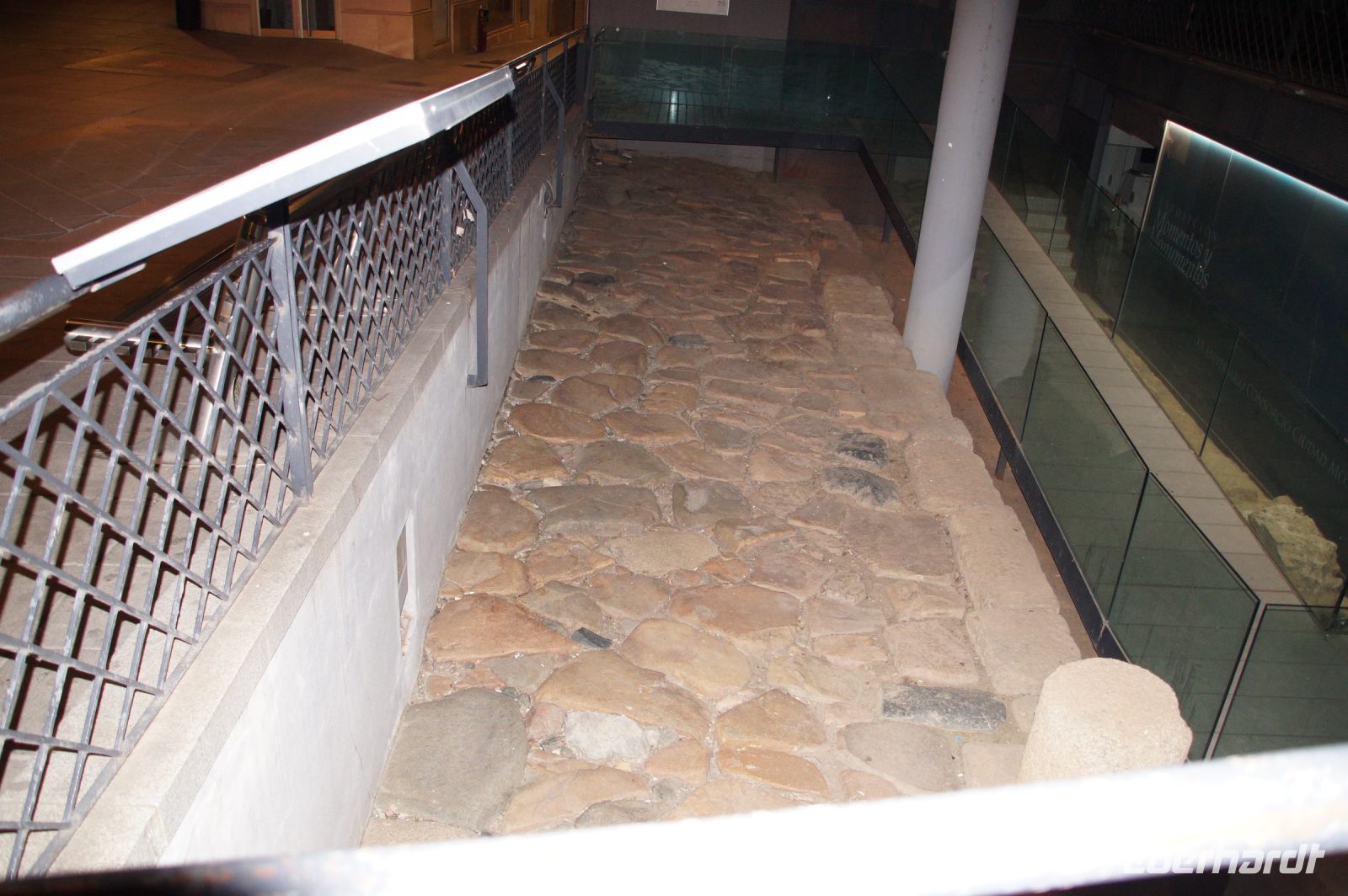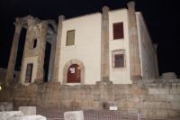 Hier stellt sich nun ein neues Problem: Wenn man den Diana-Tempel als Tempel für den Kaiserkult versteht, kann der Trajansbogen nicht den Eingang zum Provinzialforum darstellen, bzw, der Tempel für den Kaiserkult sollte auf dem Gelände des Provinzialforums gestanden haben. Hier beißen sich die Interpretationen. Mérida ist eine Stadt mit einer nun bereits über 2000jährigen Geschichte, in der durchgängig Menschen leben. Insofern ist es für die Archäologen schwer, ihre Thesen einfach mal zu überprüfen und den ganzen neumodischen Kram, der über den römischen Fundamenten steht, zu entfernen. Aber wir sahen eben auch, was passiert, wenn man heute in Mérida bauen möchte: Javier lud uns ein, mal etwas näher an ein großes, schmuckloses Haus mit dunklen Fenstern heranzutreten: Erst jetzt sahen wir, was sich hinter den Fenstern verbarg, wir wären gnadenlos daran vorbeigelaufen: Römische Fundamente lagen vor uns. Hier war eine Tiefgarage geplant worden - da muss man mit rechnen, dass solche "Überraschungen" auf einen zukommmen, wenn man in historischen Altstädten Großprojekte plant.