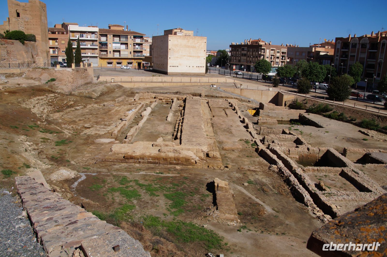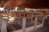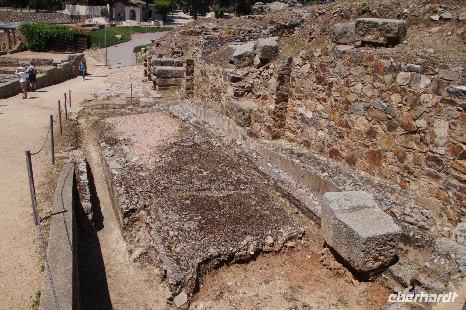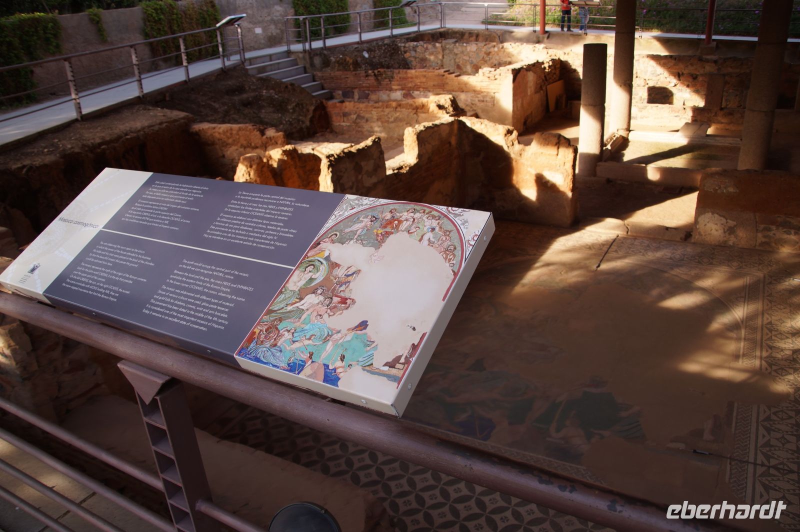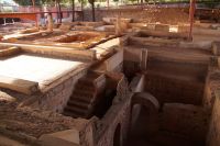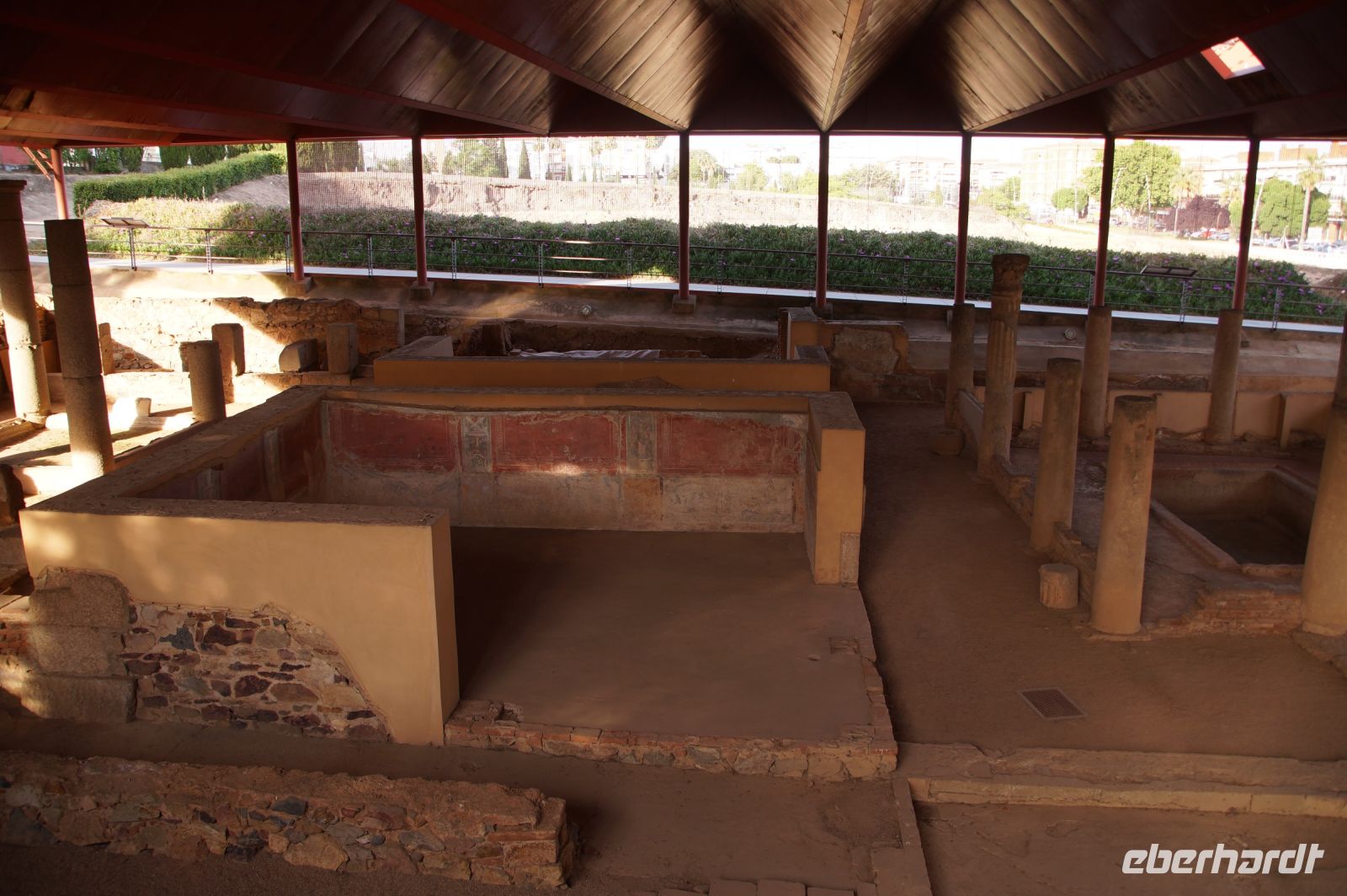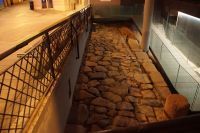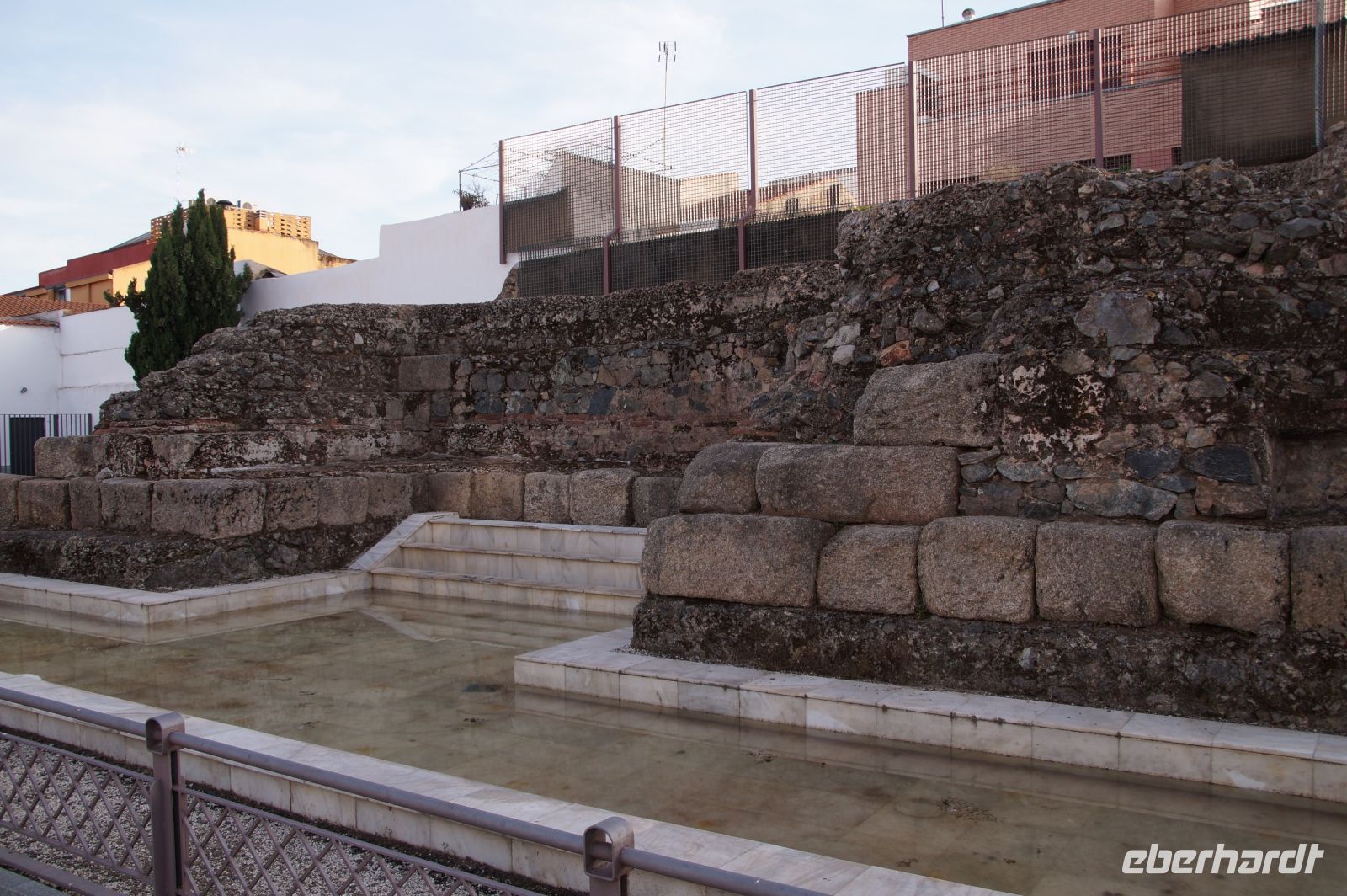 Hier stellt sich nun ein neues Problem: Wenn man den Diana-Tempel als Tempel für den Kaiserkult versteht, kann der Trajansbogen nicht den Eingang zum Provinzialforum darstellen, bzw, der Tempel für den Kaiserkult sollte auf dem Gelände des Provinzialforums gestanden haben. Hier beißen sich die Interpretationen. Mérida ist eine Stadt mit einer nun bereits über 2000jährigen Geschichte, in der durchgängig Menschen leben. Insofern ist es für die Archäologen schwer, ihre Thesen einfach mal zu überprüfen und den ganzen neumodischen Kram, der über den römischen Fundamenten steht, zu entfernen. Aber wir sahen eben auch, was passiert, wenn man heute in Mérida bauen möchte: Javier lud uns ein, mal etwas näher an ein großes, schmuckloses Haus mit dunklen Fenstern heranzutreten: Erst jetzt sahen wir, was sich hinter den Fenstern verbarg, wir wären gnadenlos daran vorbeigelaufen: Römische Fundamente lagen vor uns. Hier war eine Tiefgarage geplant worden - da muss man mit rechnen, dass solche "Überraschungen" auf einen zukommmen, wenn man in historischen Altstädten Großprojekte plant.