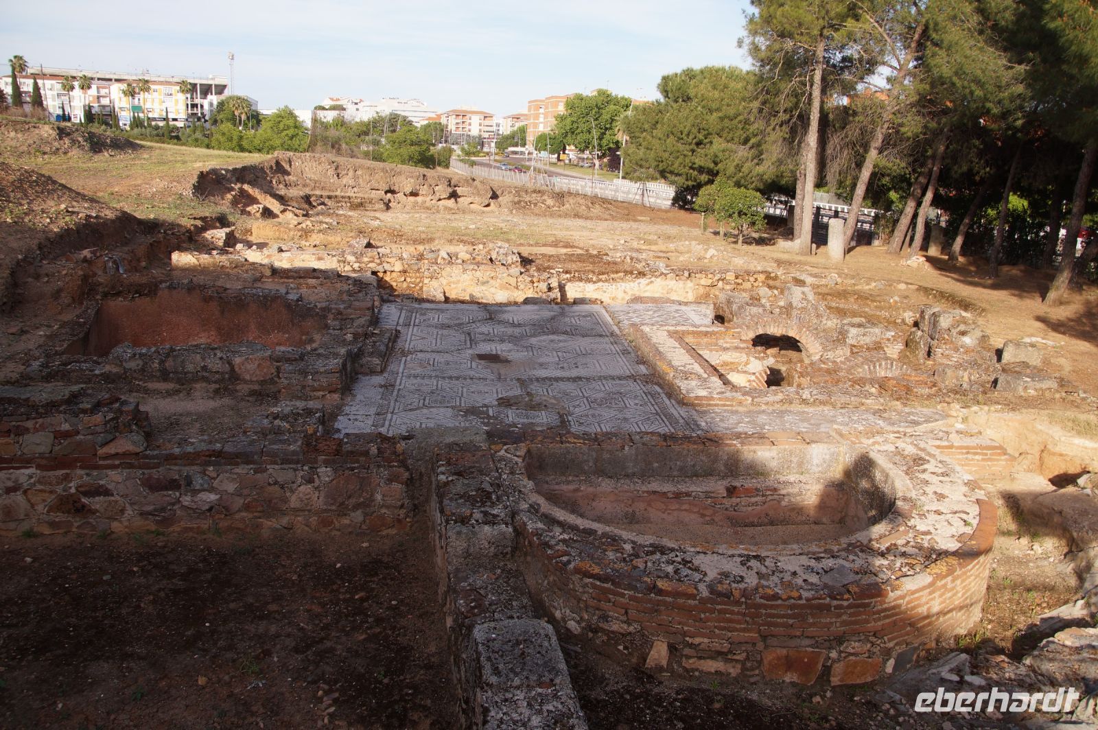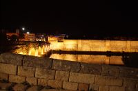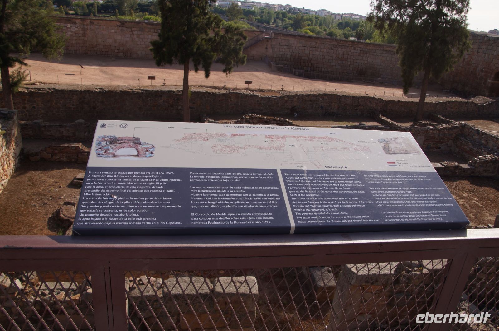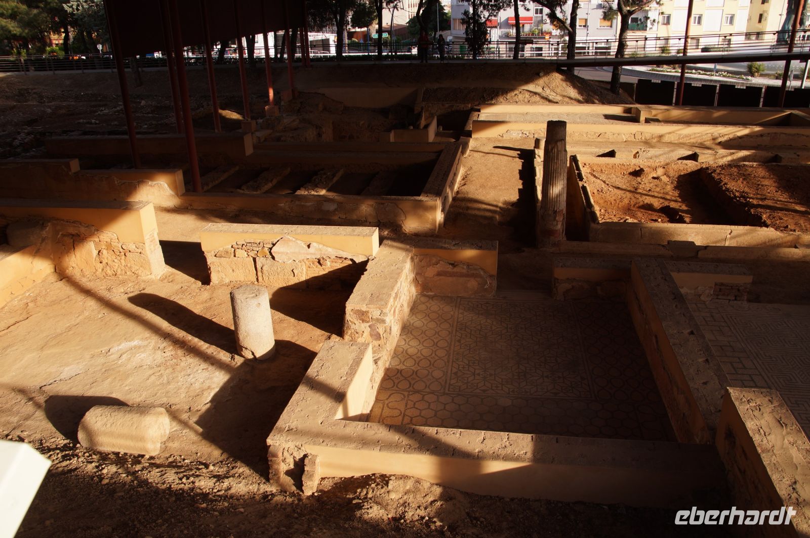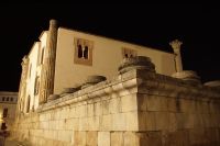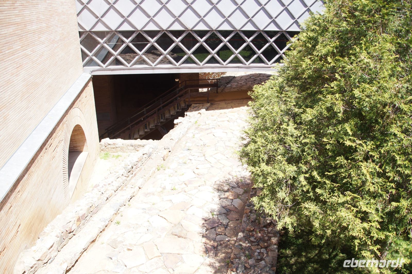 Hier stellt sich nun ein neues Problem: Wenn man den Diana-Tempel als Tempel für den Kaiserkult versteht, kann der Trajansbogen nicht den Eingang zum Provinzialforum darstellen, bzw, der Tempel für den Kaiserkult sollte auf dem Gelände des Provinzialforums gestanden haben. Hier beißen sich die Interpretationen. Mérida ist eine Stadt mit einer nun bereits über 2000jährigen Geschichte, in der durchgängig Menschen leben. Insofern ist es für die Archäologen schwer, ihre Thesen einfach mal zu überprüfen und den ganzen neumodischen Kram, der über den römischen Fundamenten steht, zu entfernen. Aber wir sahen eben auch, was passiert, wenn man heute in Mérida bauen möchte: Javier lud uns ein, mal etwas näher an ein großes, schmuckloses Haus mit dunklen Fenstern heranzutreten: Erst jetzt sahen wir, was sich hinter den Fenstern verbarg, wir wären gnadenlos daran vorbeigelaufen: Römische Fundamente lagen vor uns. Hier war eine Tiefgarage geplant worden - da muss man mit rechnen, dass solche "Überraschungen" auf einen zukommmen, wenn man in historischen Altstädten Großprojekte plant.
