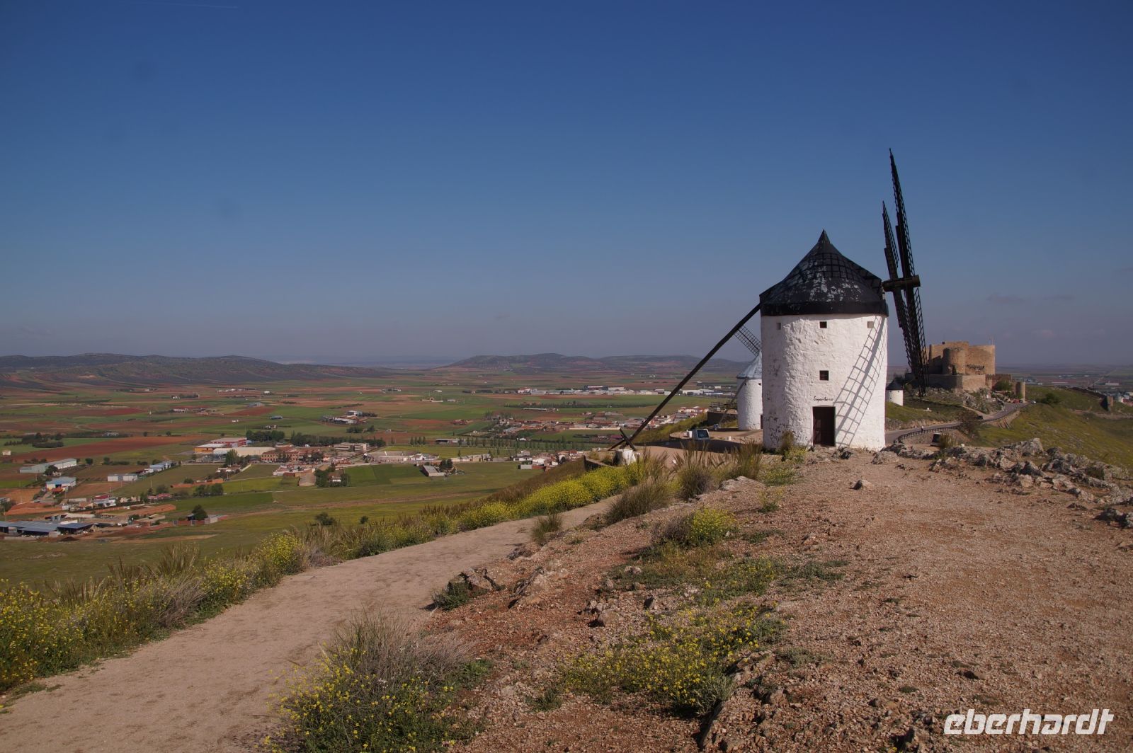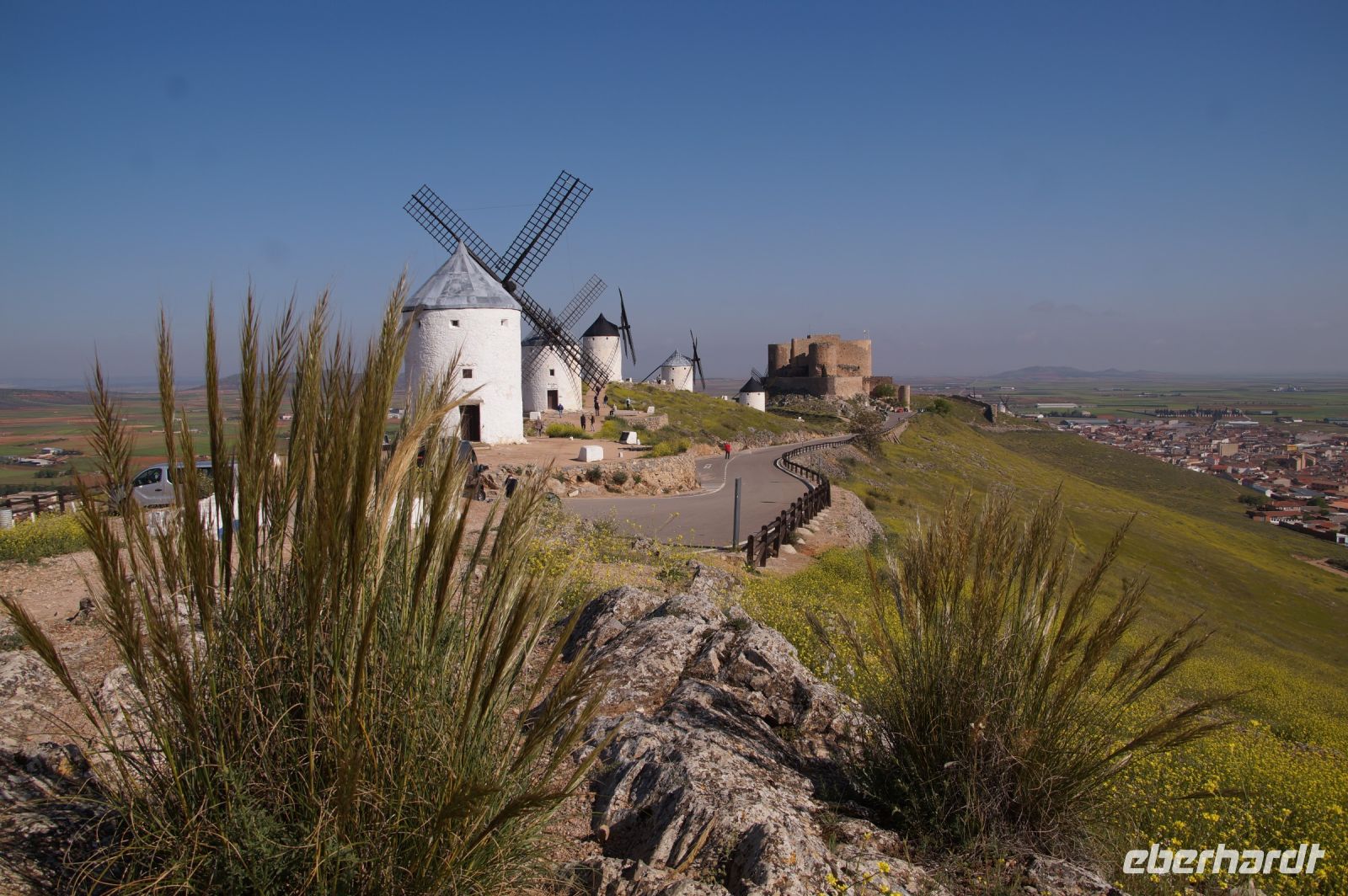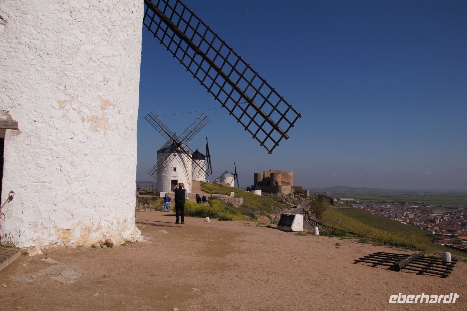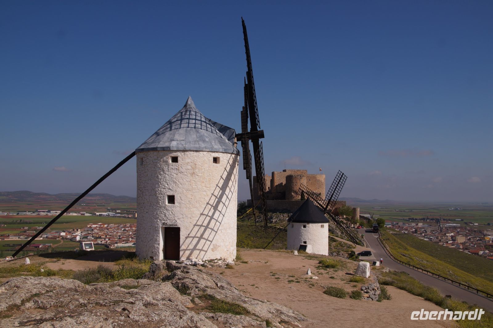 Heute ging es von Toledo in Richtung Süden. Unser erstes Ziel war die Kleinstadt Consuegra. Also nicht im eigentlichen Sinne die Stadt selbst, die unterhalb eines langgestreckten Hügels - dem Cerro Caldérico - liegt, sondern vielmehr der Hügel, denn auf diesem reihen sich links und rechts der alten Kreuzritterburg der Johanniter, dem Castillo de Muela, zwölf Mühlen auf, wegen derer Consuegra sich als Schauplatz des Kampfes des Don Quijote gegen die schrecklichen Riesen mit den furchtbar herumduchtelnden Armen verkauft. Aber nein, dieser Kampf gegen Windmühlen fand nach Cervantes auf dem etwa 100 km entfernten Campo de Montiel statt. Nichtsdestotrotz ist das Mühlenpanorama mit Burg natürlich berühmt und steht für Kastilien-LaMancha, dem Burgenland welches wir mit Spaniens bekanntester literarischer Figur, dem Don Quijote verbinden.