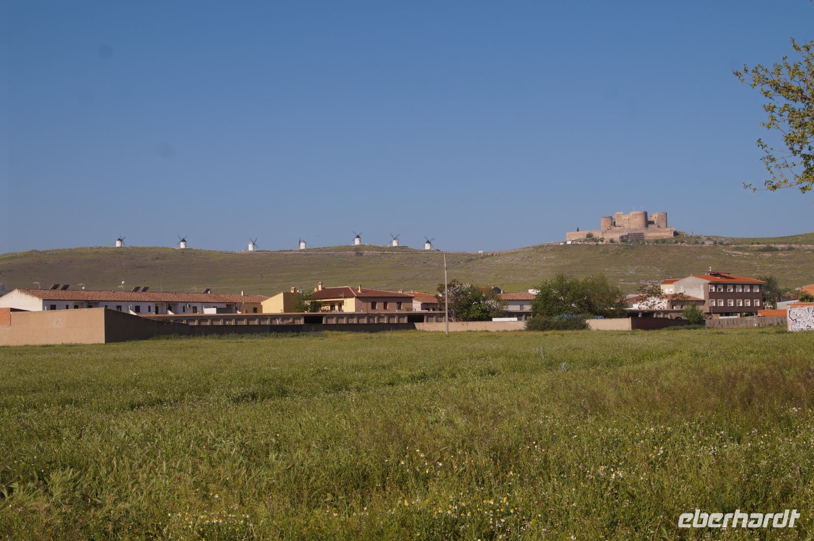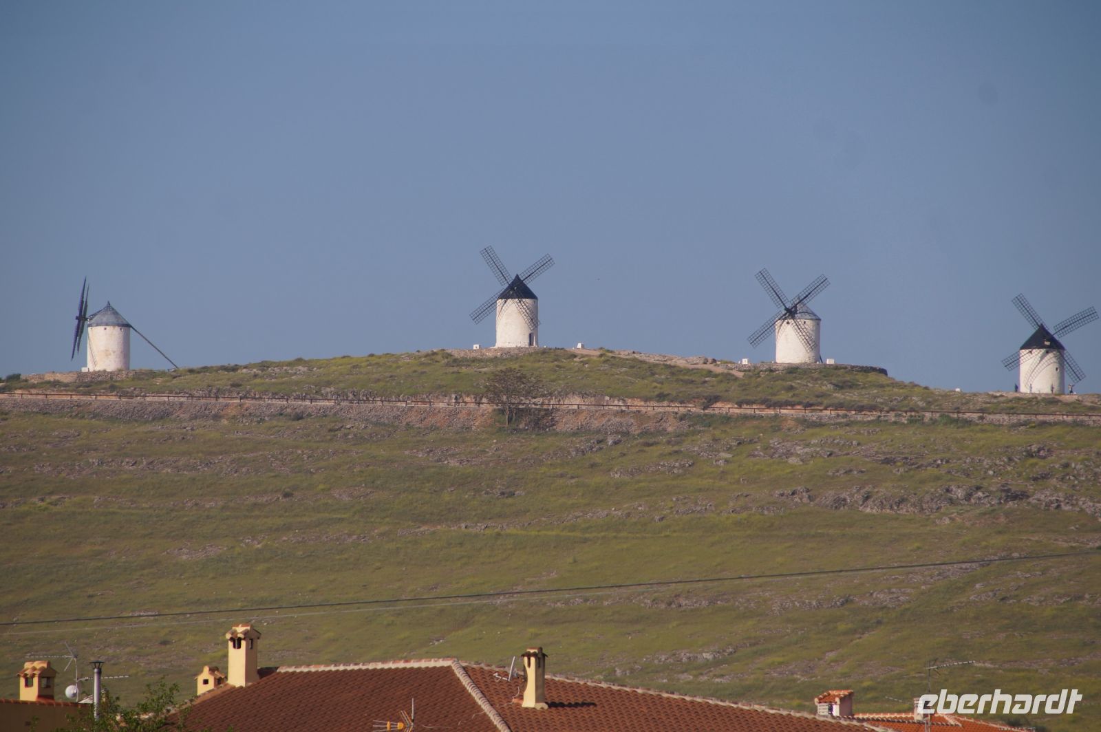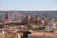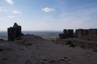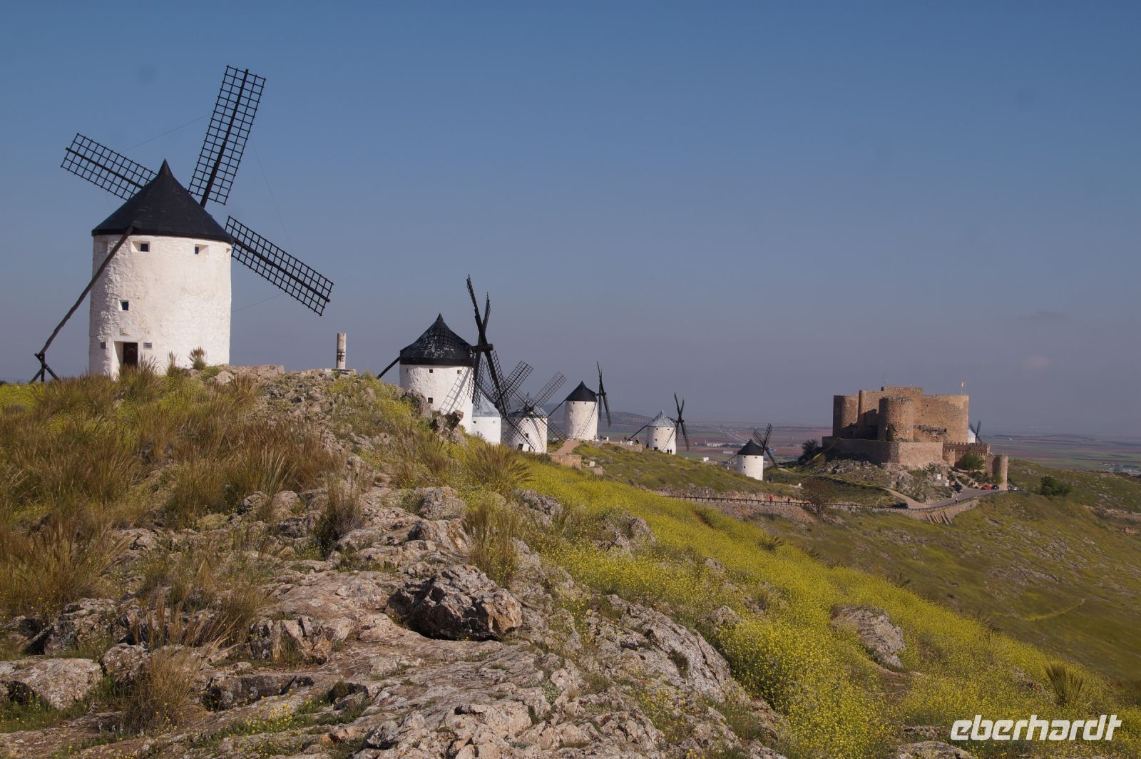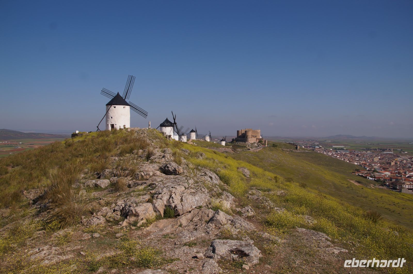 Heute ging es von Toledo in Richtung Süden. Unser erstes Ziel war die Kleinstadt Consuegra. Also nicht im eigentlichen Sinne die Stadt selbst, die unterhalb eines langgestreckten Hügels - dem Cerro Caldérico - liegt, sondern vielmehr der Hügel, denn auf diesem reihen sich links und rechts der alten Kreuzritterburg der Johanniter, dem Castillo de Muela, zwölf Mühlen auf, wegen derer Consuegra sich als Schauplatz des Kampfes des Don Quijote gegen die schrecklichen Riesen mit den furchtbar herumduchtelnden Armen verkauft. Aber nein, dieser Kampf gegen Windmühlen fand nach Cervantes auf dem etwa 100 km entfernten Campo de Montiel statt. Nichtsdestotrotz ist das Mühlenpanorama mit Burg natürlich berühmt und steht für Kastilien-LaMancha, dem Burgenland welches wir mit Spaniens bekanntester literarischer Figur, dem Don Quijote verbinden.