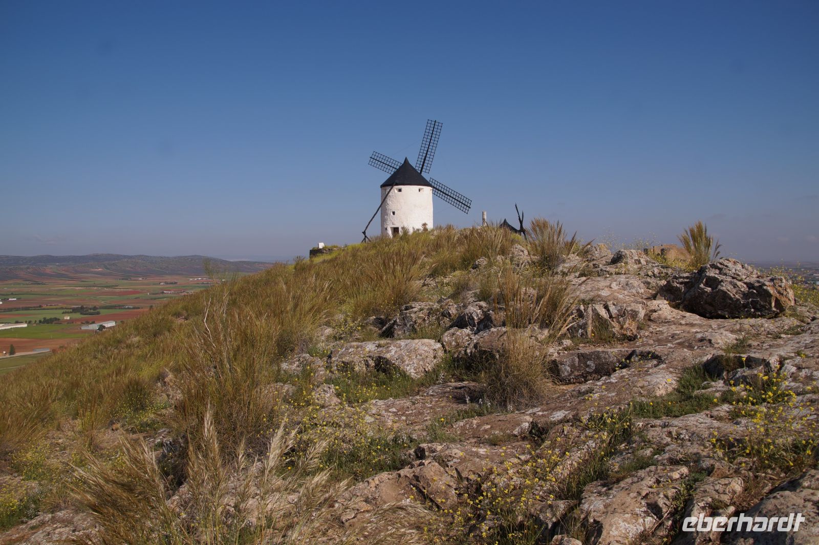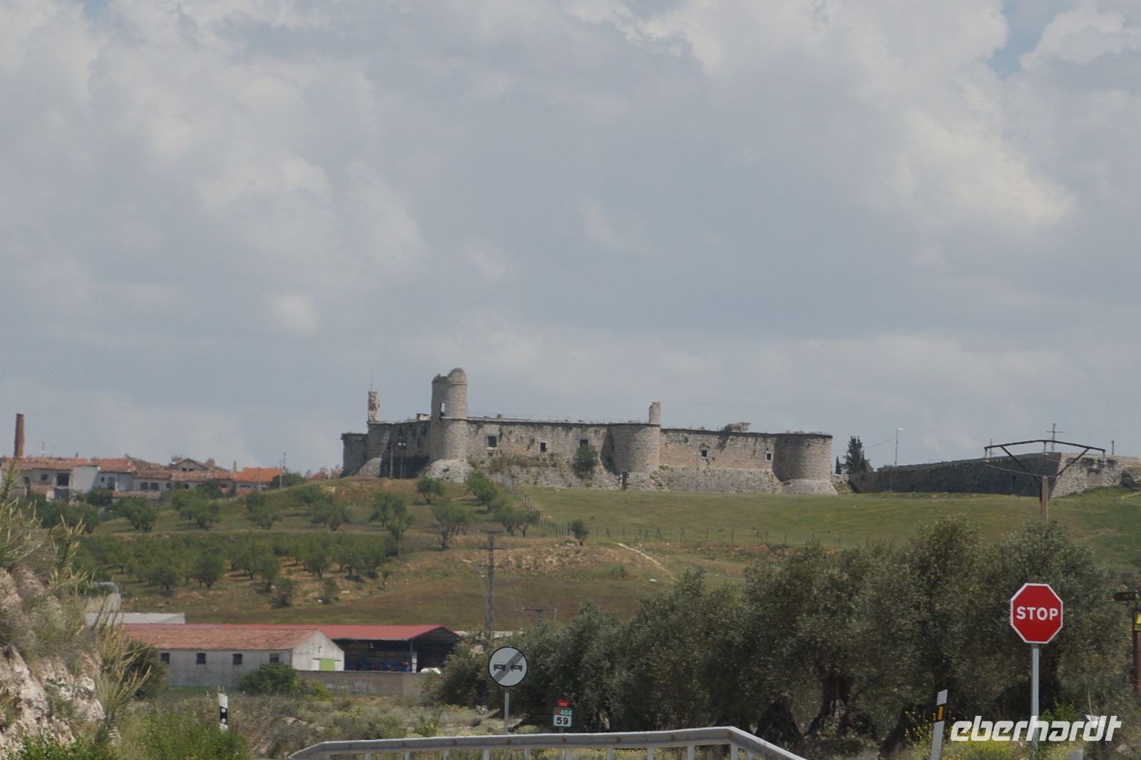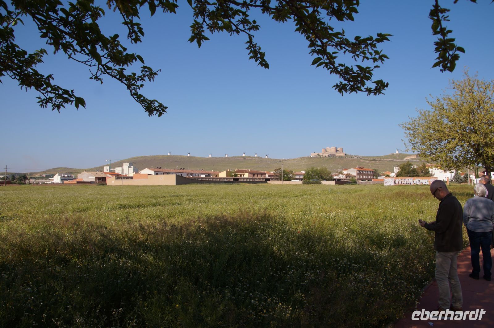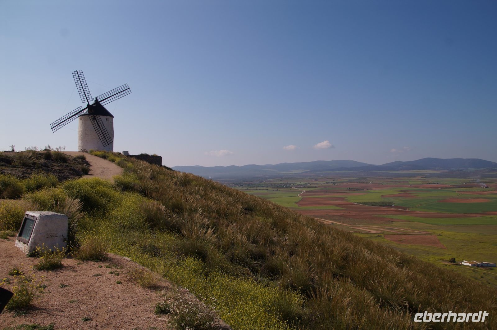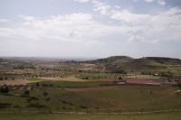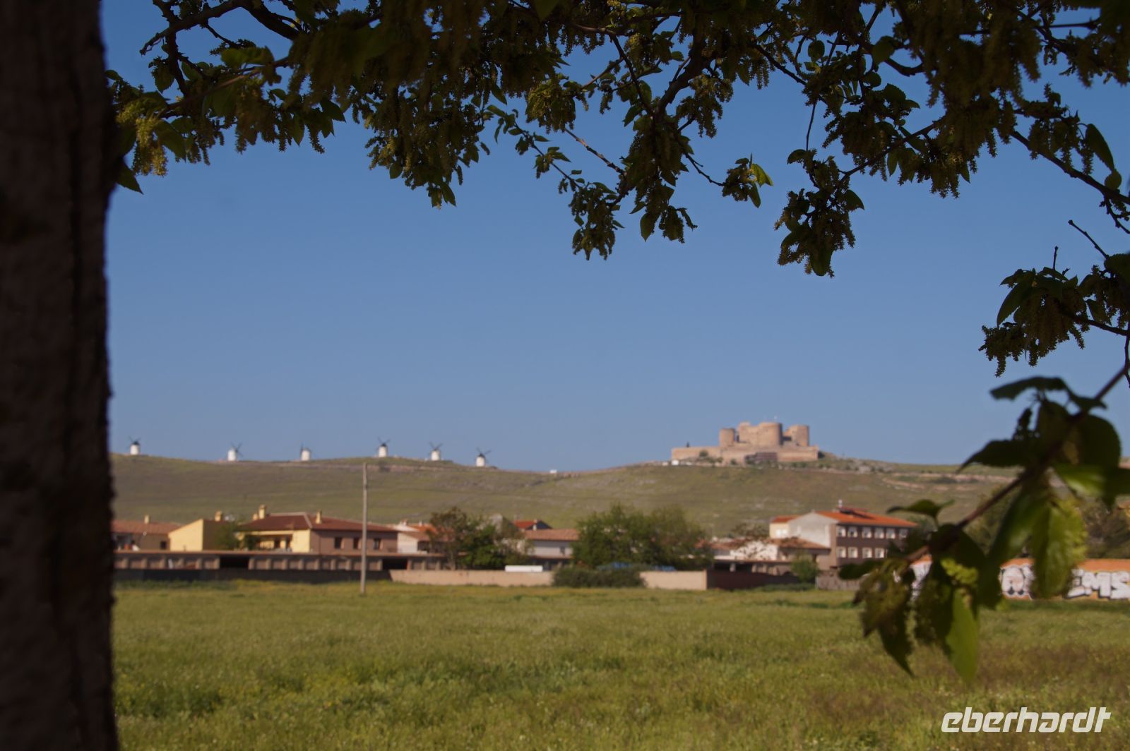Heute ging es von Toledo in Richtung Süden. Unser erstes Ziel war die Kleinstadt Consuegra. Also nicht im eigentlichen Sinne die Stadt selbst, die unterhalb eines langgestreckten Hügels - dem Cerro Caldérico - liegt, sondern vielmehr der Hügel, denn auf diesem reihen sich links und rechts der alten Kreuzritterburg der Johanniter, dem Castillo de Muela, zwölf Mühlen auf, wegen derer Consuegra sich als Schauplatz des Kampfes des Don Quijote gegen die schrecklichen Riesen mit den furchtbar herumduchtelnden Armen verkauft. Aber nein, dieser Kampf gegen Windmühlen fand nach Cervantes auf dem etwa 100 km entfernten Campo de Montiel statt. Nichtsdestotrotz ist das Mühlenpanorama mit Burg natürlich berühmt und steht für Kastilien-LaMancha, dem Burgenland welches wir mit Spaniens bekanntester literarischer Figur, dem Don Quijote verbinden.