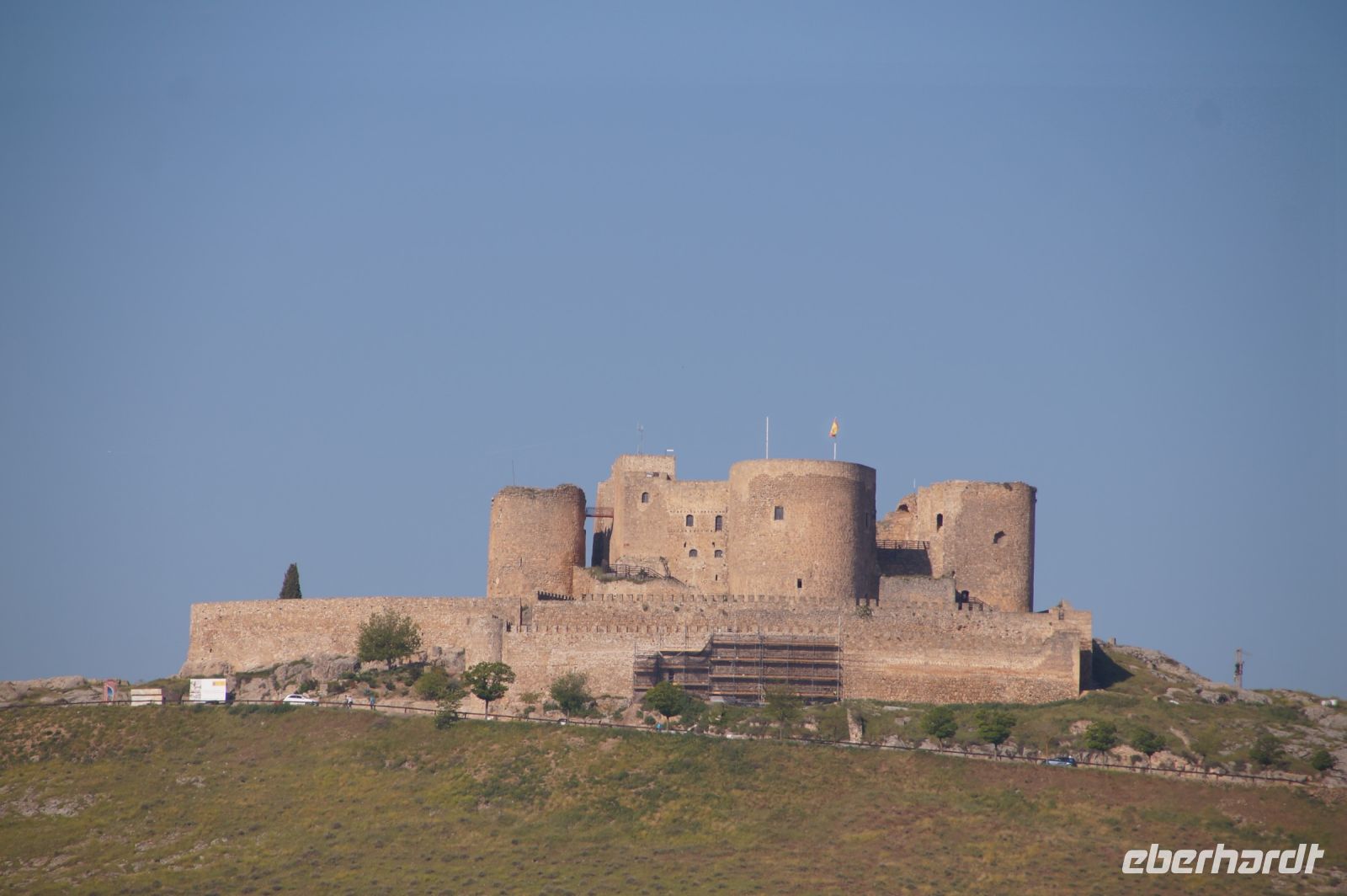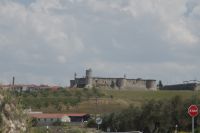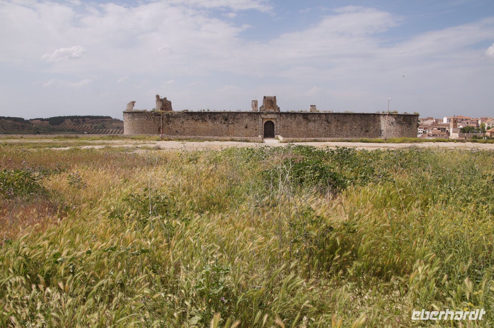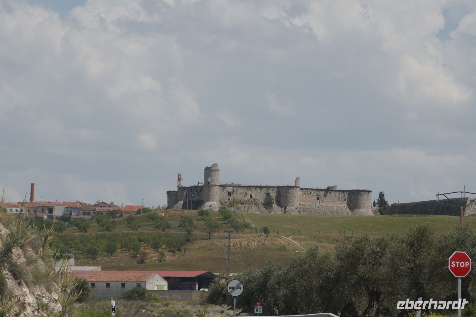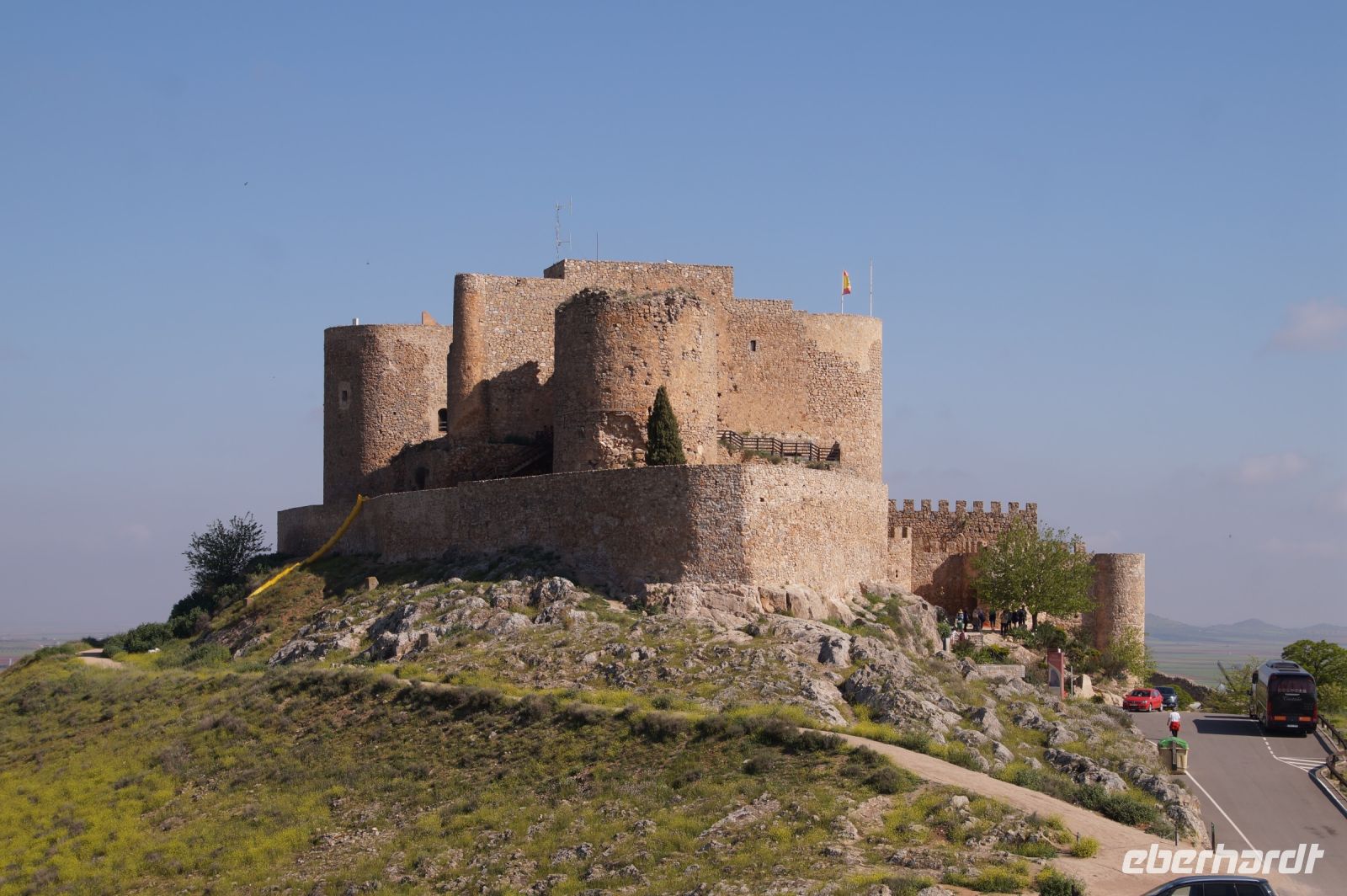 Heute ging es von Toledo in Richtung Süden. Unser erstes Ziel war die Kleinstadt Consuegra. Also nicht im eigentlichen Sinne die Stadt selbst, die unterhalb eines langgestreckten Hügels - dem Cerro Caldérico - liegt, sondern vielmehr der Hügel, denn auf diesem reihen sich links und rechts der alten Kreuzritterburg der Johanniter, dem Castillo de Muela, zwölf Mühlen auf, wegen derer Consuegra sich als Schauplatz des Kampfes des Don Quijote gegen die schrecklichen Riesen mit den furchtbar herumduchtelnden Armen verkauft. Aber nein, dieser Kampf gegen Windmühlen fand nach Cervantes auf dem etwa 100 km entfernten Campo de Montiel statt. Nichtsdestotrotz ist das Mühlenpanorama mit Burg natürlich berühmt und steht für Kastilien-LaMancha, dem Burgenland welches wir mit Spaniens bekanntester literarischer Figur, dem Don Quijote verbinden.
