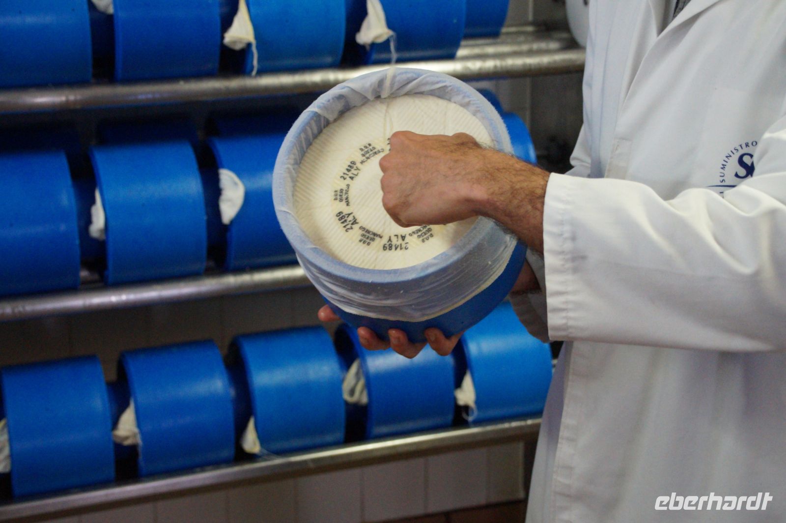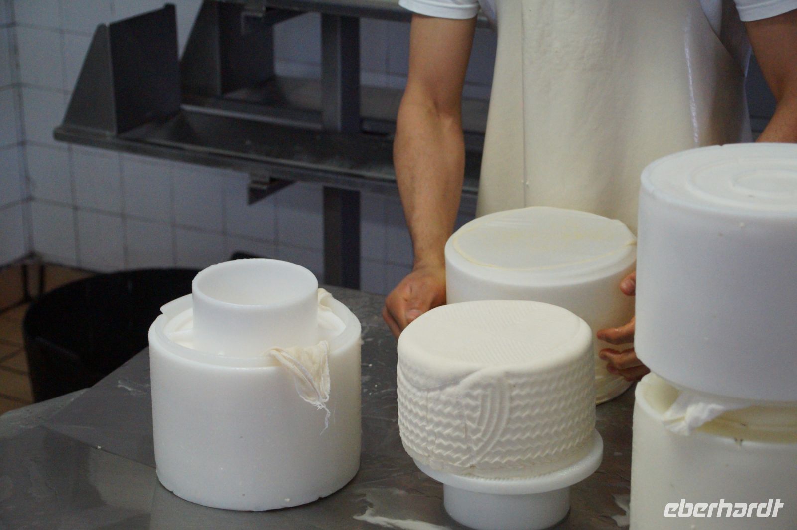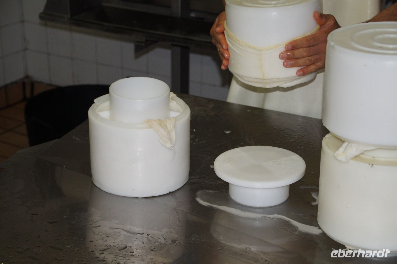 Im Zylinder werden die Käse regelmäßig gewendet und gepresst. Das dauert zwischen einer und sechs Stunden. Jetzt bekommen die Käse ihren Stempel mit der Identifikationsnummer und die Käse kommen in eine Salzlake, in der sie etwa zwölf Stunden herumdümpeln.