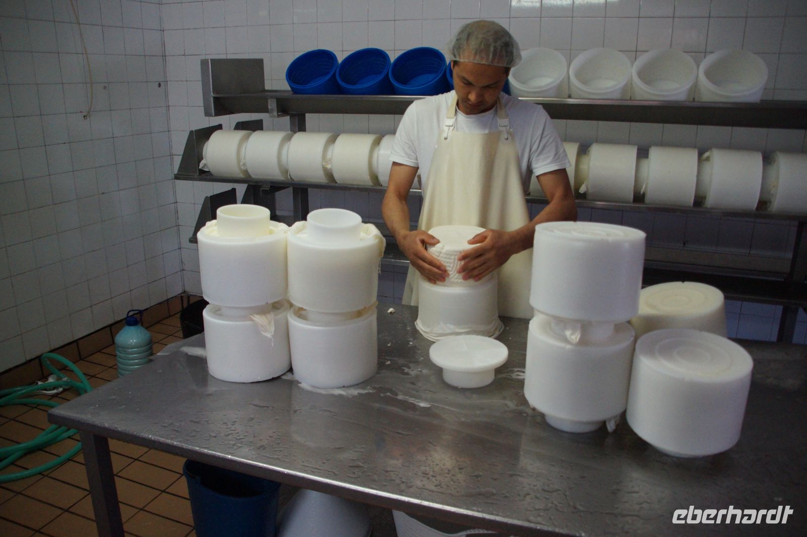 In der Käserei wird die Rohmilch dann auf 28° - 32° - man möchte gar nicht sagen "erhitzt" - temperiert, um den Gerinnungsprozess in Gang zu setzen. Es entsteht ein Käsebruch, wobei die Korngröße des entstehenden Bruchs mit Milchreiskörnern vergleichbar ist. Früher wurde der Bruch nun in zylindrische Körbe aus Espartogras gefüllt, heute benutzt man dafür Plastikzylinder, welche aber die Flechtmusterung der Espartograskörbe imitieren. Der Kunde möchte ja ein traditionelles, natürliches Produkt.