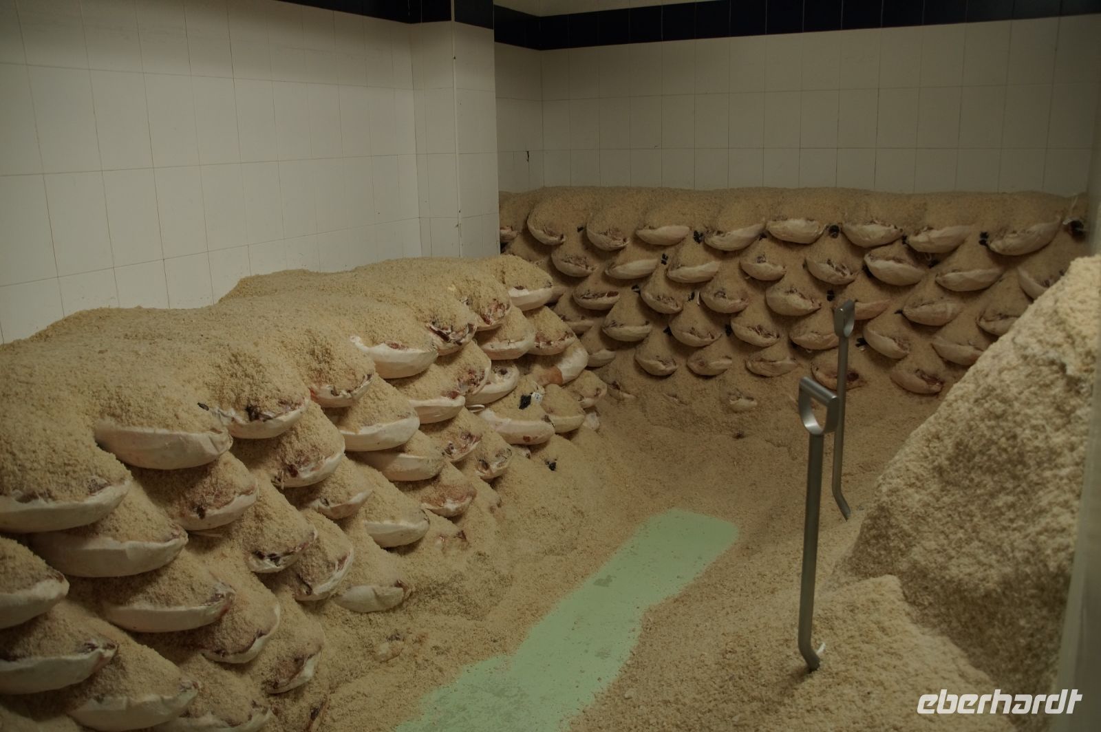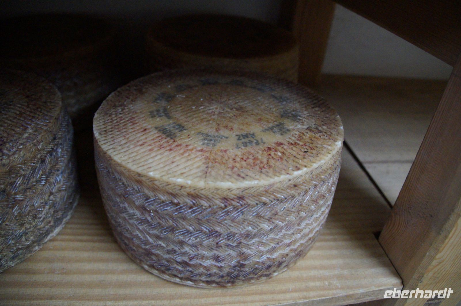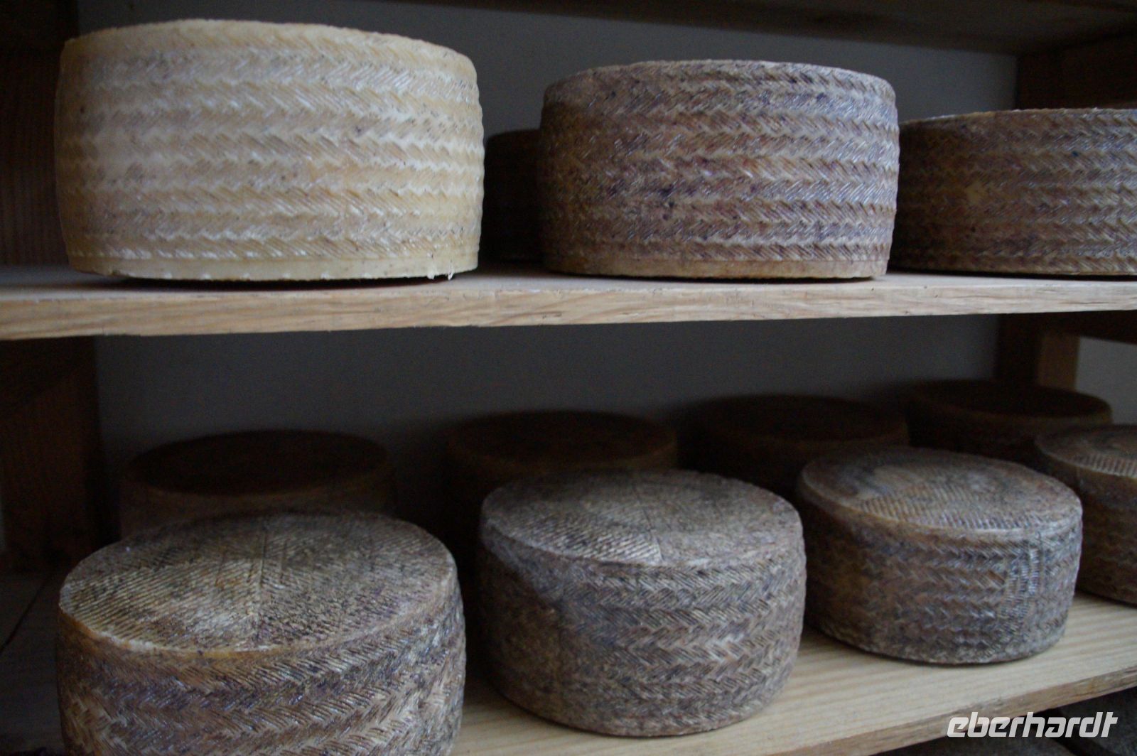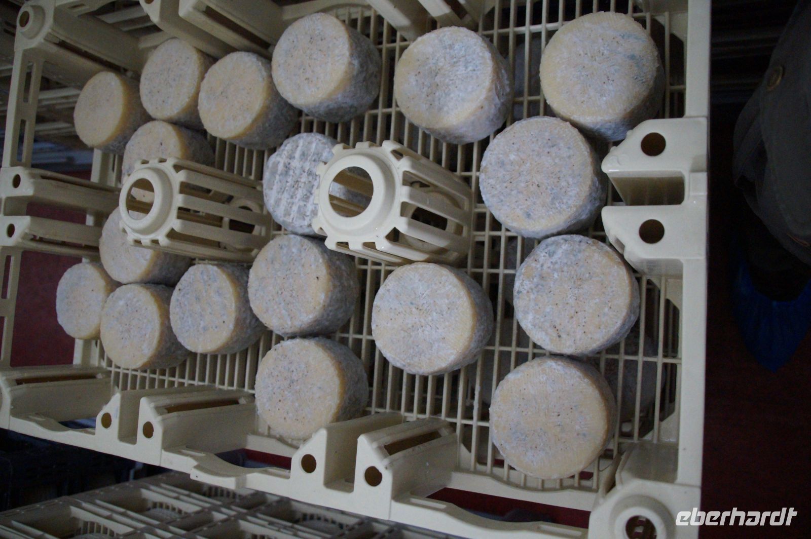 Schließlich wird der Käse zur Reifung in Körben in Trockenkammern gegeben. Wobei Trockenkammer anfänglich gar nicht der richtige Begriff zu sein scheint, da die Luftfeuchtigkeit in diesen Kühl-Kammern (3°-16°) doch sehr hoch ist. Hier wird zugelassen, dass sich rund um die Käselaibe eine Schimmelkultur etabliert, denn durch den Schimmel verdunstet die Flüssigkeit aus dem Käse.