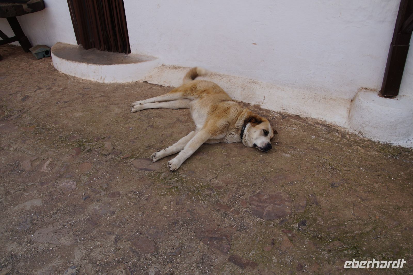 Hinter Valdepeñas lag unser zweites Ziel, inmitten von Feldern und baumbestandenen Dehesas. Im Mai alles voller Klatschmohn. Bald sahen wir, wenn auch nur aus der Ferne, die ersten Schafe und wussten somit, dass es nicht mehr weit sein konnte bis zur Quesería, zur Käserei. Denn heute wollten wir Manchego direkt beim Hersteller probieren. Die Anfahrt ging bald über einen leicht rumpeligen Feldweg, und als wir ankamen begrüßte uns ein wahres Monster von einem Hirtenhund, der gleich seinen Kopf in unseren Bus steckte um uns schwanzwedelnd zu begrüßen.