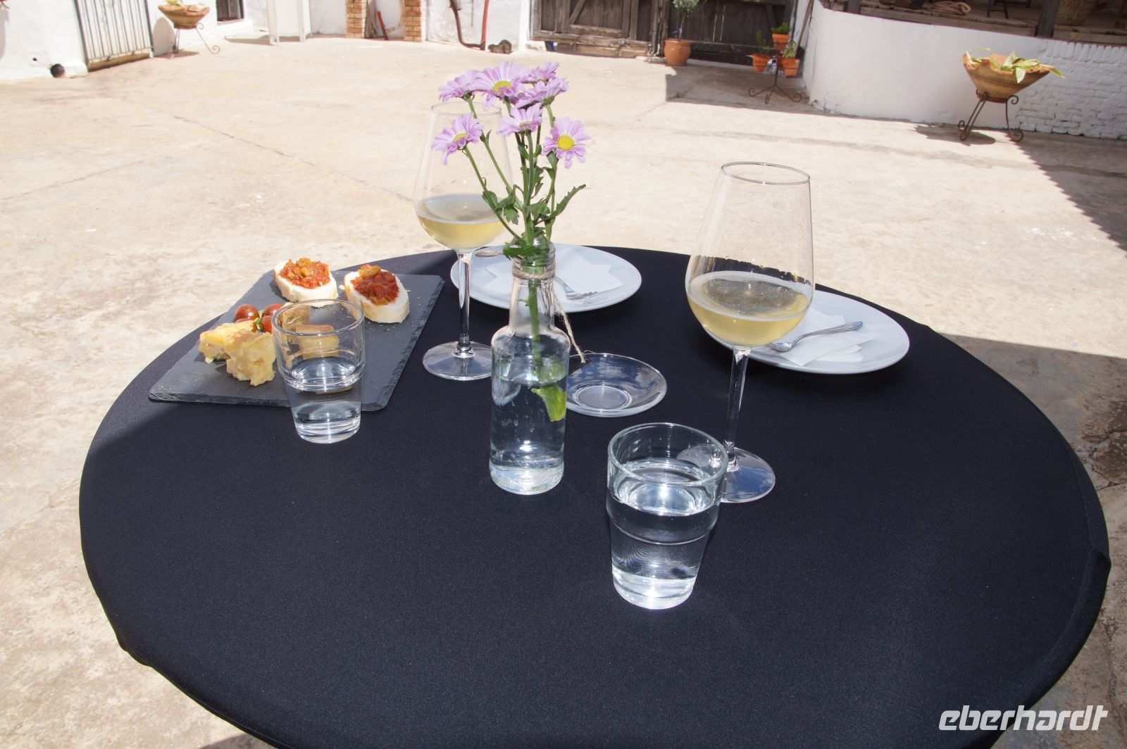 Zunächst bekamen wir unseren ersten Wein, fast eine Art Sekt noch im Hof der Bodega. Diana bat uns, den Wein zu riechen, ihn zu probieren und erklärte uns, dass uns zu jedem der Weine drei Tapas gereicht würden und wir bitte ganz bewusst, die Tapas und den Wein kombiniert schmecken sollten, wie der Wein mit den Tapas harmoniert, welche Aromen wir erspüren könnten. Zum ersten Wein bekamen wir unter anderem mit Bacalao (Stockfisch) gefüllte Spitzpaprika und Tortilla.