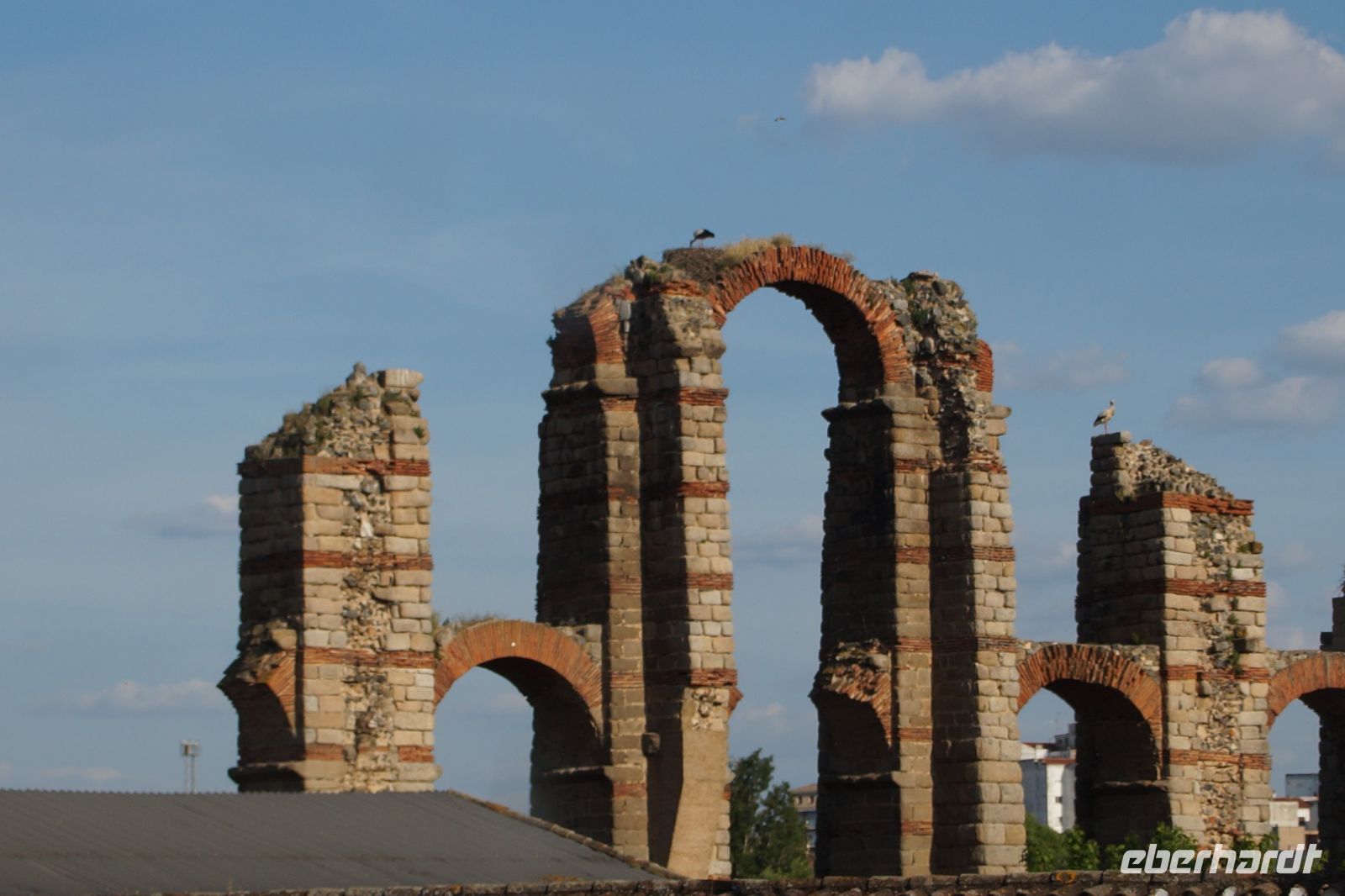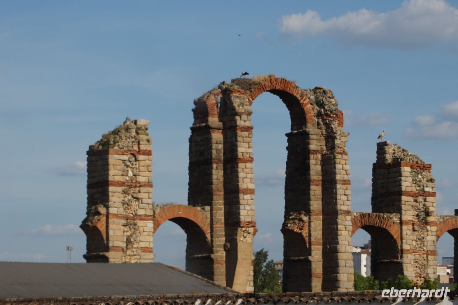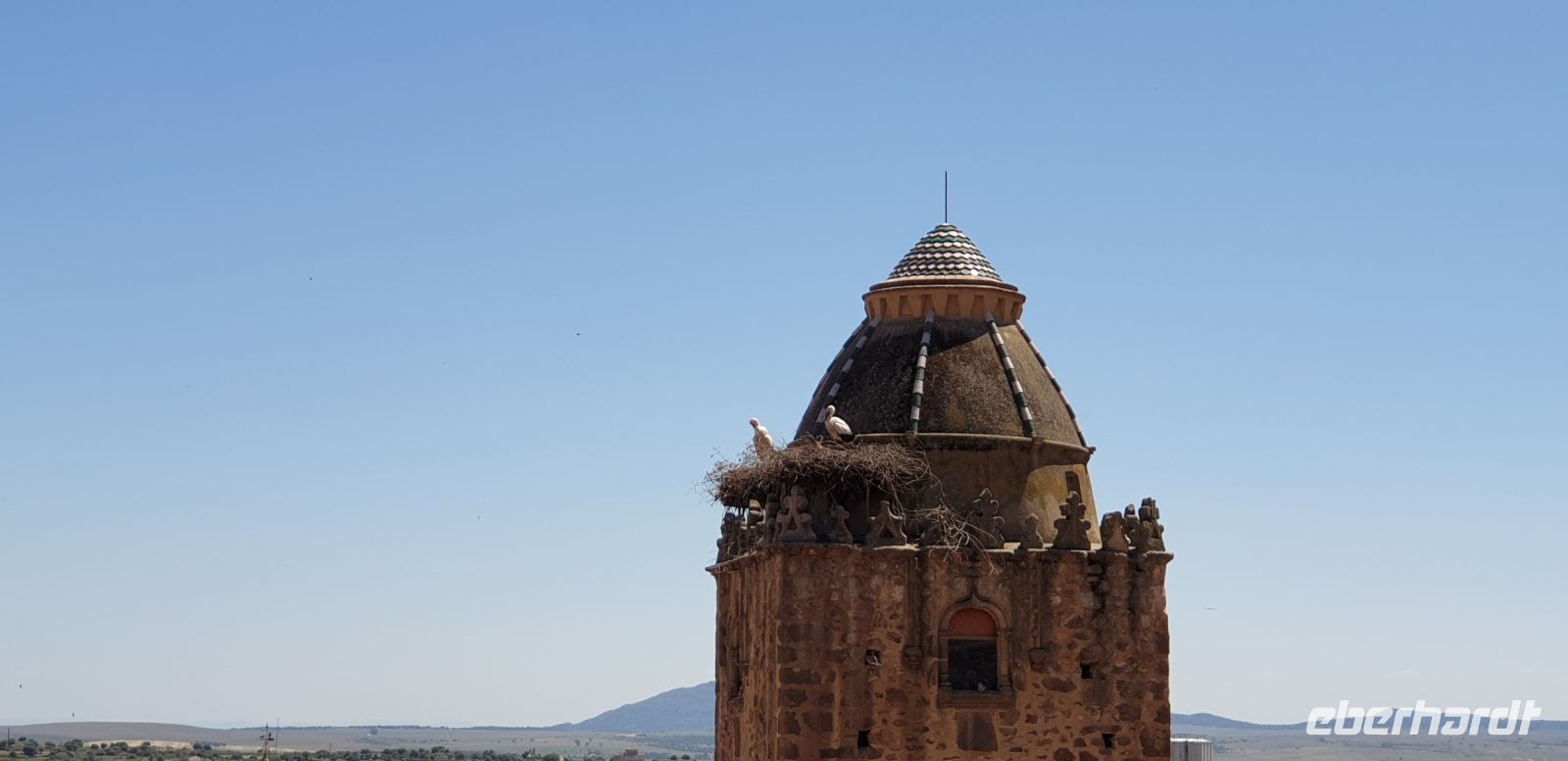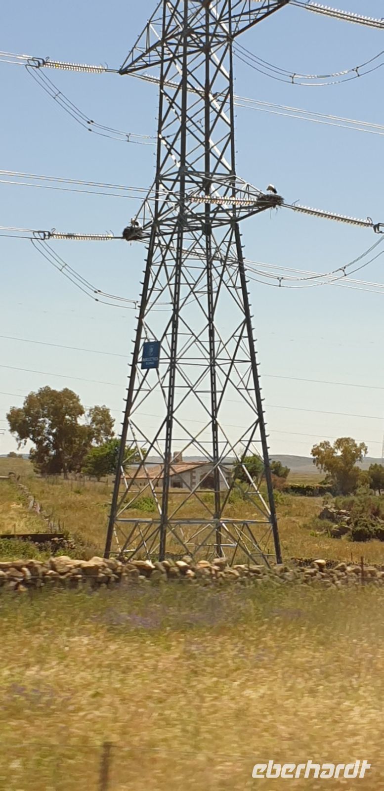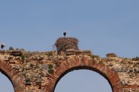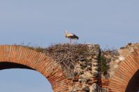 Kurz hinter Ciudad Real hatten wir den Guadiana (in römischer Zeit Anas Flumen, dann Wâdî Ana, daraus Guadiana) überquert, der blieb nun meist links von uns. Er fließt in Ost-West-Richtung durch die Mancha und die Extremadura und biegt dann nach Süden ab, um die Grenze zwischen Spanien und Portugal zu bilden. Immer wieder durchquerten wird landwirtschaftlich genutzte Flächen in seinem Tal und konnten die vielen Störche auf ihren Nestern bestaunen. Kaum ein Mast einer Überlandleitung, kaum eine Antenne, der bzw. die nicht als Mehrfamilienhaus von Störchen genutzt wurde.