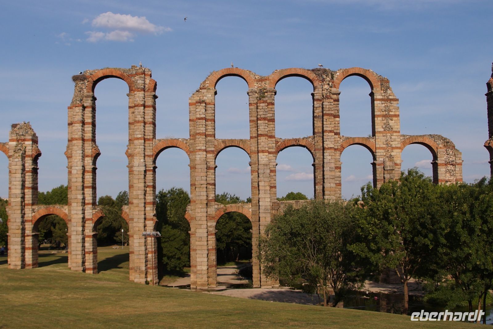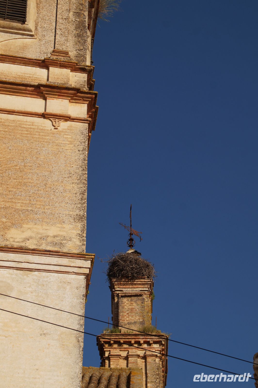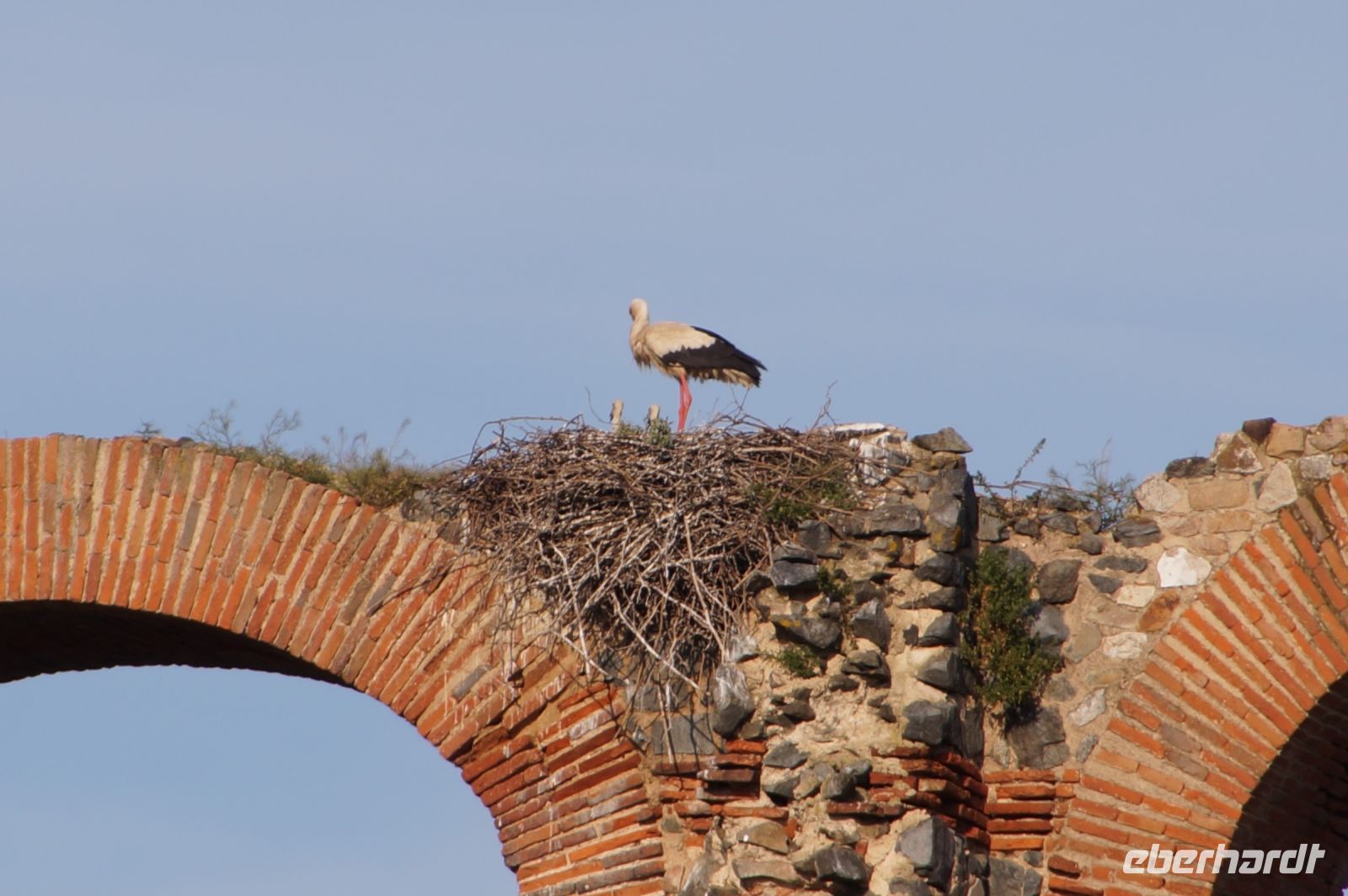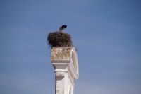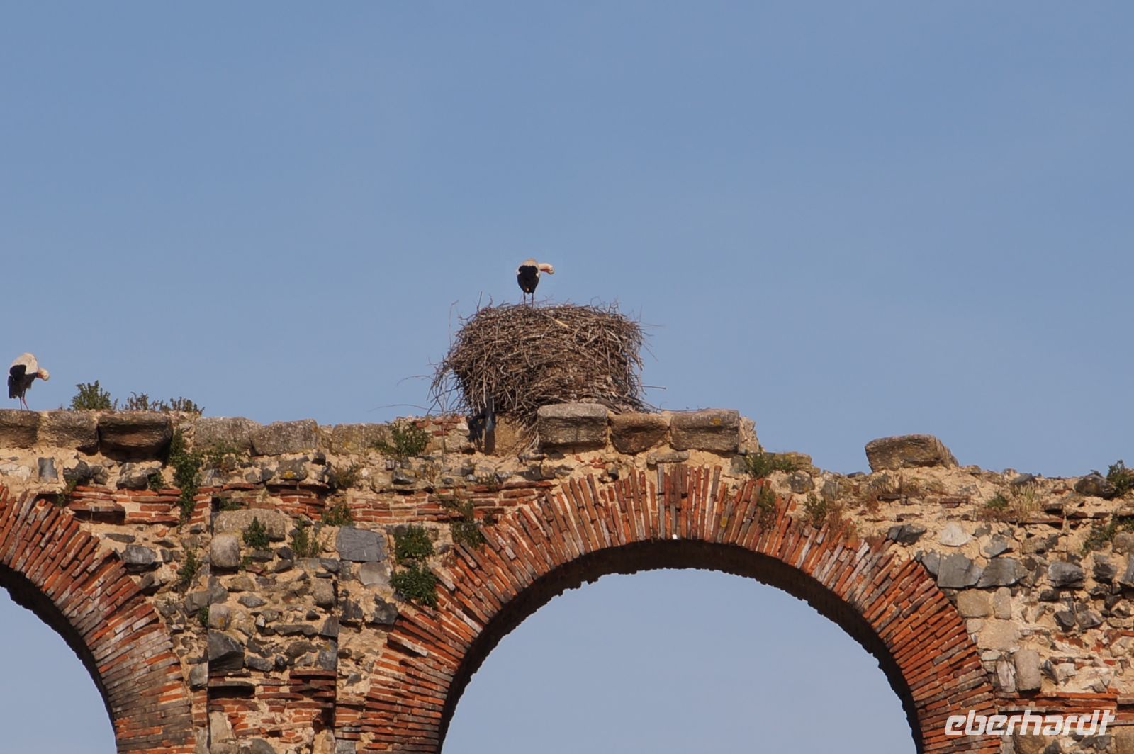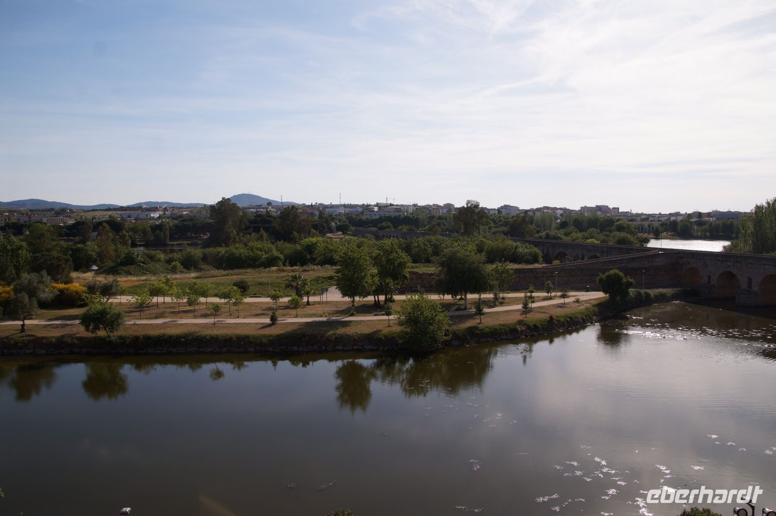 Kurz hinter Ciudad Real hatten wir den Guadiana (in römischer Zeit Anas Flumen, dann Wâdî Ana, daraus Guadiana) überquert, der blieb nun meist links von uns. Er fließt in Ost-West-Richtung durch die Mancha und die Extremadura und biegt dann nach Süden ab, um die Grenze zwischen Spanien und Portugal zu bilden. Immer wieder durchquerten wird landwirtschaftlich genutzte Flächen in seinem Tal und konnten die vielen Störche auf ihren Nestern bestaunen. Kaum ein Mast einer Überlandleitung, kaum eine Antenne, der bzw. die nicht als Mehrfamilienhaus von Störchen genutzt wurde.