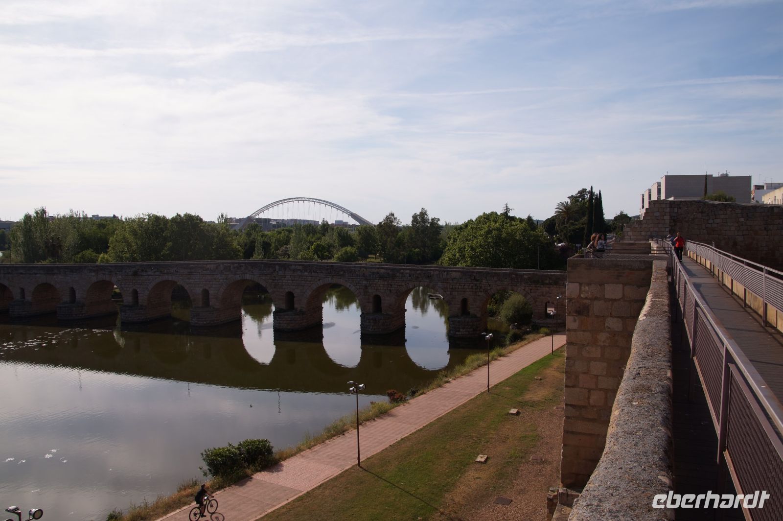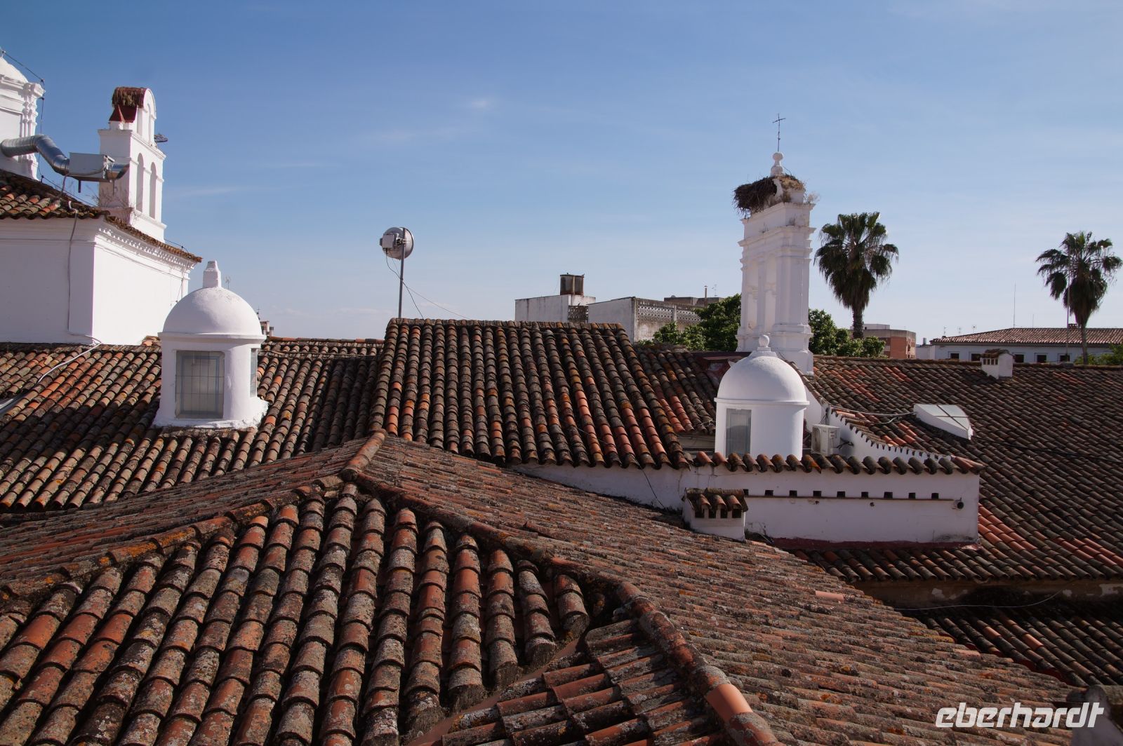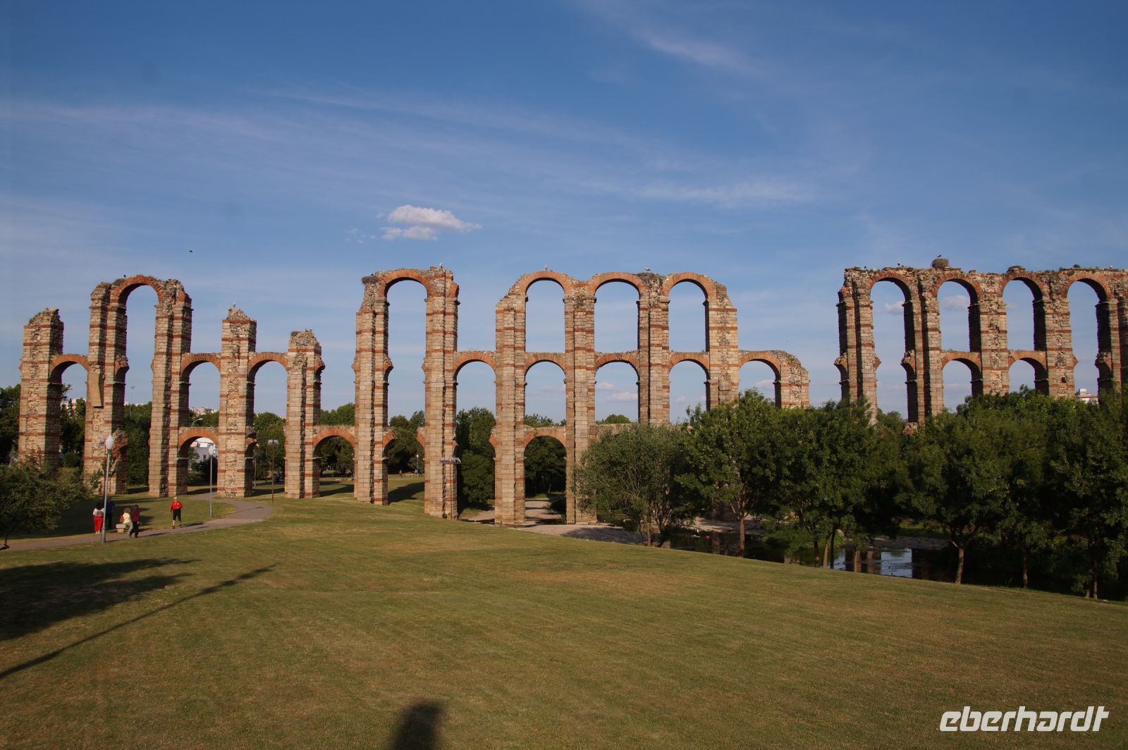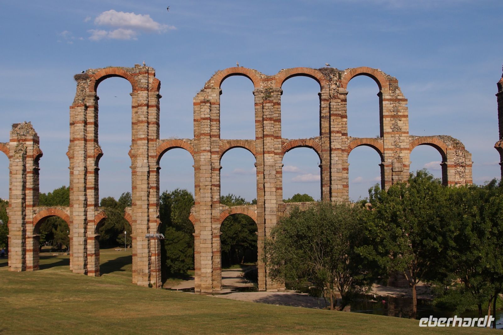 Kurz hinter Ciudad Real hatten wir den Guadiana (in römischer Zeit Anas Flumen, dann Wâdî Ana, daraus Guadiana) überquert, der blieb nun meist links von uns. Er fließt in Ost-West-Richtung durch die Mancha und die Extremadura und biegt dann nach Süden ab, um die Grenze zwischen Spanien und Portugal zu bilden. Immer wieder durchquerten wird landwirtschaftlich genutzte Flächen in seinem Tal und konnten die vielen Störche auf ihren Nestern bestaunen. Kaum ein Mast einer Überlandleitung, kaum eine Antenne, der bzw. die nicht als Mehrfamilienhaus von Störchen genutzt wurde.