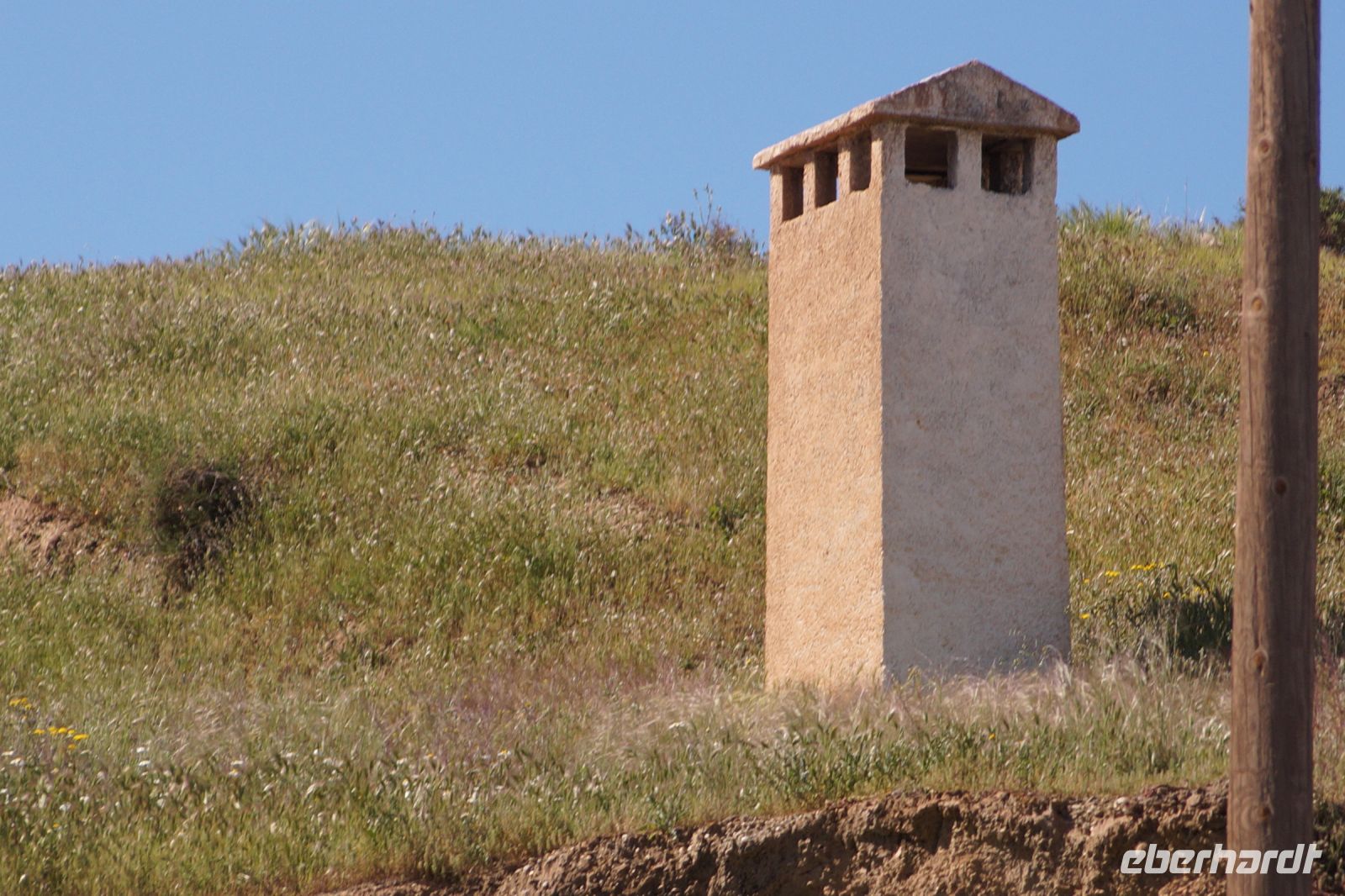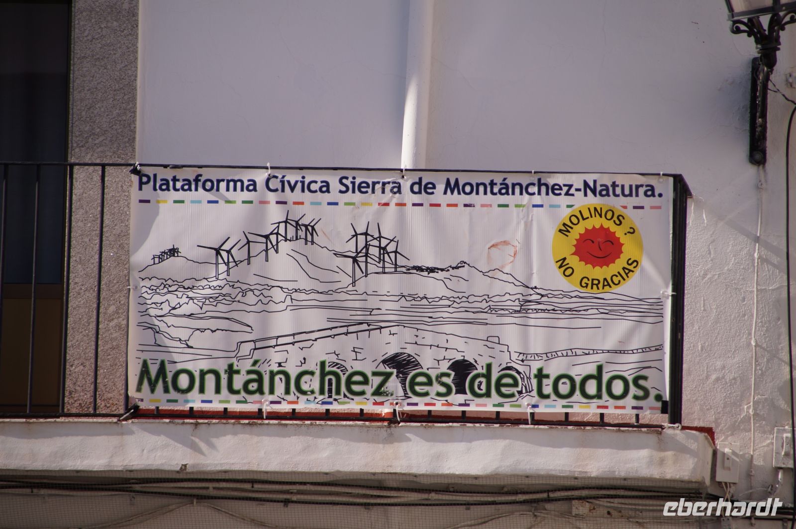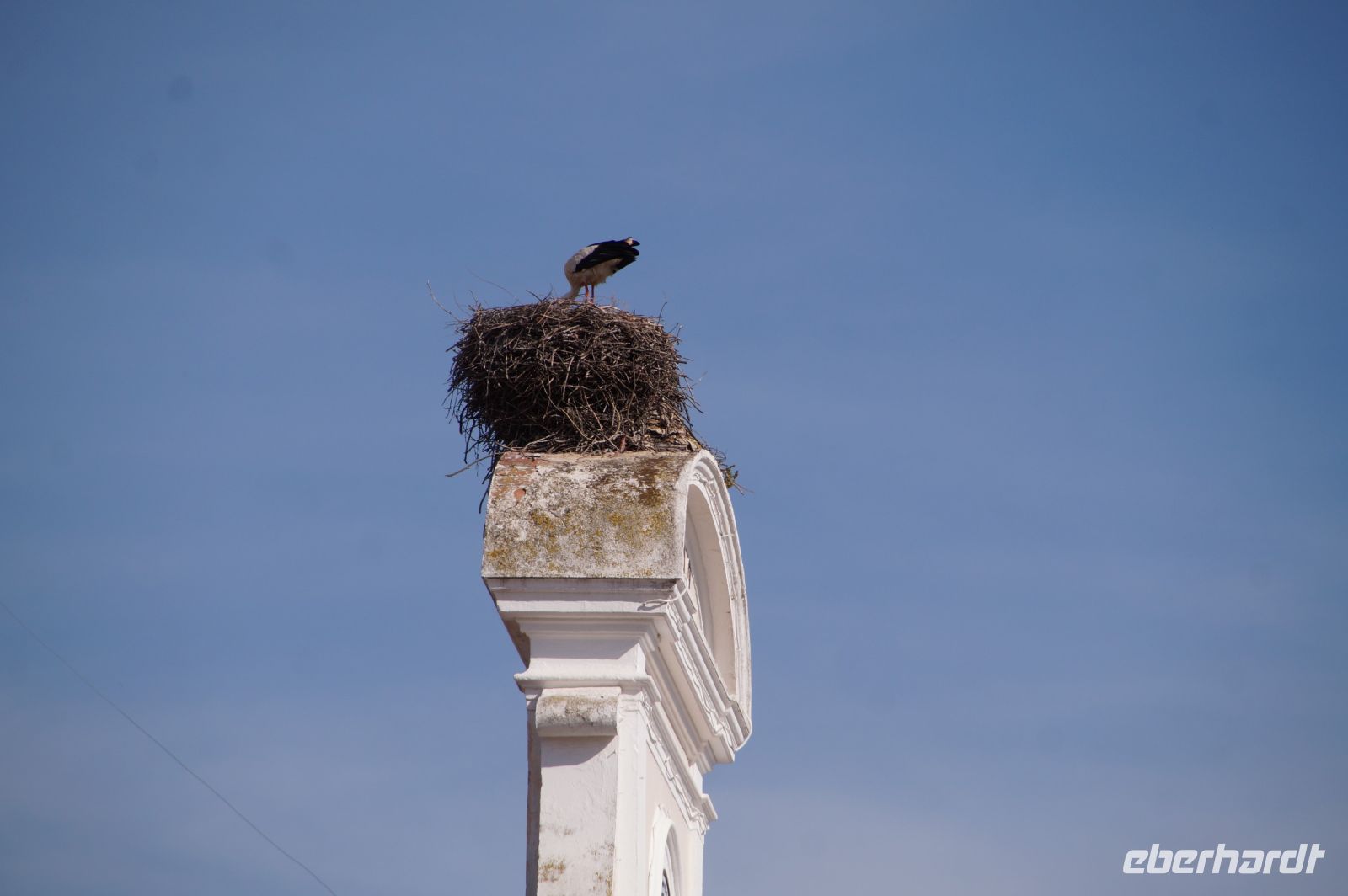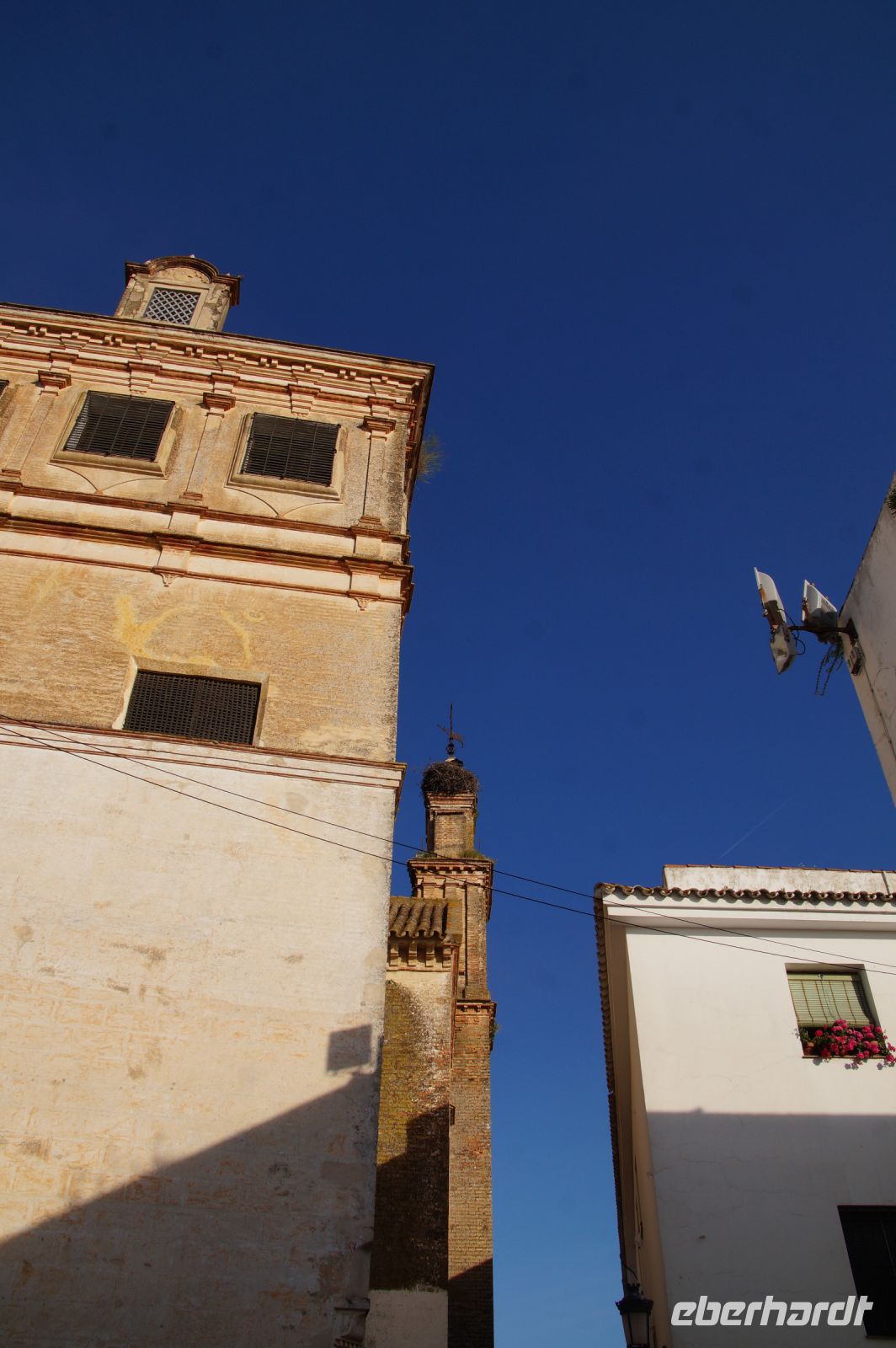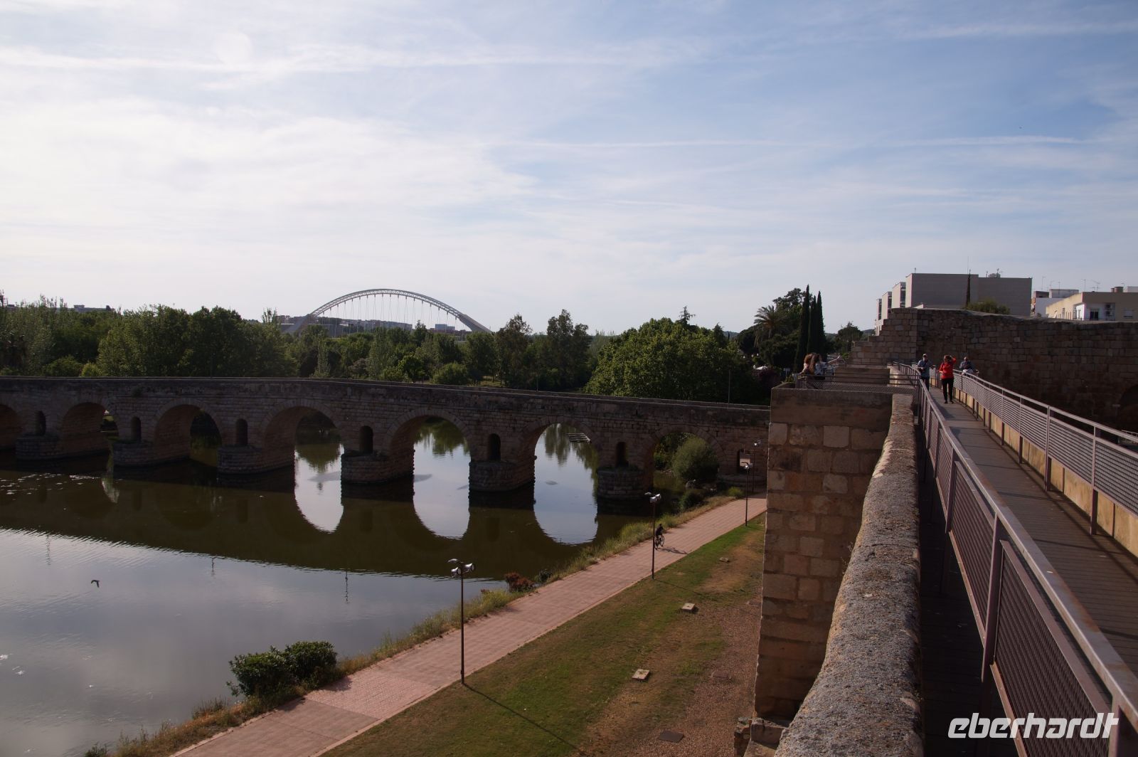 Kurz hinter Ciudad Real hatten wir den Guadiana (in römischer Zeit Anas Flumen, dann Wâdî Ana, daraus Guadiana) überquert, der blieb nun meist links von uns. Er fließt in Ost-West-Richtung durch die Mancha und die Extremadura und biegt dann nach Süden ab, um die Grenze zwischen Spanien und Portugal zu bilden. Immer wieder durchquerten wird landwirtschaftlich genutzte Flächen in seinem Tal und konnten die vielen Störche auf ihren Nestern bestaunen. Kaum ein Mast einer Überlandleitung, kaum eine Antenne, der bzw. die nicht als Mehrfamilienhaus von Störchen genutzt wurde.
