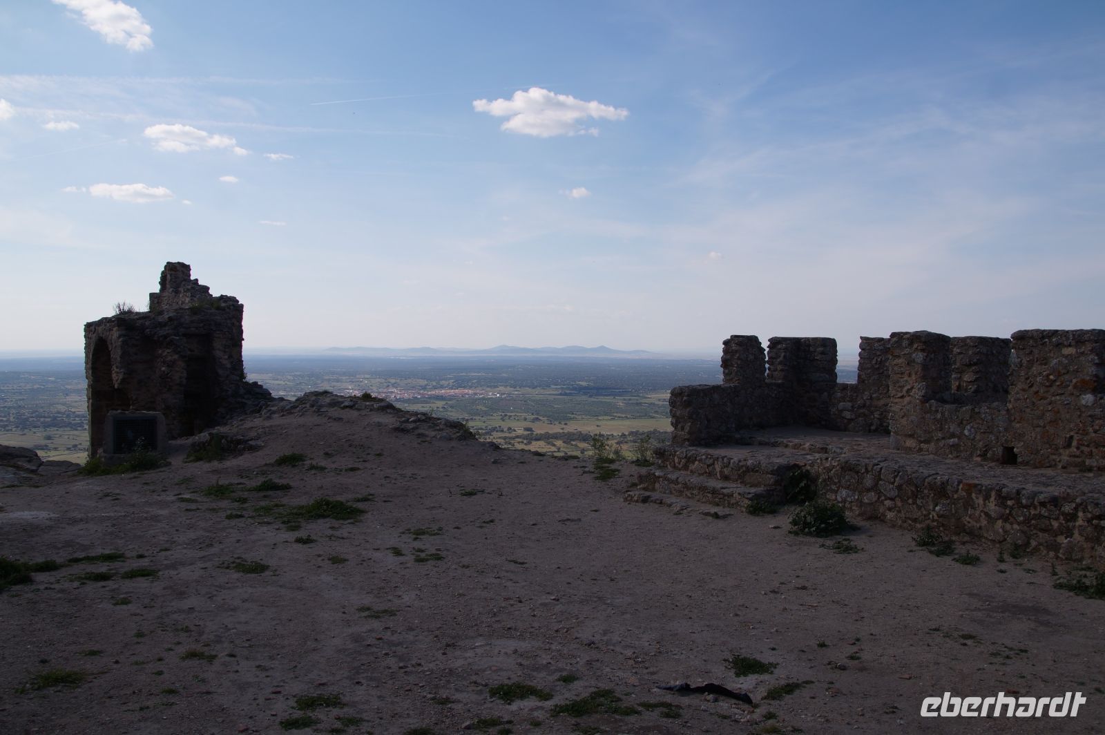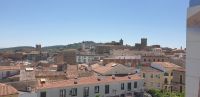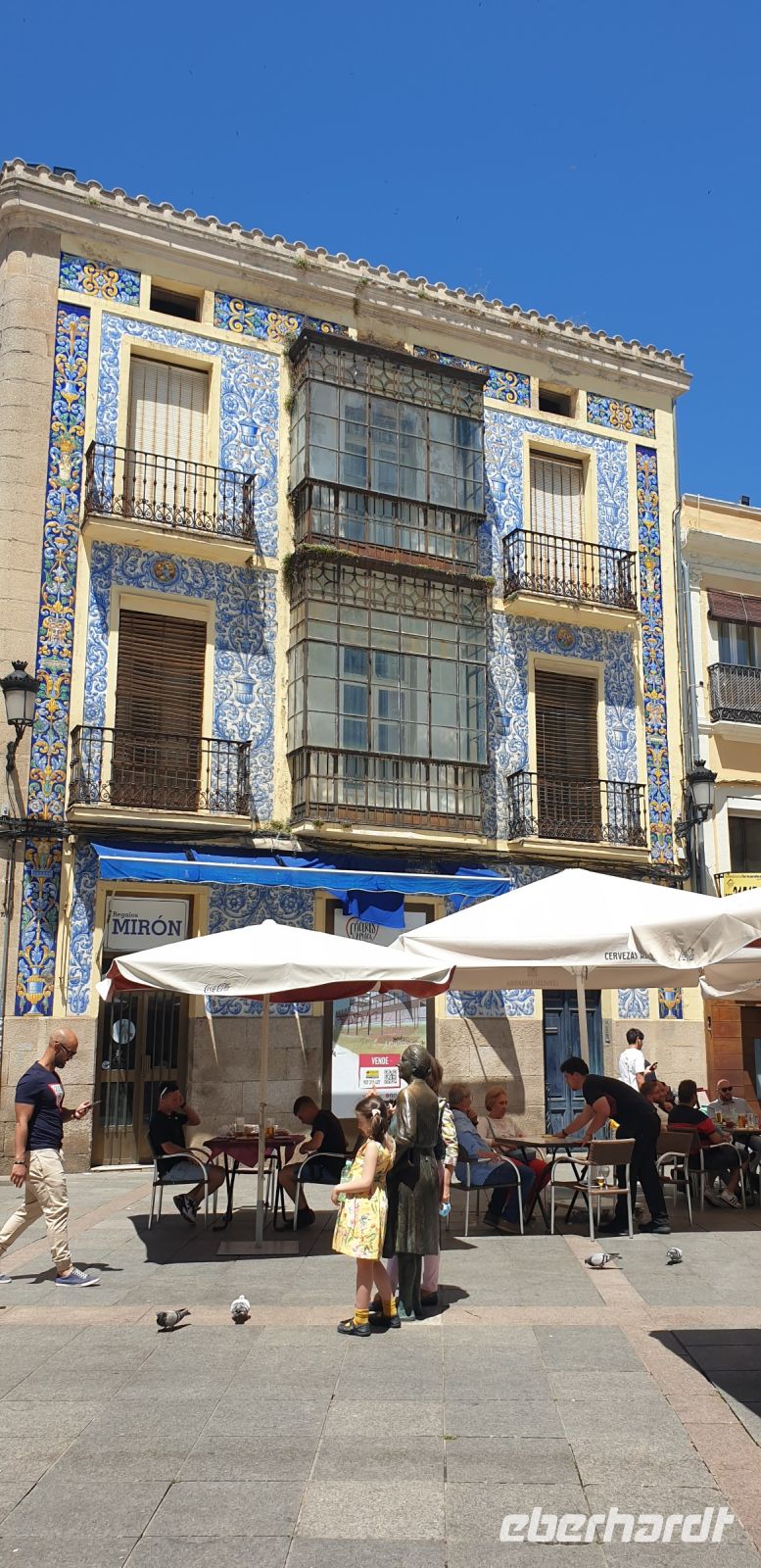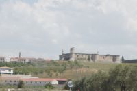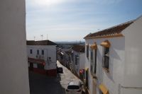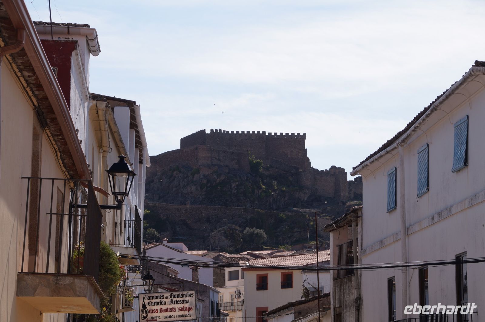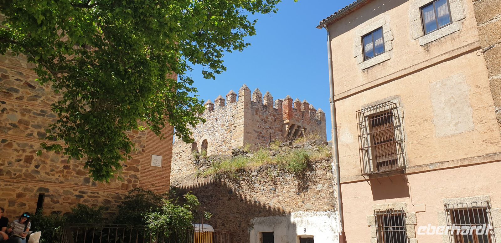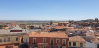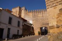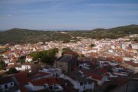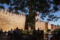 Im Anschluss an die Schinkenverkostung wollten wir noch hoch zur Burg und Santiago fuhr uns auch dorthin, bis... ja bis wir an eine Stelle kamen, an der er sich auch nicht mehr traute, um die Ecke zu fahren. Hier stiegen wir dann aus und stiegen zur Burg hoch, während Santiago mit den Kaffeeliebhabern kaltschnäuzig direkt vorm Rathaus auf der Plaza Mayor im Parkverbot parkte (er war aber nicht allein). In der urigen kleinen spanischen Bar gegenüber bekamen unsere Leute einen Kaffee und Santiago eine Flasche Wein geschenkt, dafür dass er der Bar unverhofft neue Kundschaft zugeführt hatte. Wir Übrigen genossen noch die Aussicht von der Burg, die Carlos uns als Balcón de la Extremadura empfohlen hatte. Die anderen trafen wir dann etwas später in ihrer Bar an und es ging zurück nach Mérida.