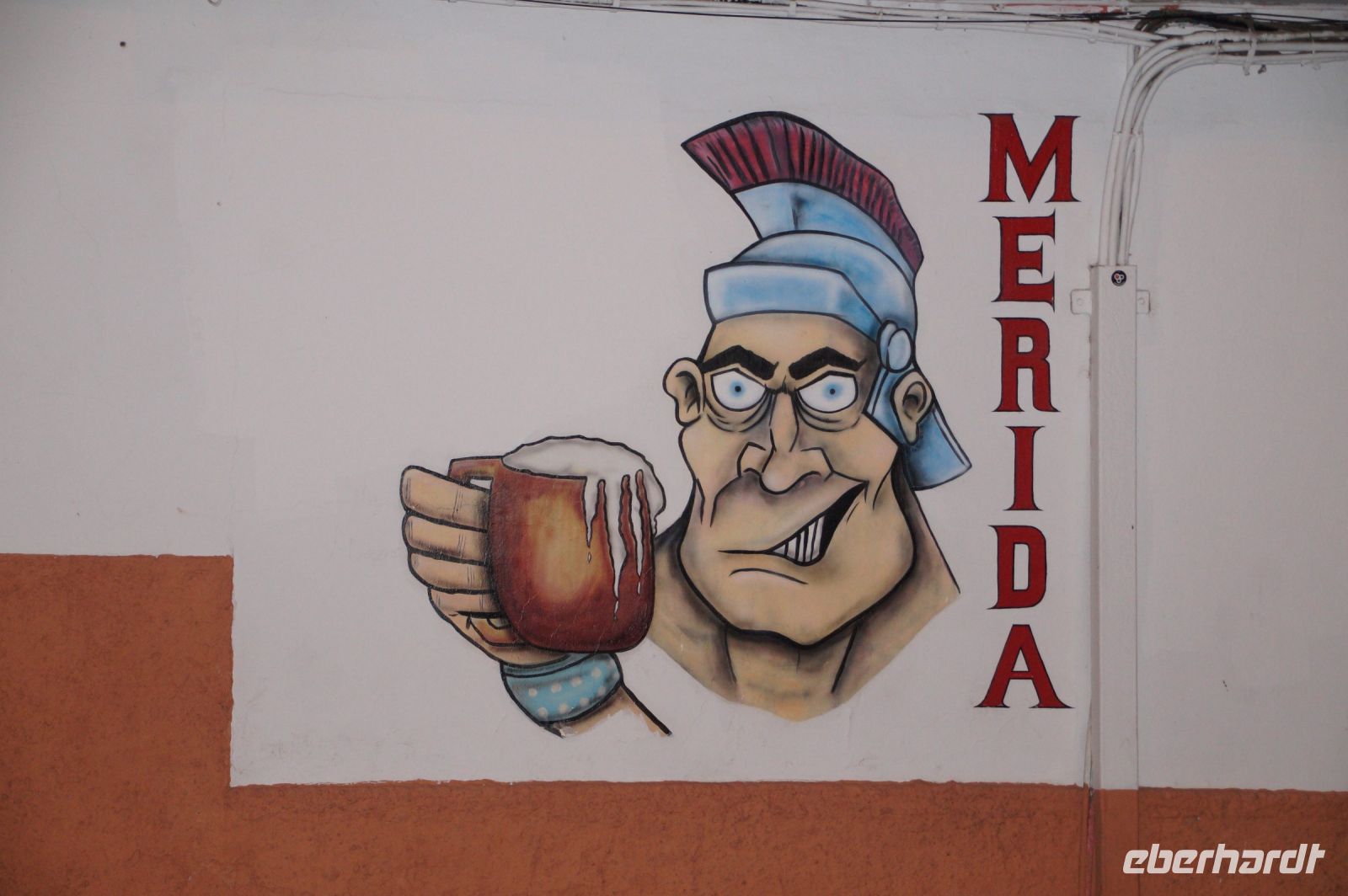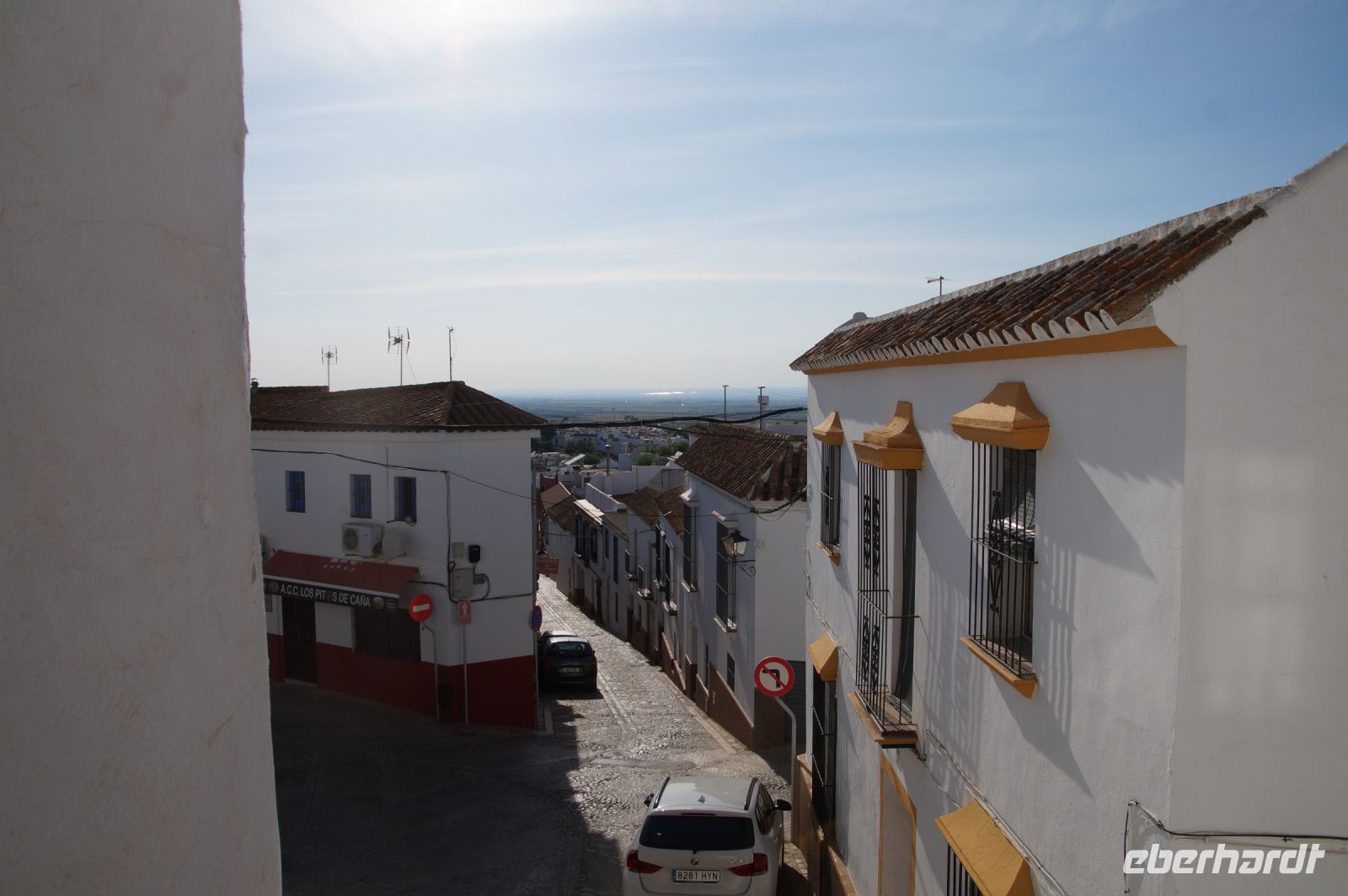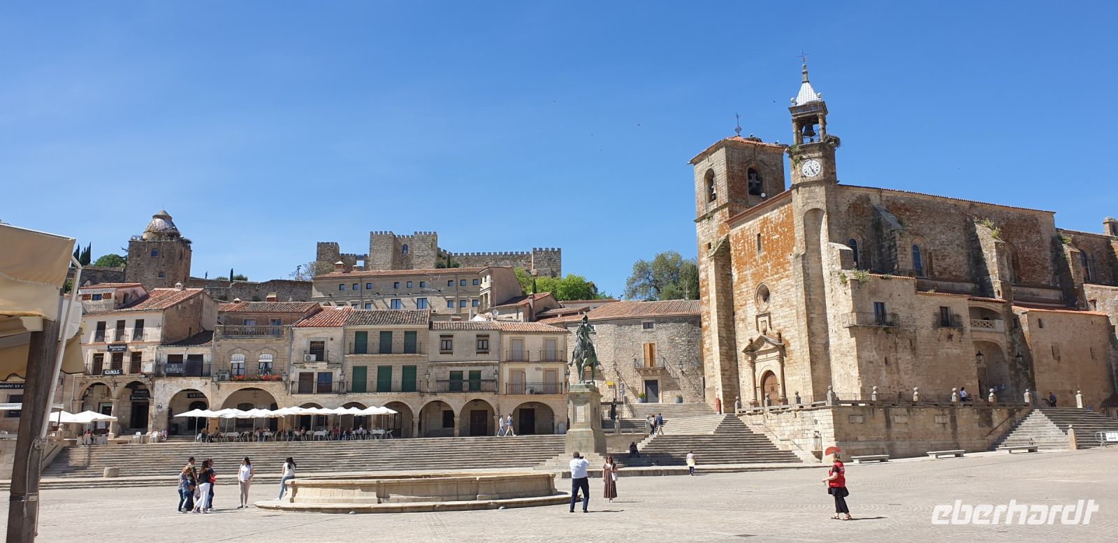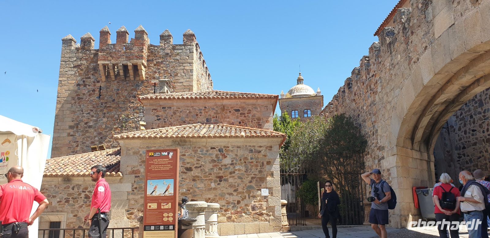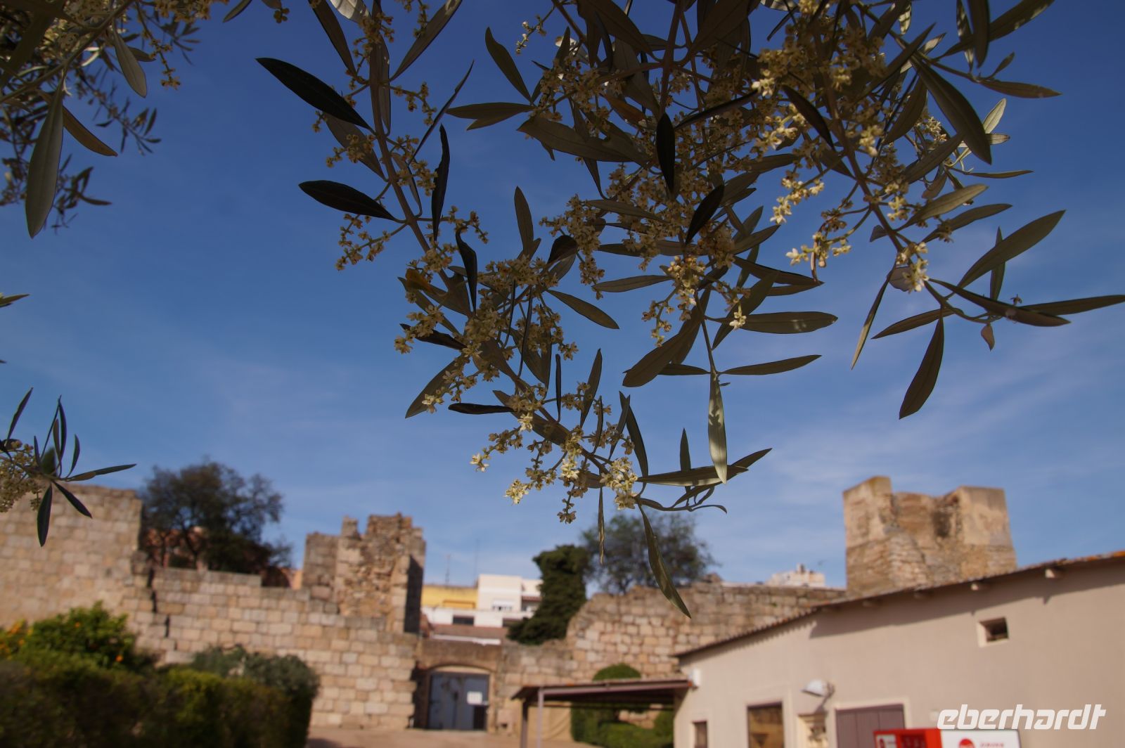 Im Anschluss an die Schinkenverkostung wollten wir noch hoch zur Burg und Santiago fuhr uns auch dorthin, bis... ja bis wir an eine Stelle kamen, an der er sich auch nicht mehr traute, um die Ecke zu fahren. Hier stiegen wir dann aus und stiegen zur Burg hoch, während Santiago mit den Kaffeeliebhabern kaltschnäuzig direkt vorm Rathaus auf der Plaza Mayor im Parkverbot parkte (er war aber nicht allein). In der urigen kleinen spanischen Bar gegenüber bekamen unsere Leute einen Kaffee und Santiago eine Flasche Wein geschenkt, dafür dass er der Bar unverhofft neue Kundschaft zugeführt hatte. Wir Übrigen genossen noch die Aussicht von der Burg, die Carlos uns als Balcón de la Extremadura empfohlen hatte. Die anderen trafen wir dann etwas später in ihrer Bar an und es ging zurück nach Mérida.