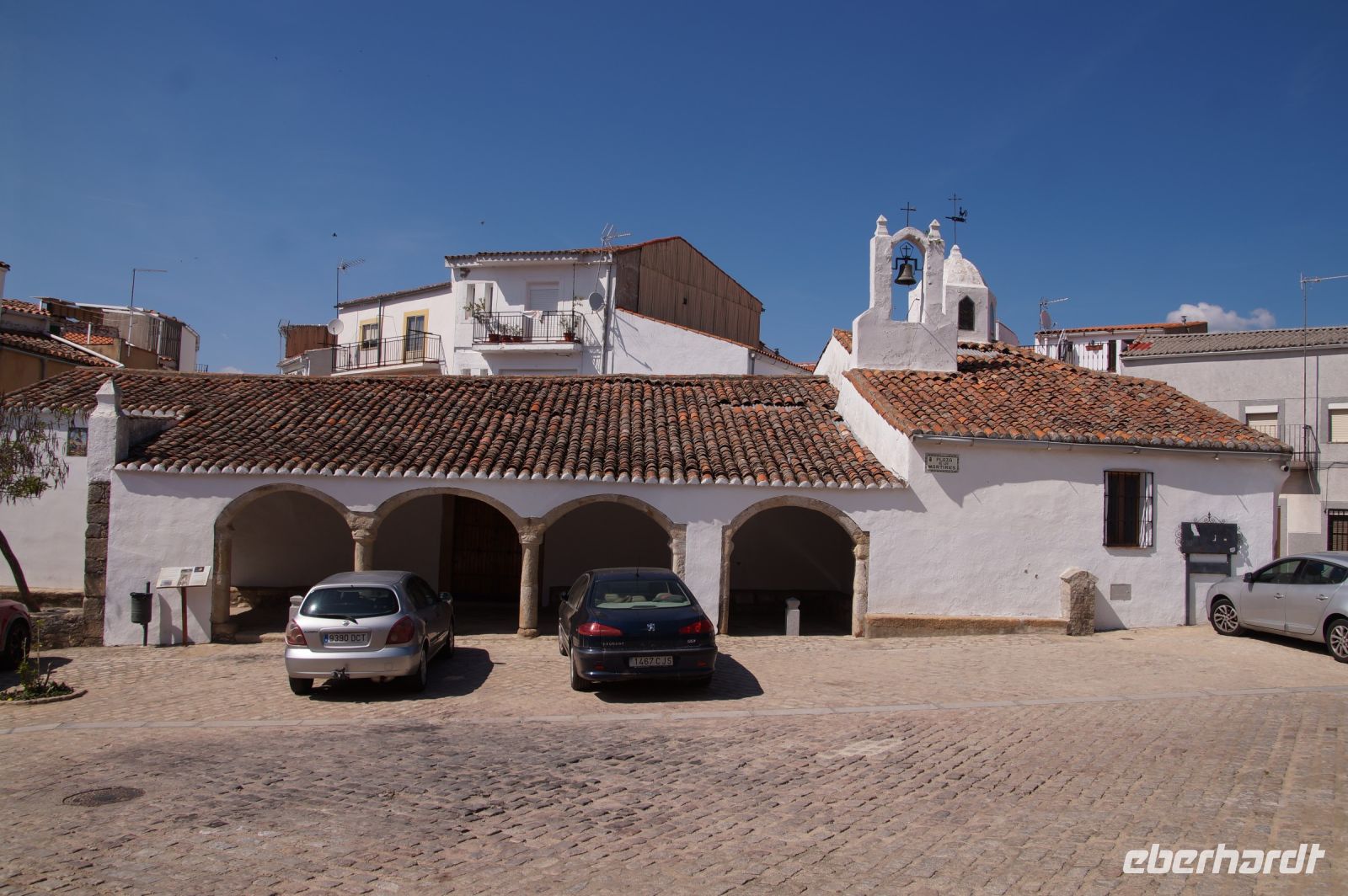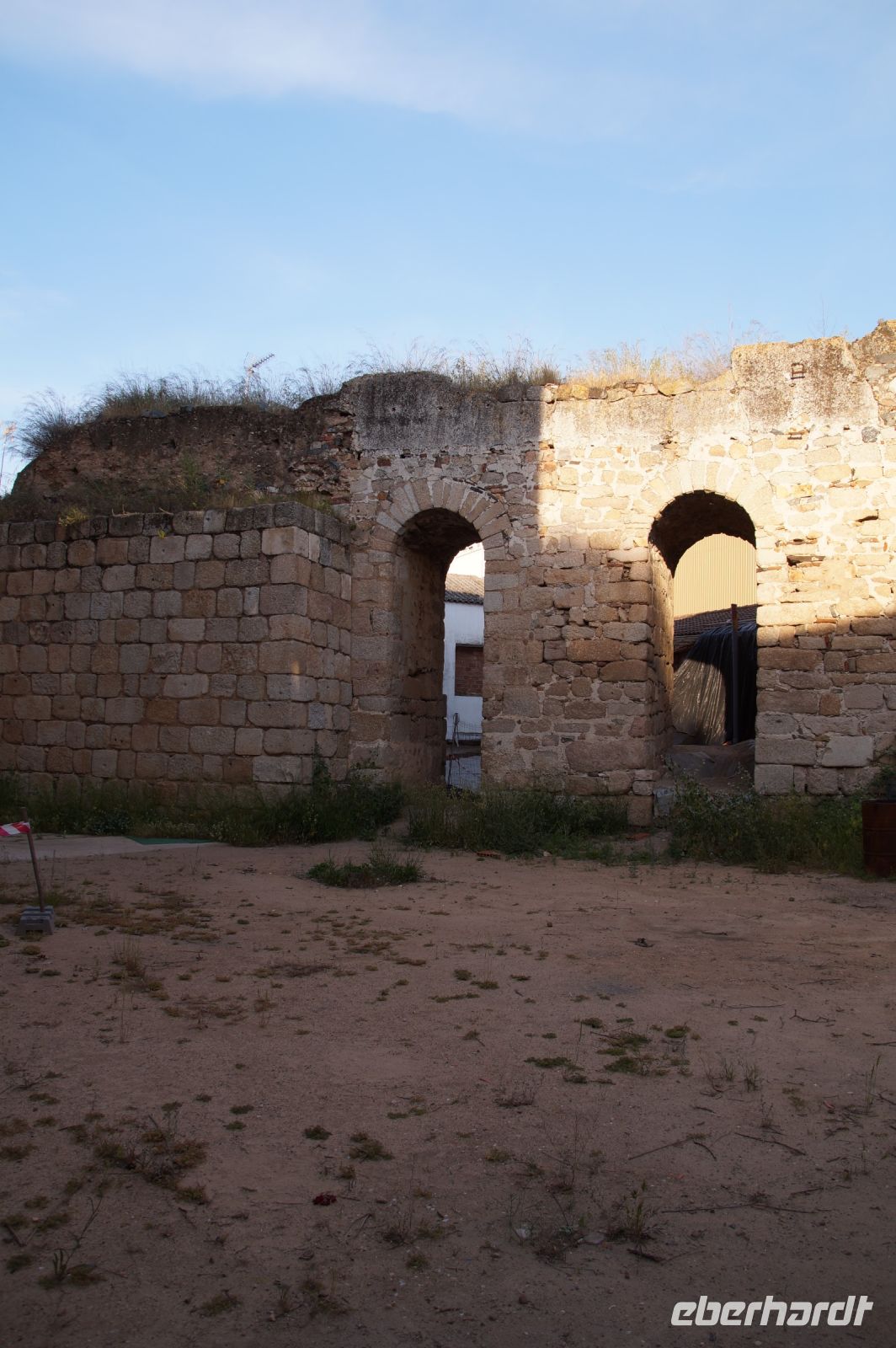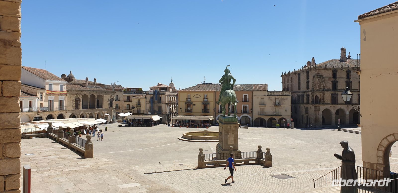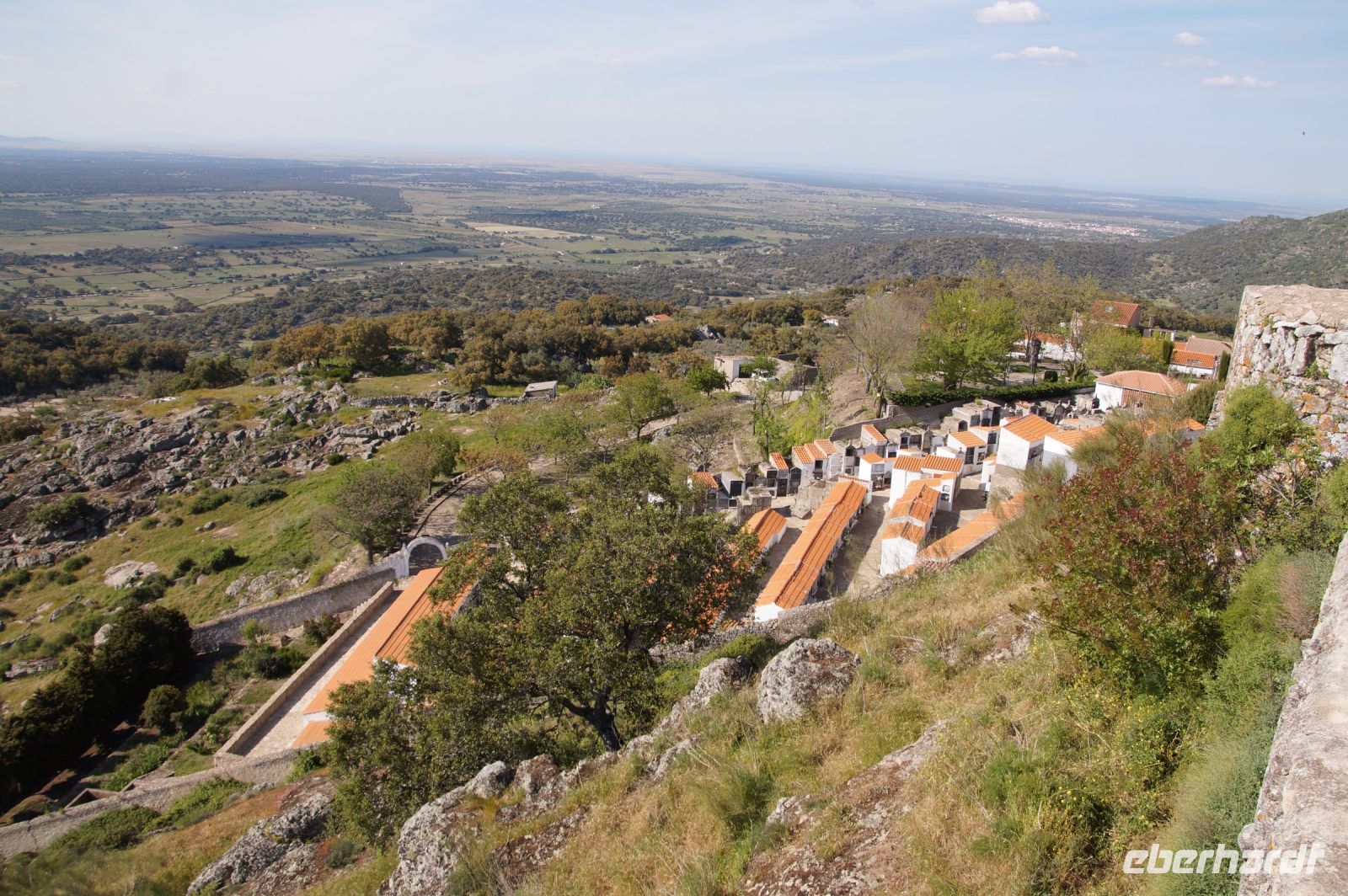Im Anschluss an die Schinkenverkostung wollten wir noch hoch zur Burg und Santiago fuhr uns auch dorthin, bis... ja bis wir an eine Stelle kamen, an der er sich auch nicht mehr traute, um die Ecke zu fahren. Hier stiegen wir dann aus und stiegen zur Burg hoch, während Santiago mit den Kaffeeliebhabern kaltschnäuzig direkt vorm Rathaus auf der Plaza Mayor im Parkverbot parkte (er war aber nicht allein). In der urigen kleinen spanischen Bar gegenüber bekamen unsere Leute einen Kaffee und Santiago eine Flasche Wein geschenkt, dafür dass er der Bar unverhofft neue Kundschaft zugeführt hatte. Wir Übrigen genossen noch die Aussicht von der Burg, die Carlos uns als Balcón de la Extremadura empfohlen hatte. Die anderen trafen wir dann etwas später in ihrer Bar an und es ging zurück nach Mérida.