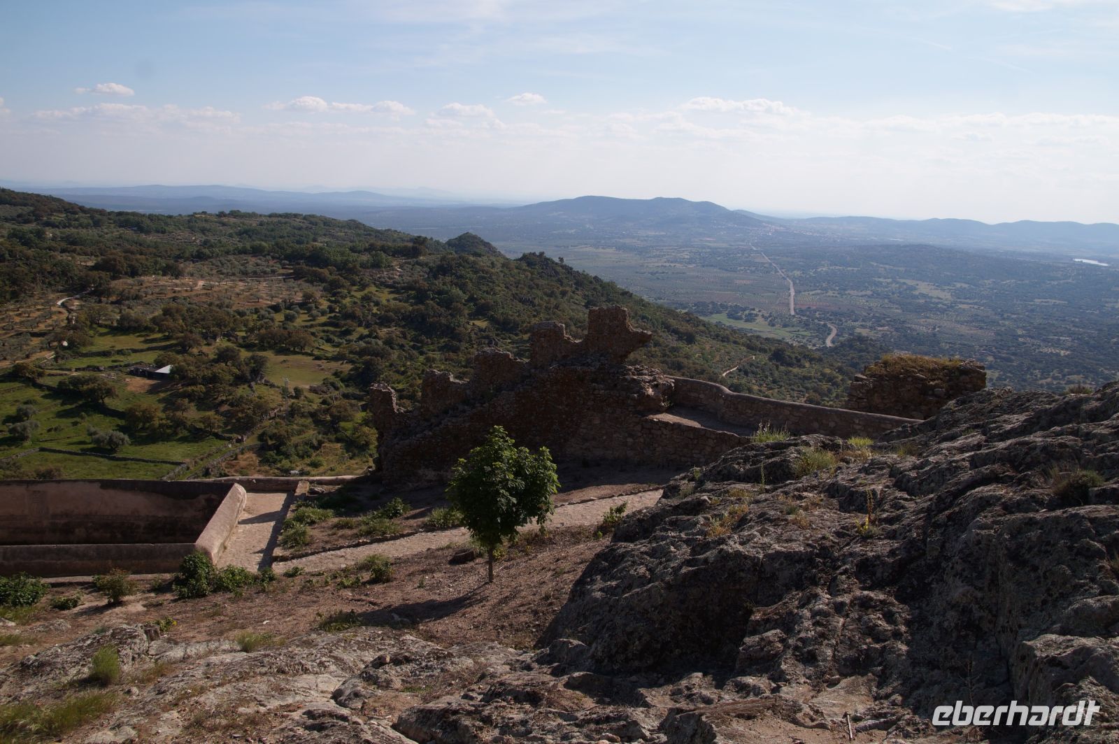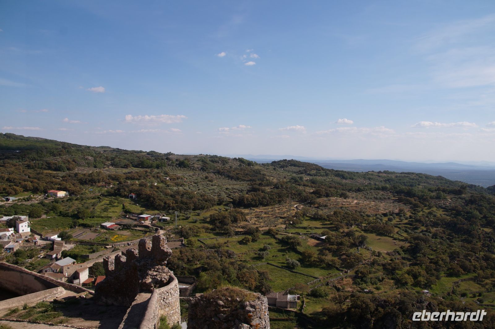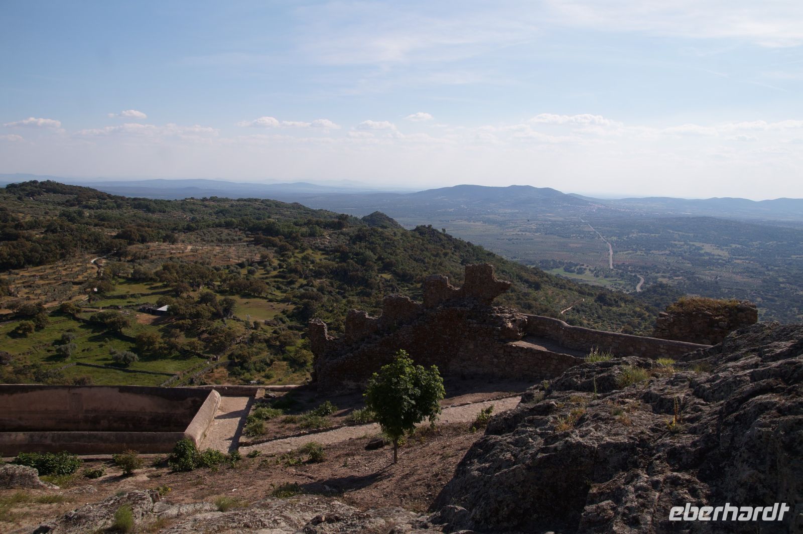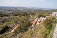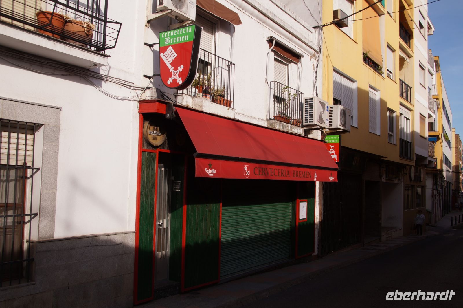 Im Anschluss an die Schinkenverkostung wollten wir noch hoch zur Burg und Santiago fuhr uns auch dorthin, bis... ja bis wir an eine Stelle kamen, an der er sich auch nicht mehr traute, um die Ecke zu fahren. Hier stiegen wir dann aus und stiegen zur Burg hoch, während Santiago mit den Kaffeeliebhabern kaltschnäuzig direkt vorm Rathaus auf der Plaza Mayor im Parkverbot parkte (er war aber nicht allein). In der urigen kleinen spanischen Bar gegenüber bekamen unsere Leute einen Kaffee und Santiago eine Flasche Wein geschenkt, dafür dass er der Bar unverhofft neue Kundschaft zugeführt hatte. Wir Übrigen genossen noch die Aussicht von der Burg, die Carlos uns als Balcón de la Extremadura empfohlen hatte. Die anderen trafen wir dann etwas später in ihrer Bar an und es ging zurück nach Mérida.