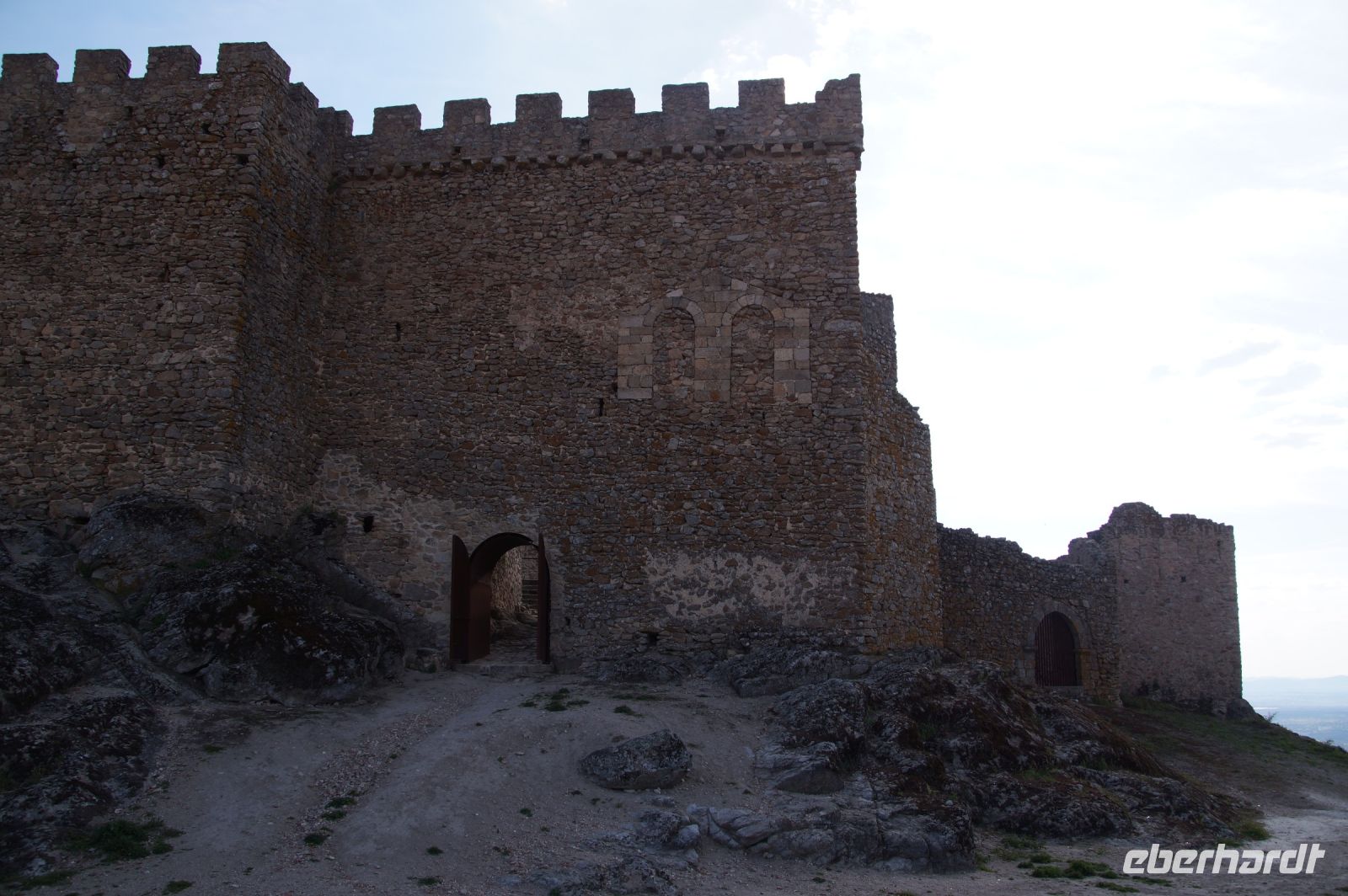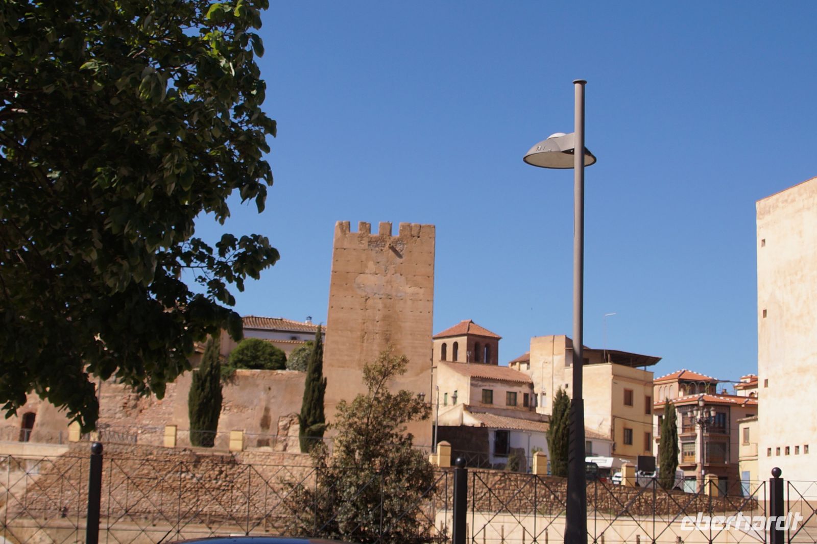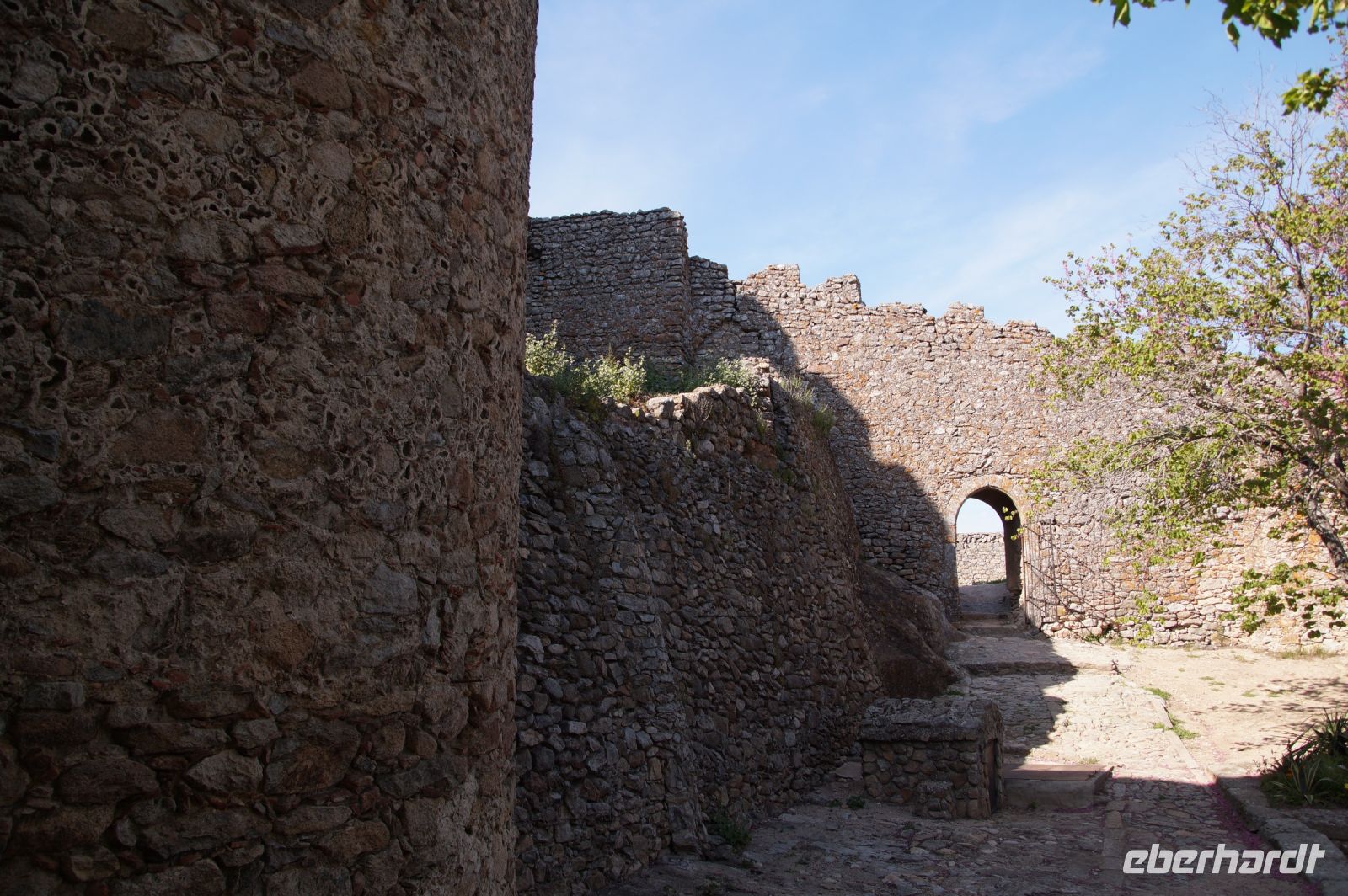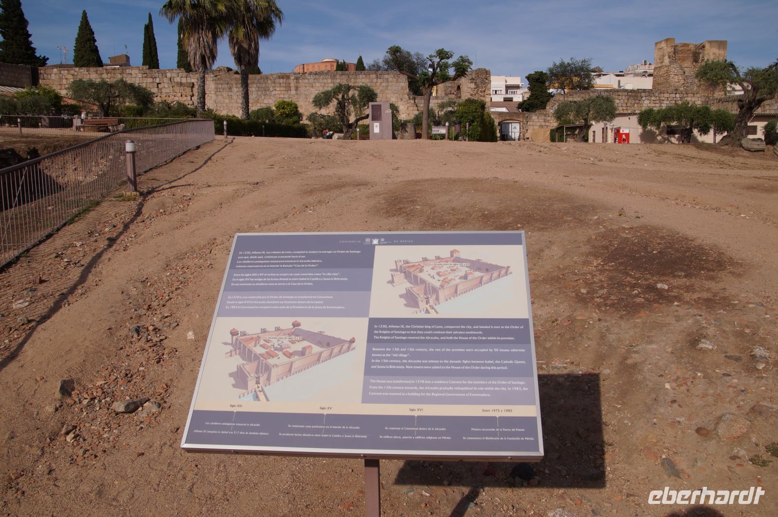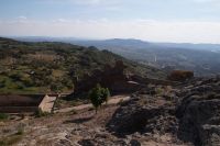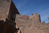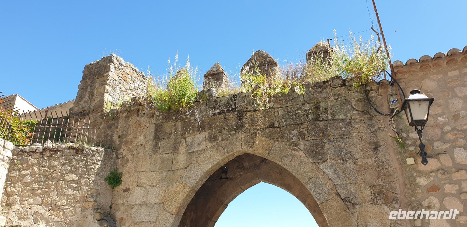 Im Anschluss an die Schinkenverkostung wollten wir noch hoch zur Burg und Santiago fuhr uns auch dorthin, bis... ja bis wir an eine Stelle kamen, an der er sich auch nicht mehr traute, um die Ecke zu fahren. Hier stiegen wir dann aus und stiegen zur Burg hoch, während Santiago mit den Kaffeeliebhabern kaltschnäuzig direkt vorm Rathaus auf der Plaza Mayor im Parkverbot parkte (er war aber nicht allein). In der urigen kleinen spanischen Bar gegenüber bekamen unsere Leute einen Kaffee und Santiago eine Flasche Wein geschenkt, dafür dass er der Bar unverhofft neue Kundschaft zugeführt hatte. Wir Übrigen genossen noch die Aussicht von der Burg, die Carlos uns als Balcón de la Extremadura empfohlen hatte. Die anderen trafen wir dann etwas später in ihrer Bar an und es ging zurück nach Mérida.