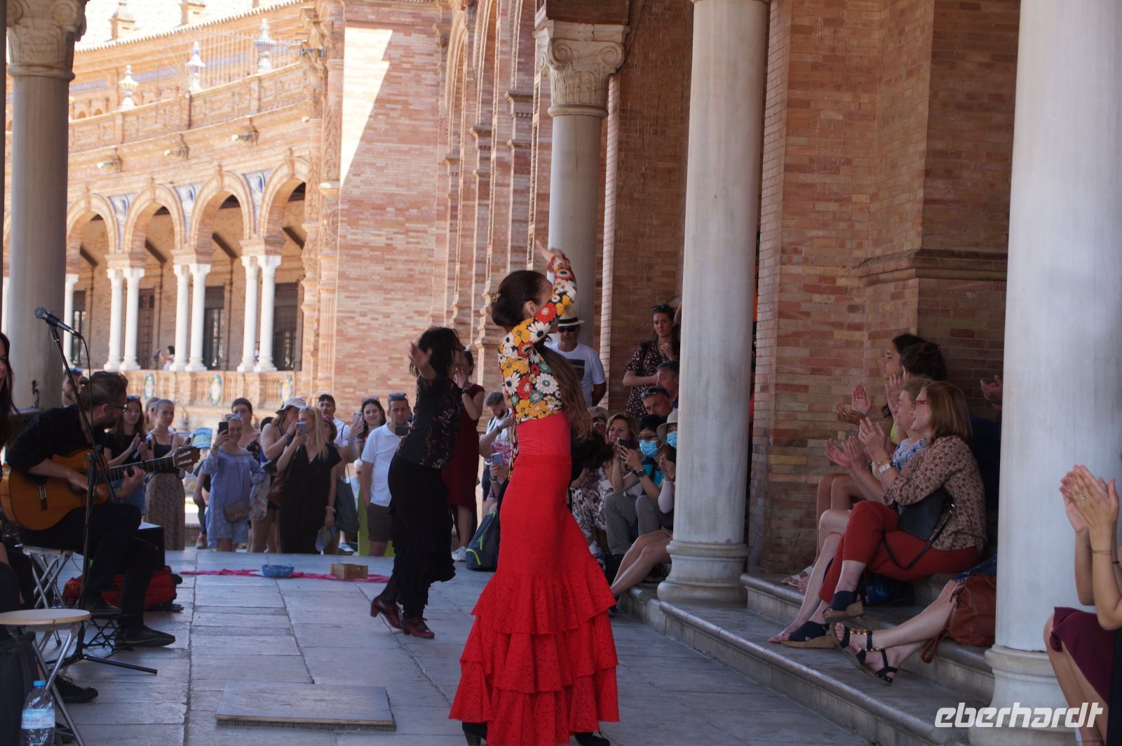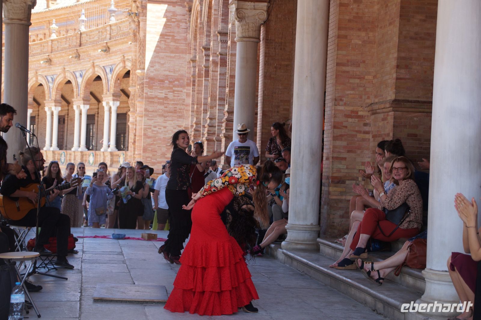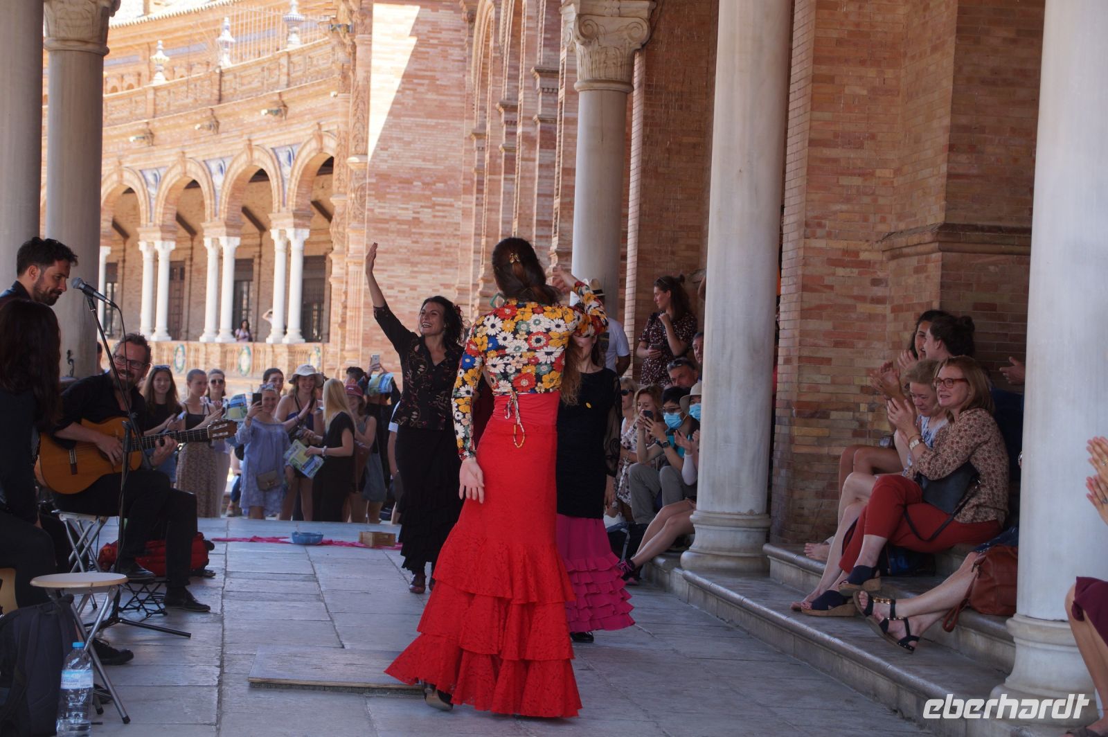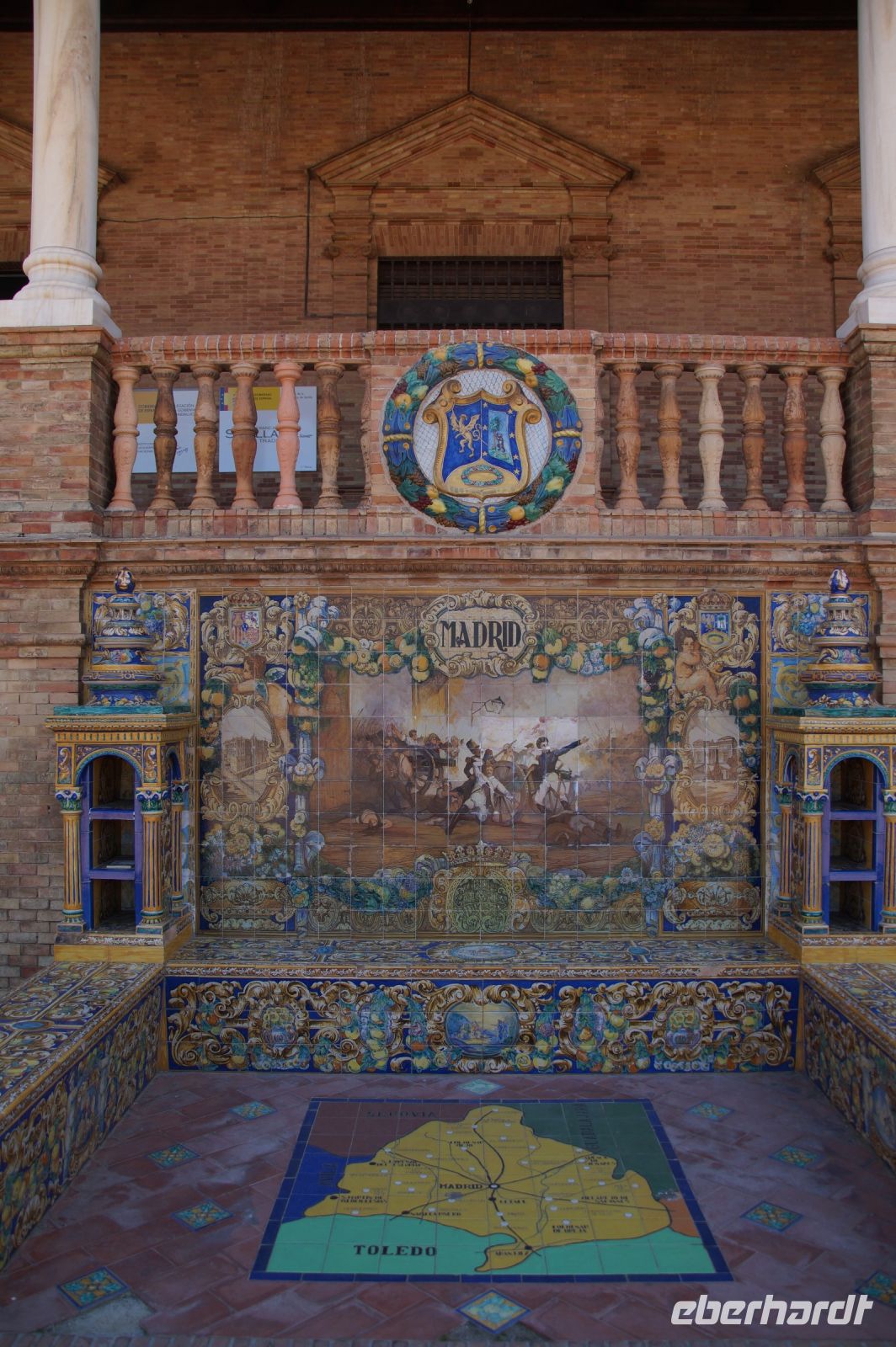 Hier ließen wir uns zunächst an der Plaza de España absetzen, überquerten diese individuell und trafen uns zwischen Plaza de España und Parque de María Luisa. Von dort aus liefen wird gemeinsam in die Altstadt, um zunächst dem Kaffeedurst oder gar schon dem ersten Hüngerchen mit den geeigneten Maßnahmen zu begegnen. Dann trafen wir uns gegenüber der Real Maestranza, der Stierkampfare... der Plaza de Toros von Sevilla mit unserem Bus und auch unserer Stadtführerin mit dem zu Sevilla seit Bizet so gut passenden Namen Carmen.